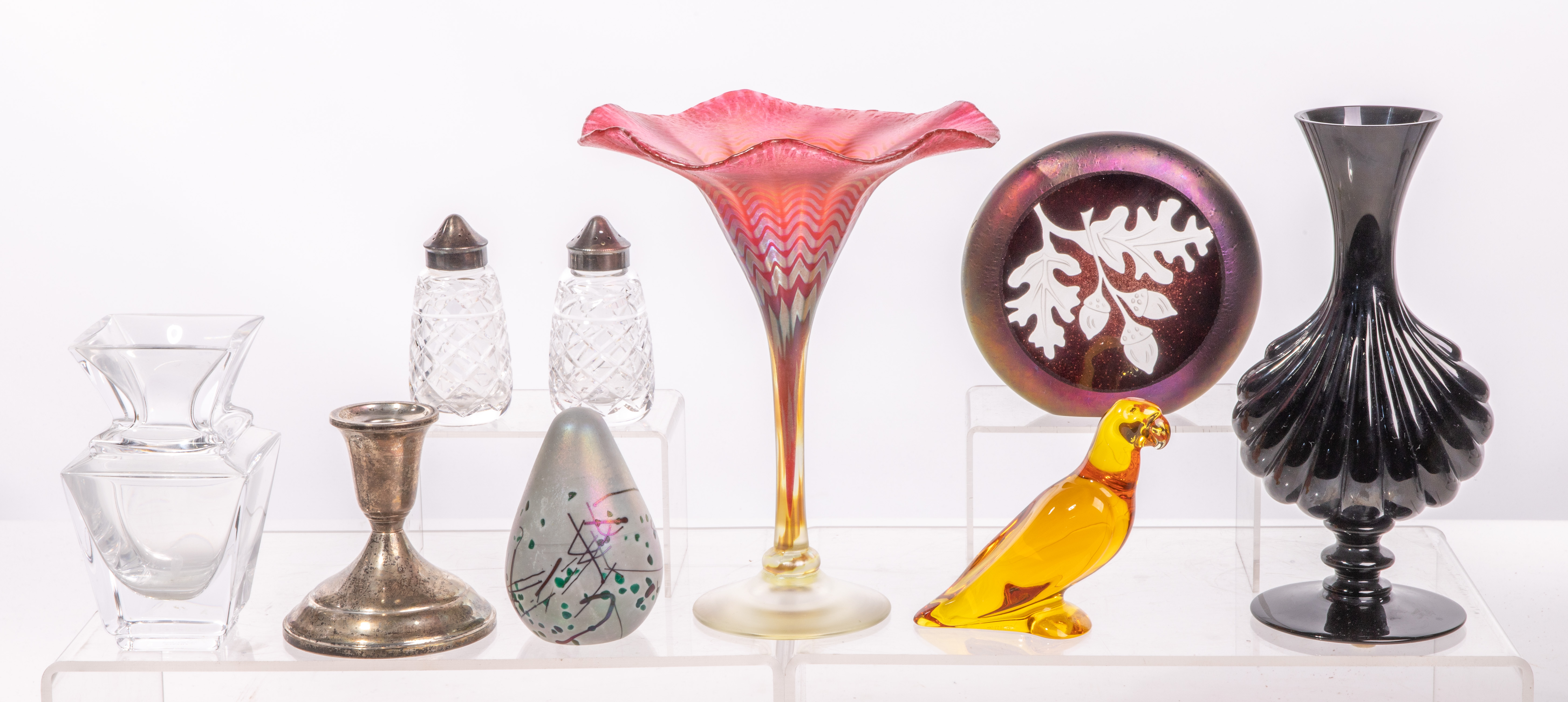 (8) items including a black shell form vase, a Sevres France clear vase and an amber bird (all stamped Baccarat), a salt and pepper shaker set (stamped Waterford) as well as an egg shape paperweight, an oak leaf paperweight, a pulled iridescent feather compote and a silver candleholder (marked Towle and ‘sterling’)