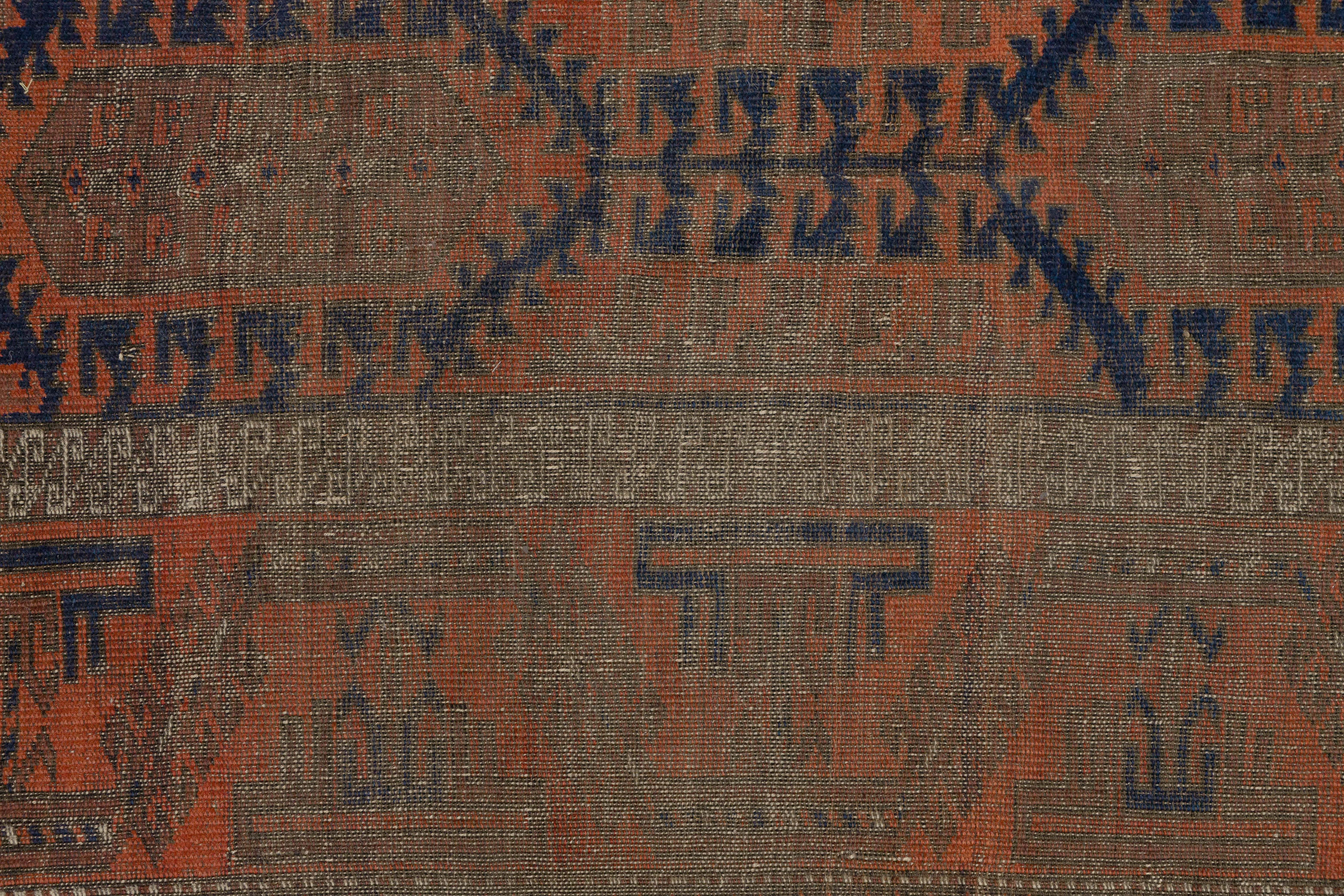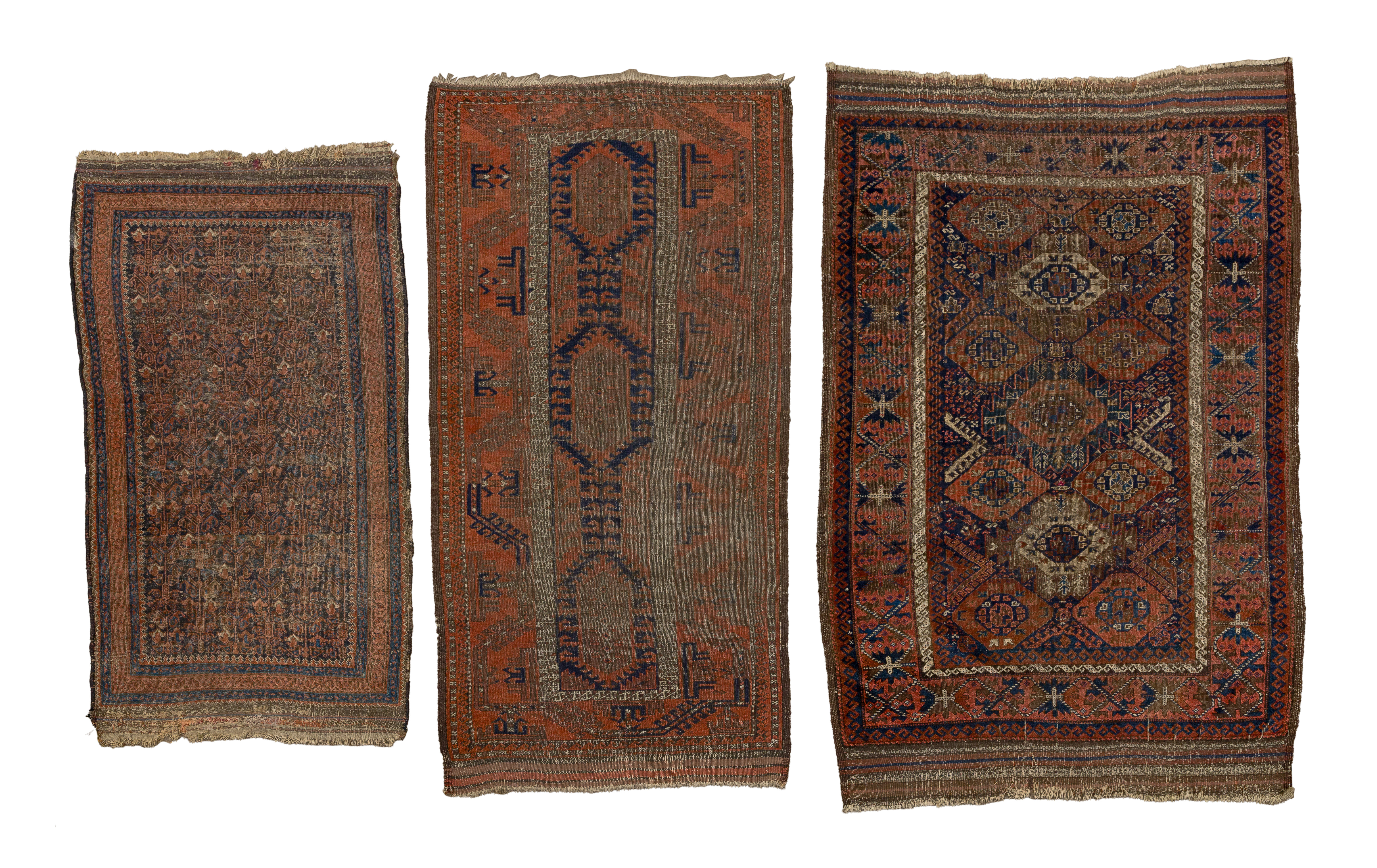 (3) items including a hand woven having an abstract geometric motif in hues of blue and cream on a rust field, fringe, a hand woven having an abstract geometric motif in hues of blue and cream on a rust field, fringe (76-inches by 37.5-inches without fringe) and a hand woven having an abstract geometric motif in hues of blue and cream on a rust field, fringe (60-inches by 33.5-inches without fringe)