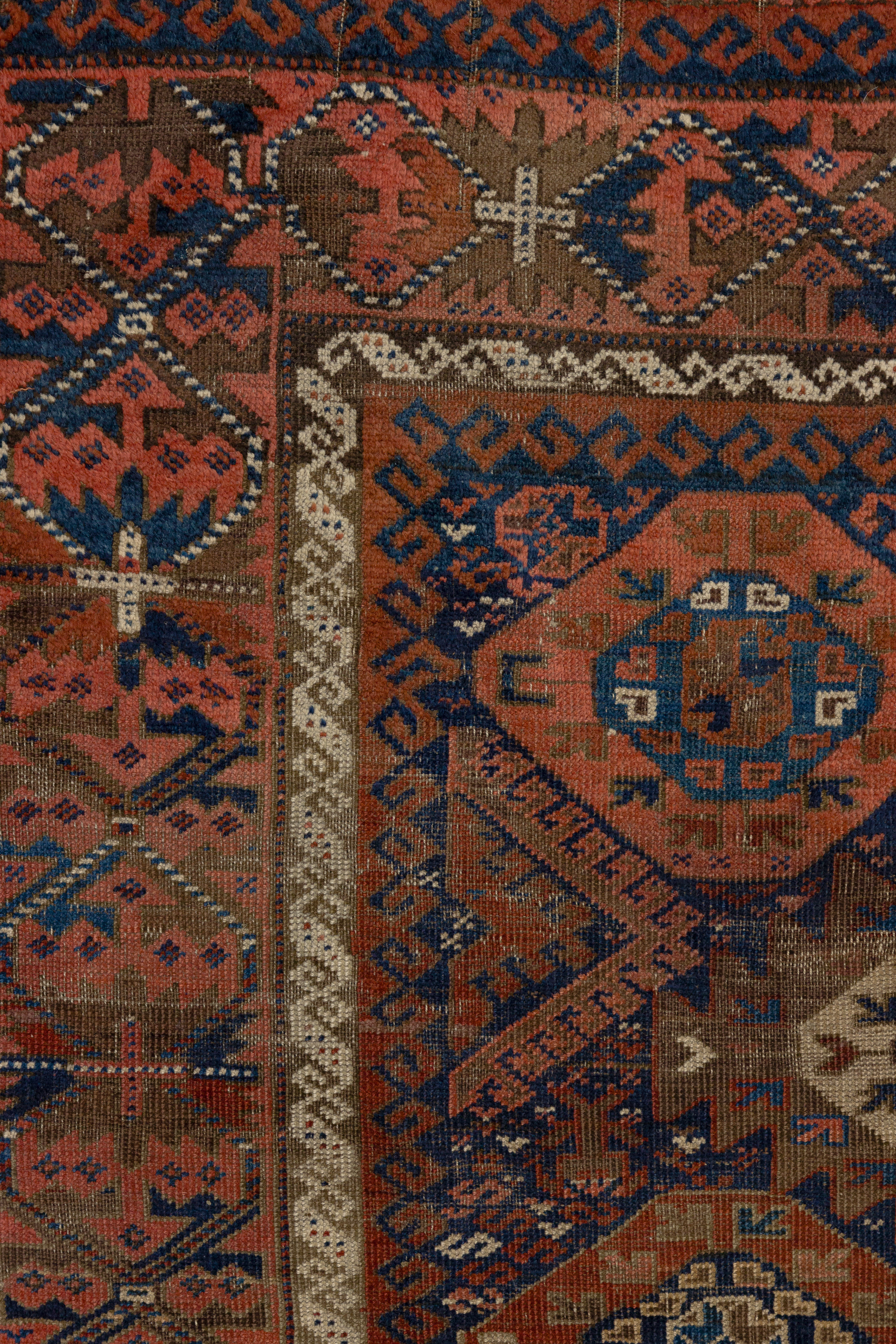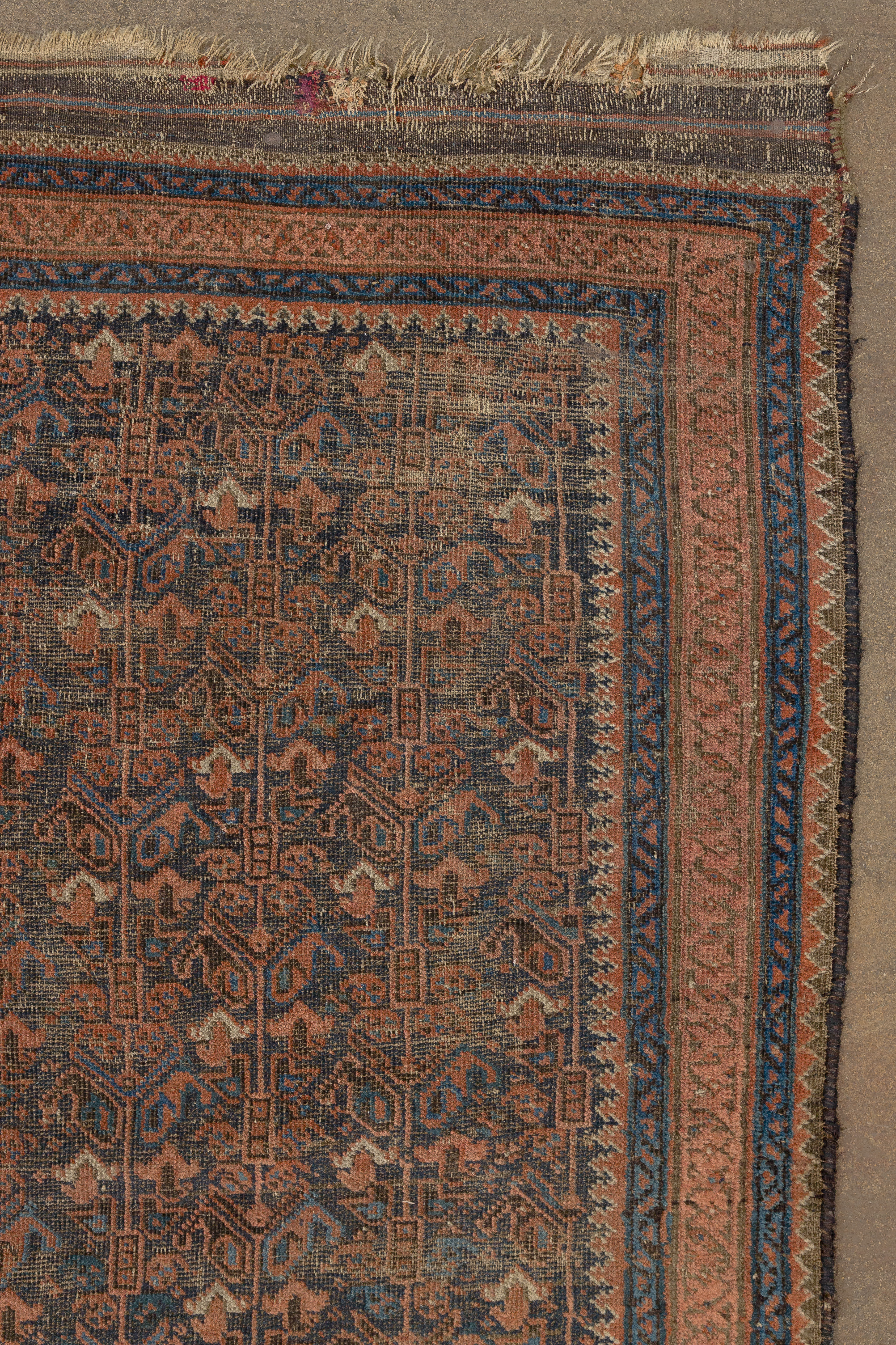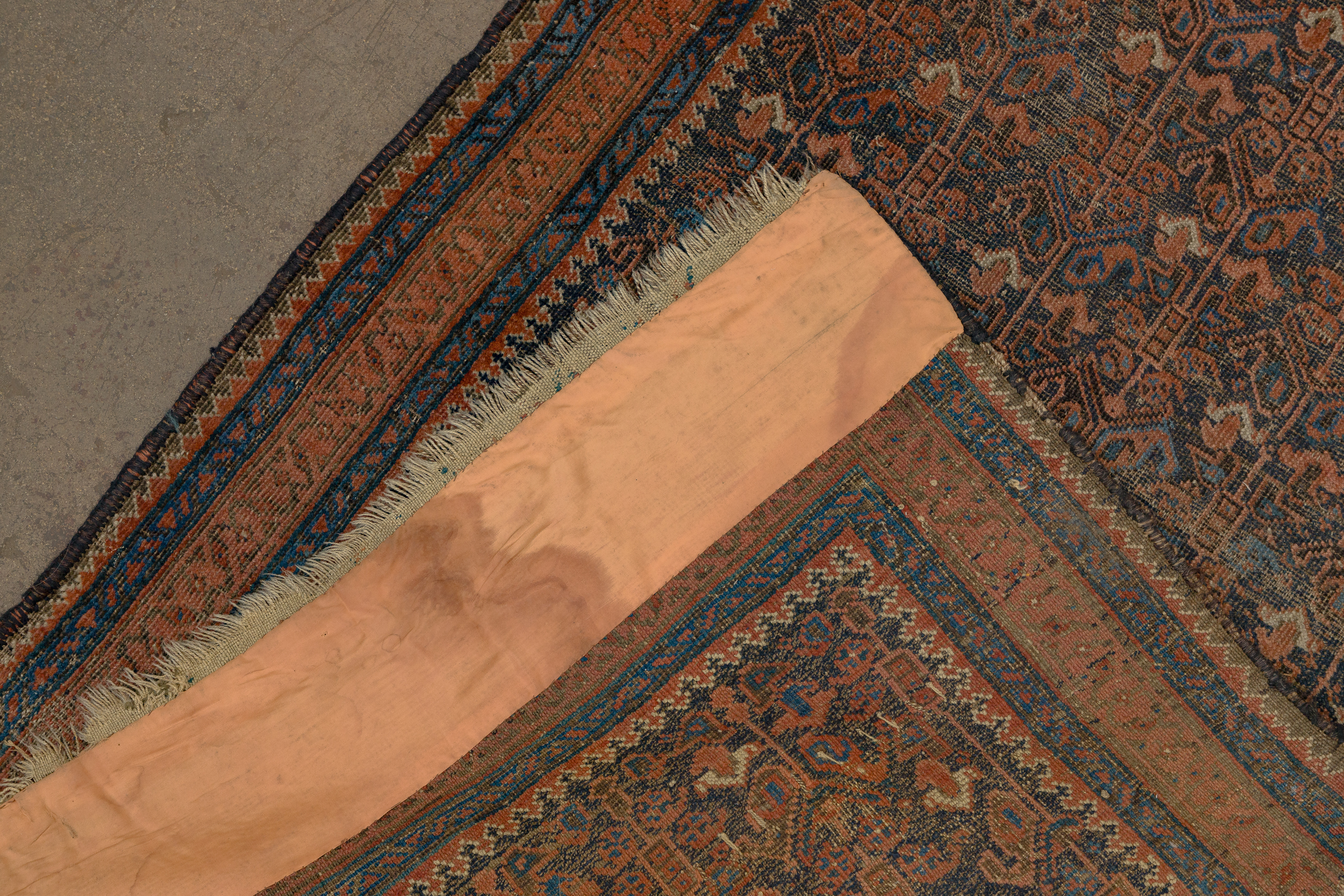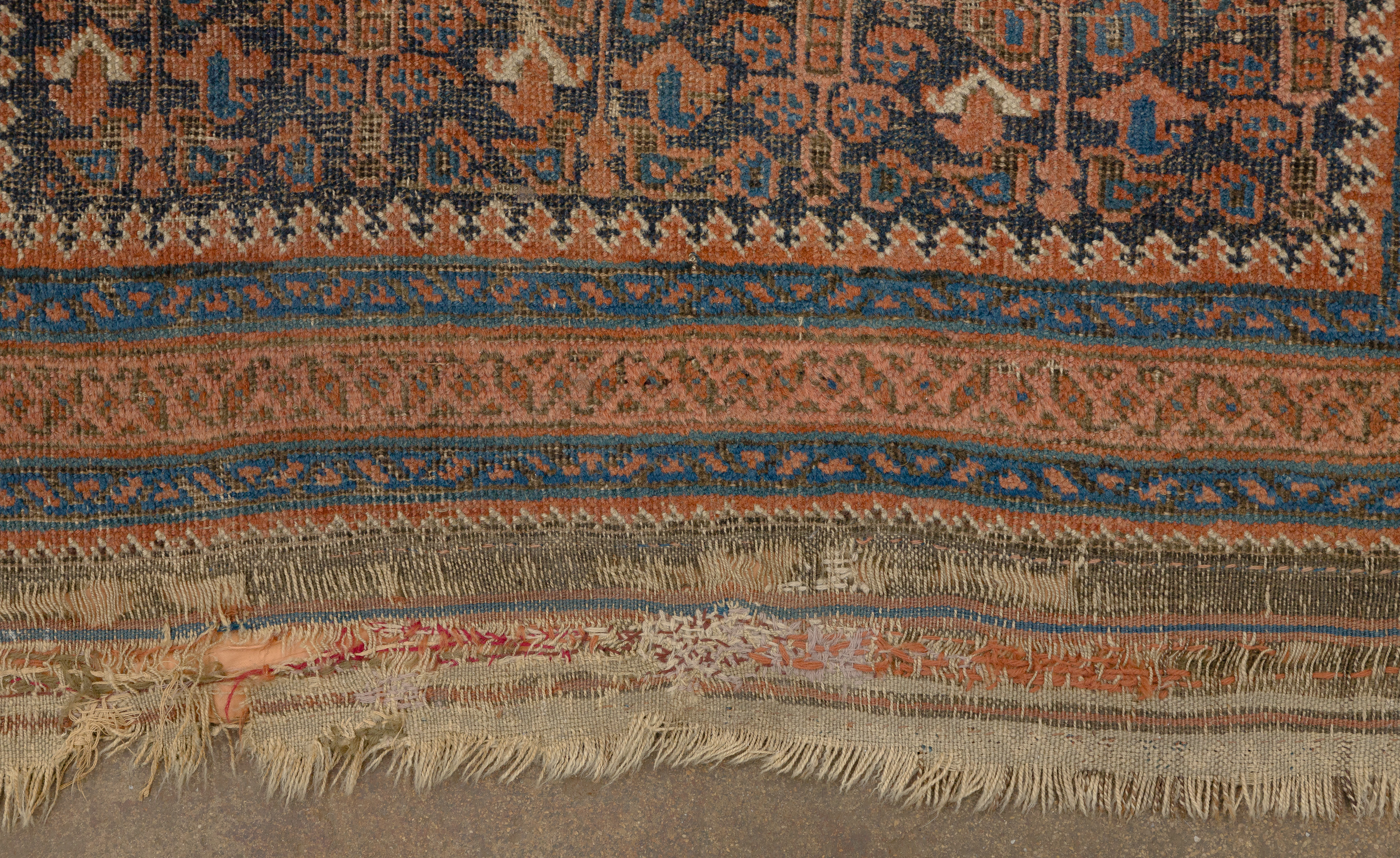 Condition: overall heavy wear consistent with normal use, heavy wear patterns, fading staining, fraying edges, one end appearing to be cut short and fringe damage