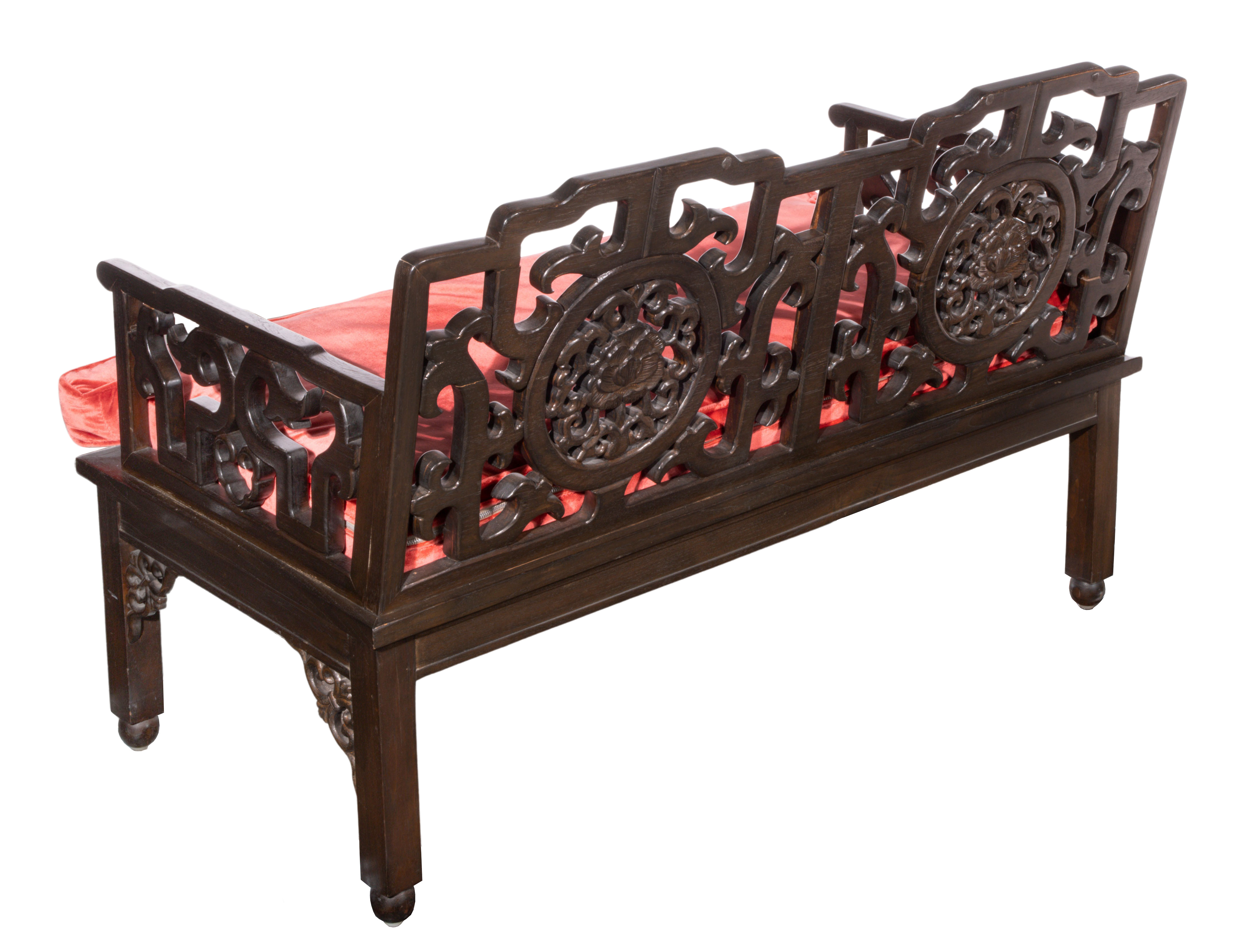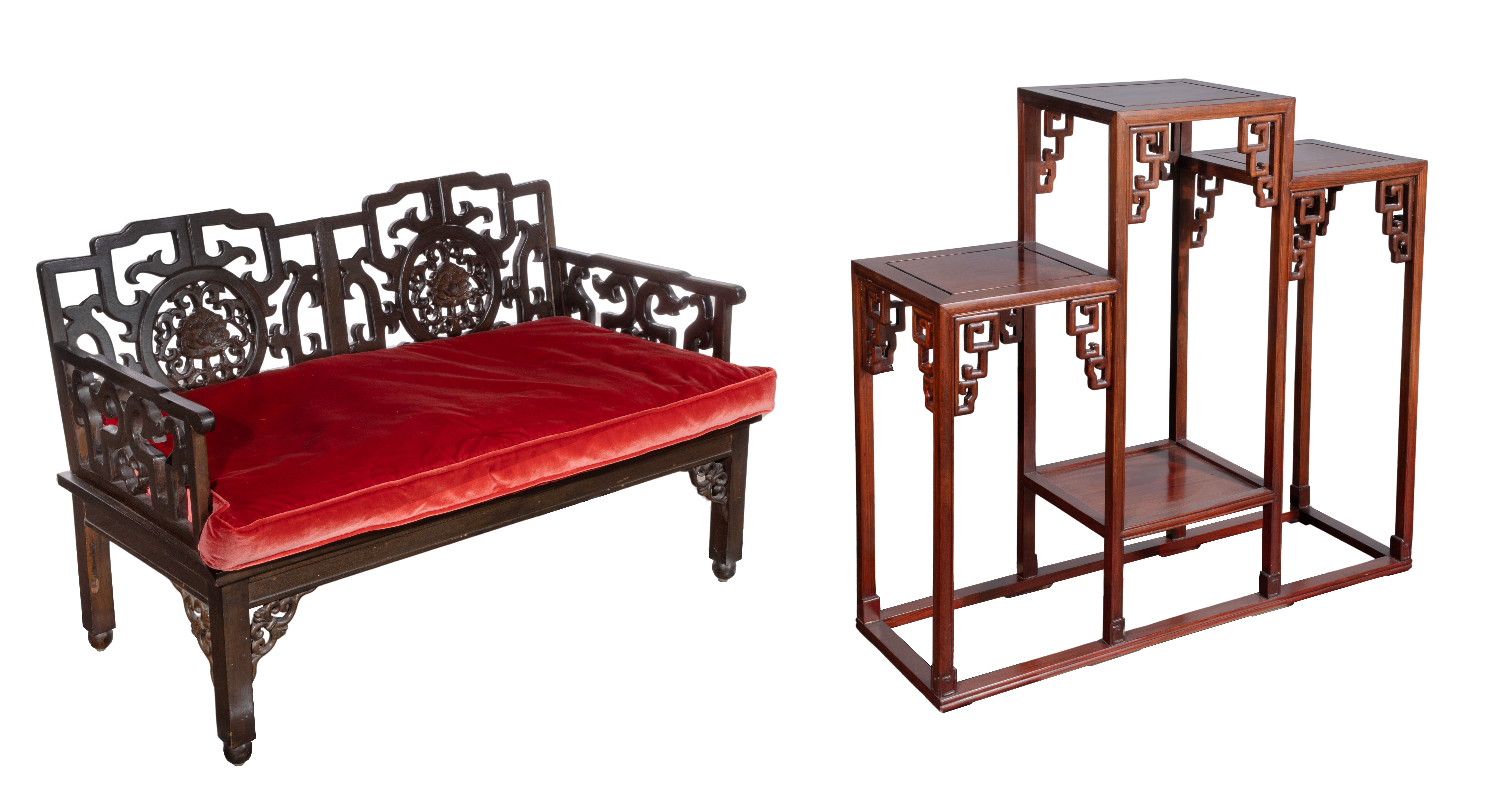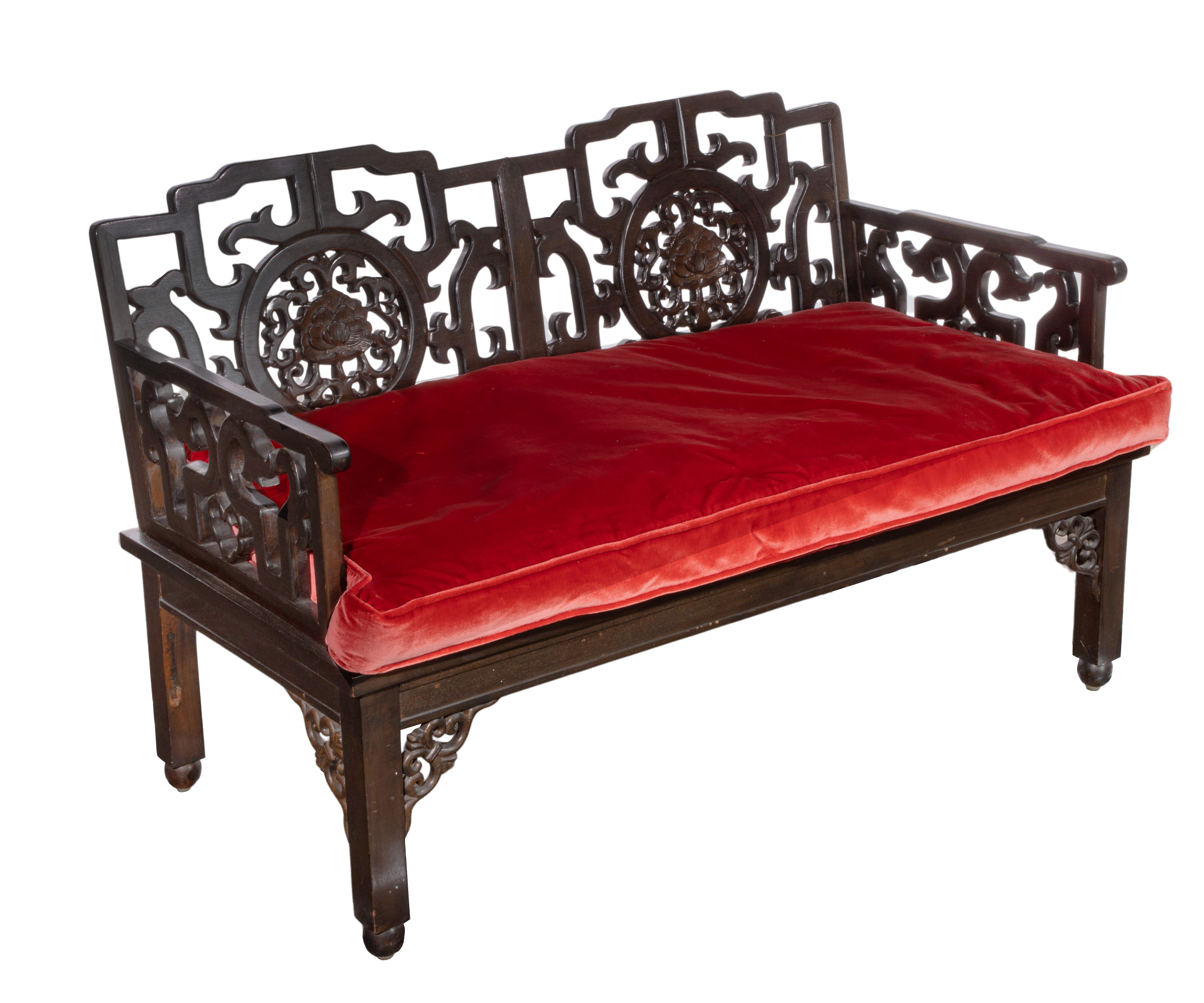 (2) items including a bench / settee having scroll-carved arms and back, the back having two floral motif medallions, panel seat having fitted red velvet upholstered pad on square legs having carved corner brackets and a multi-level stand having carved bracket supports to frame and paneled surfaces