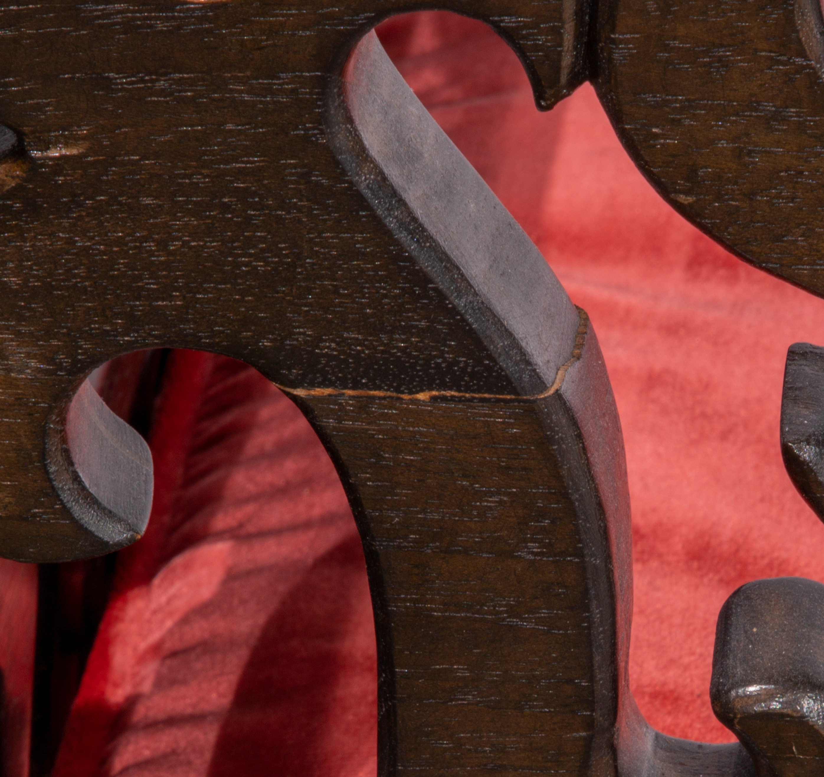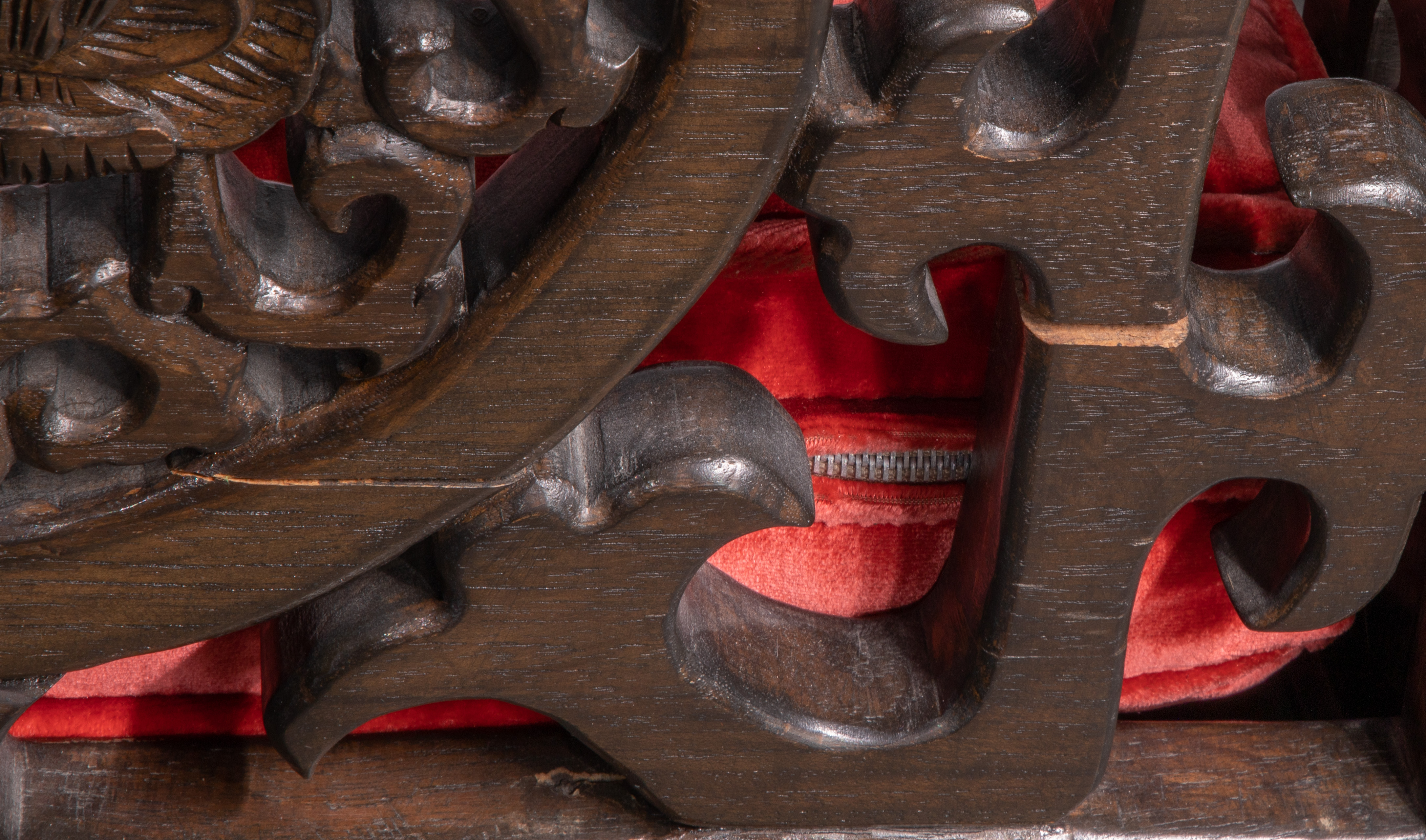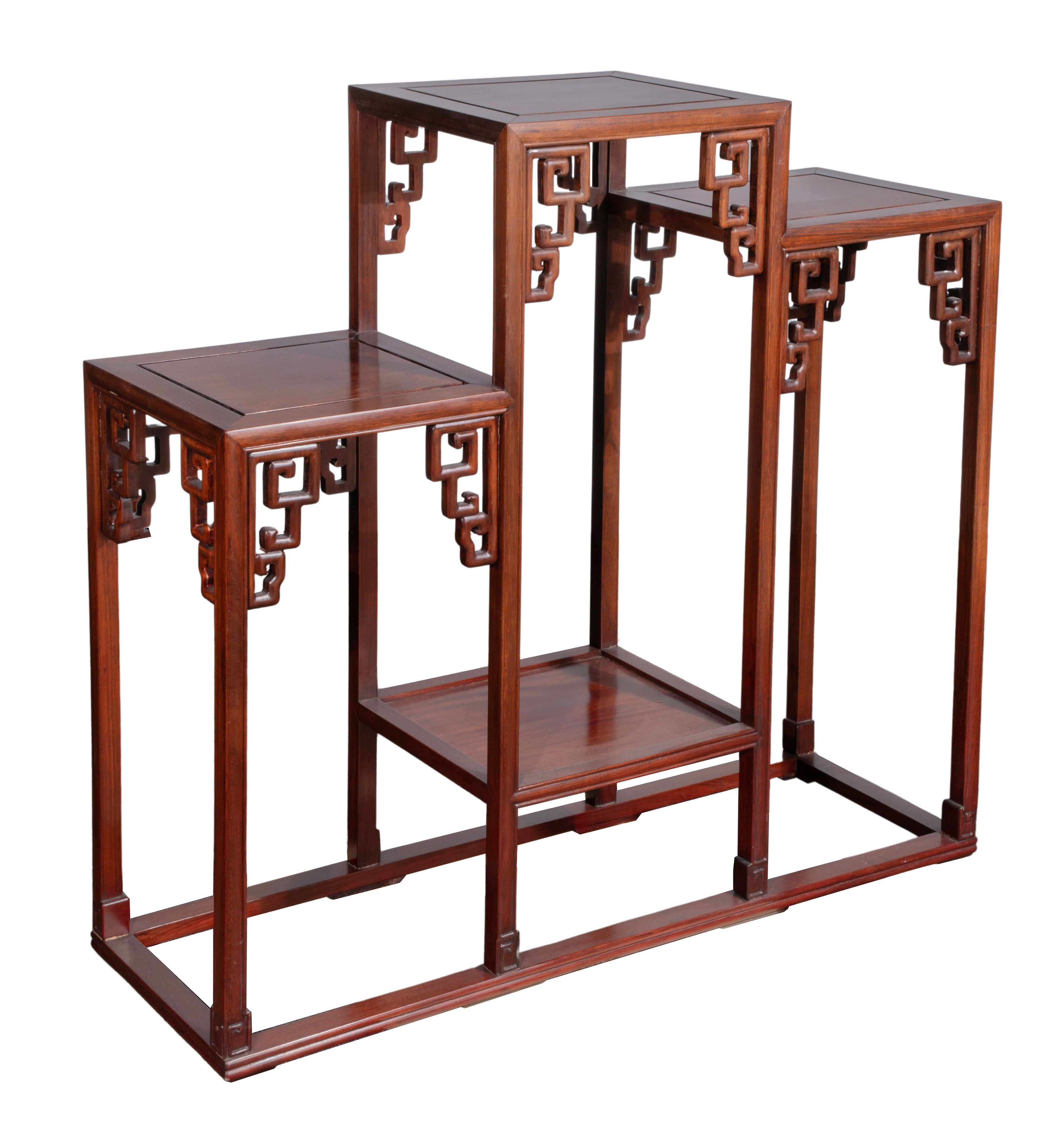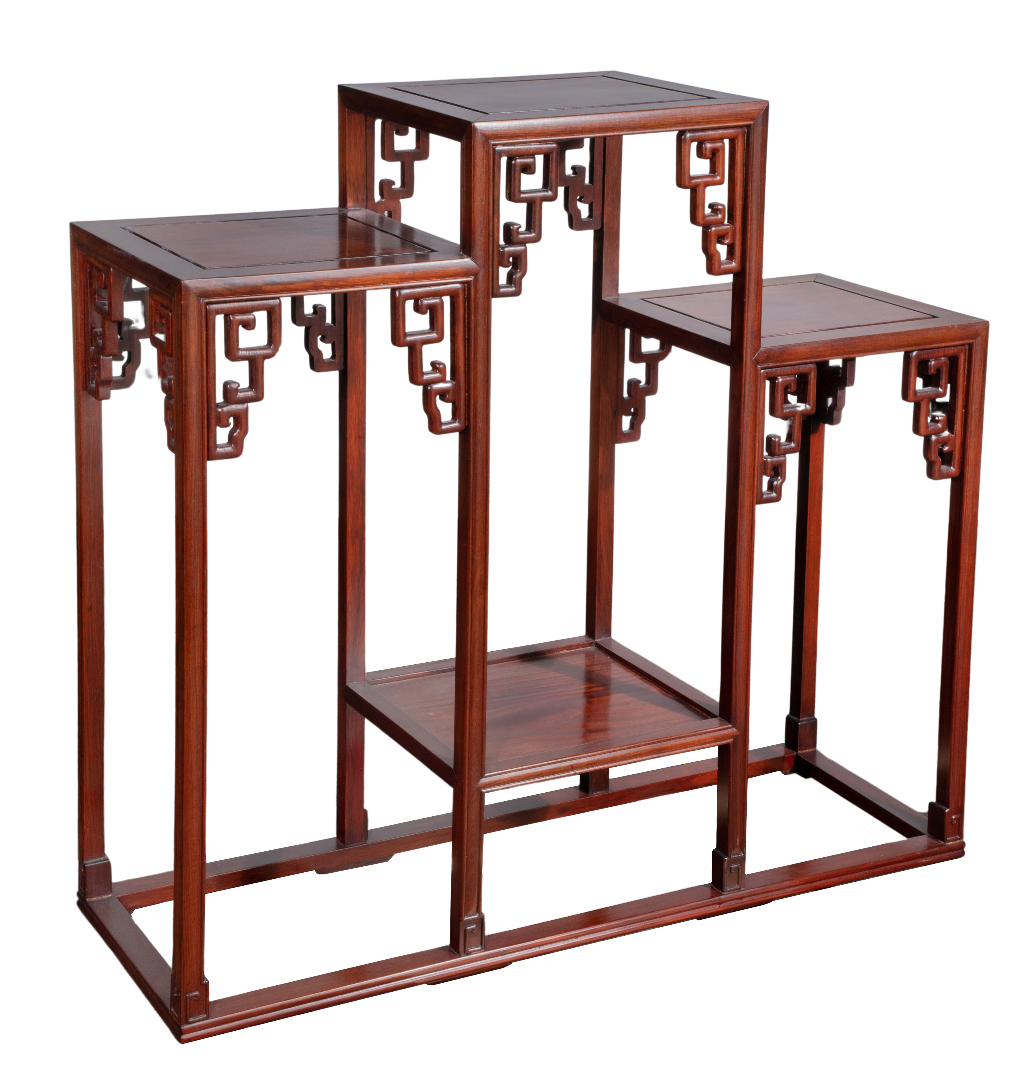 (2) items including a bench / settee having scroll-carved arms and back, the back having two floral motif medallions, panel seat having fitted red velvet upholstered pad on square legs having carved corner brackets and a multi-level stand having carved bracket supports to frame and paneled surfaces