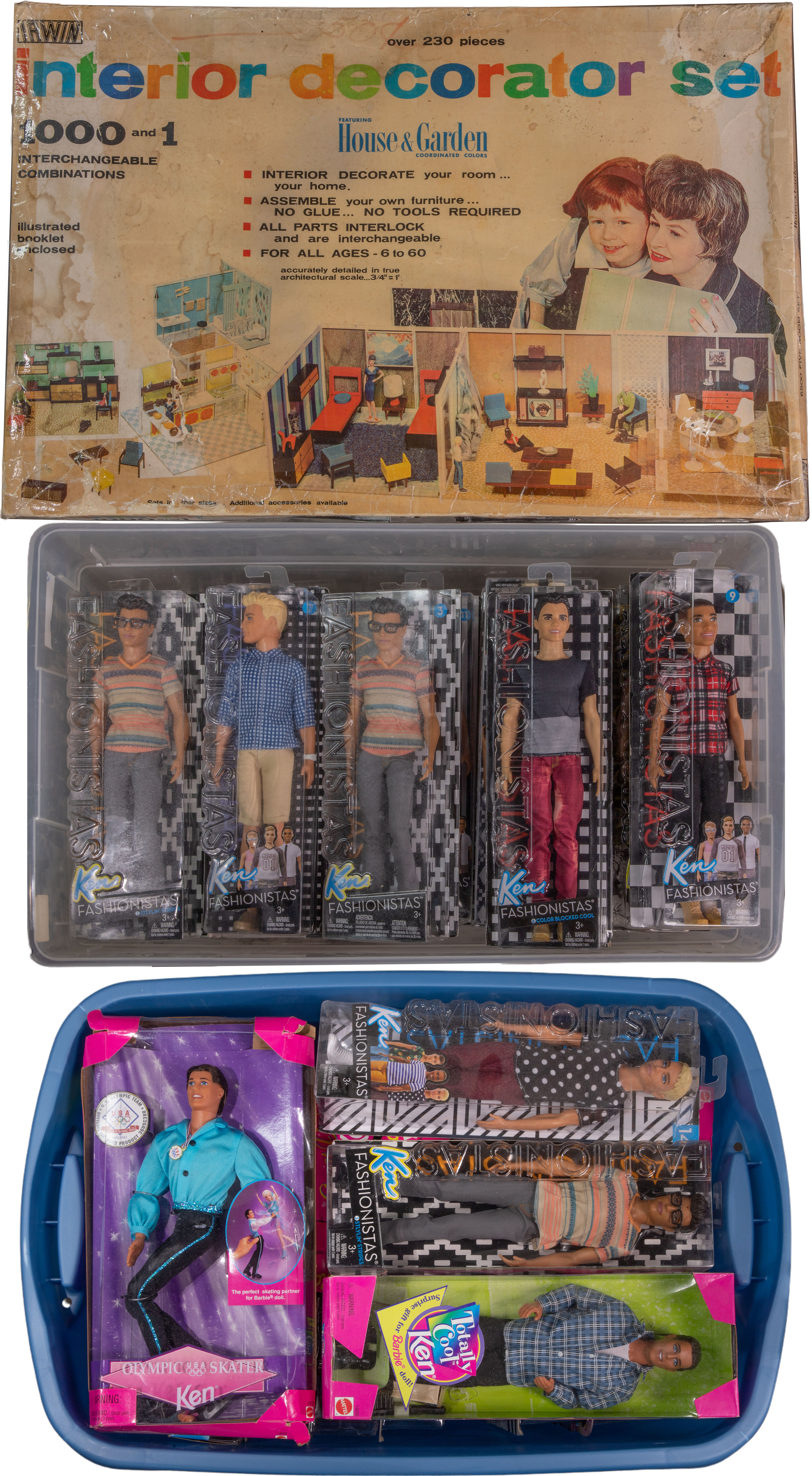Over (45) Mattel Ken toy doll figurines, including original packaging; together with over (25) Archie series comic books plastic sleeves and an Irwin Interior Decorator set having original packaging