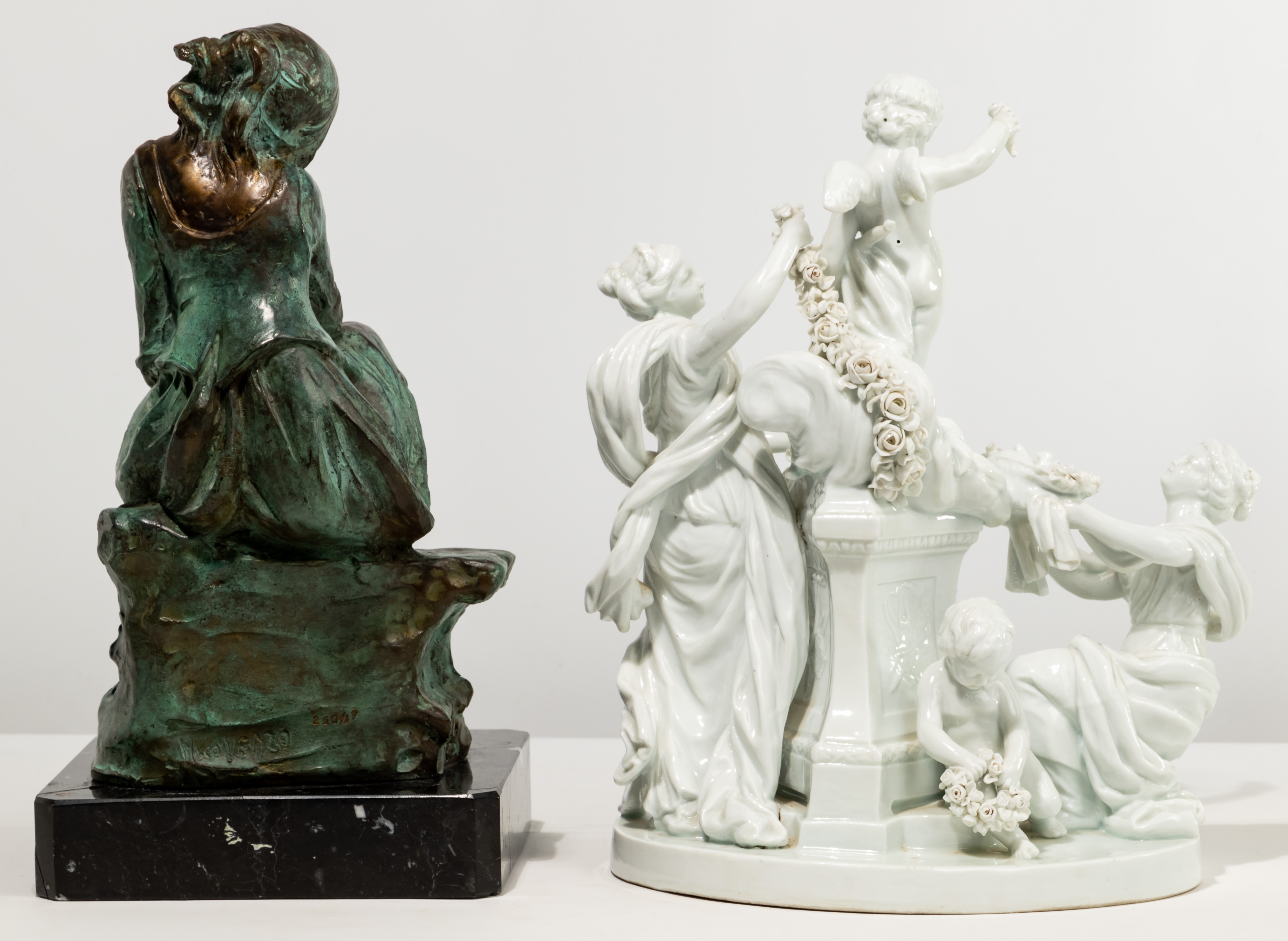 (2) items including Nico Venzo (Italian, b.1938) bronze, signed on back, #17/250 seated female figure having square black stone plinth; and white glazed allegorical scene having an elevated cupid with classically dressed female figures and a young child making garlands and presenting offerings