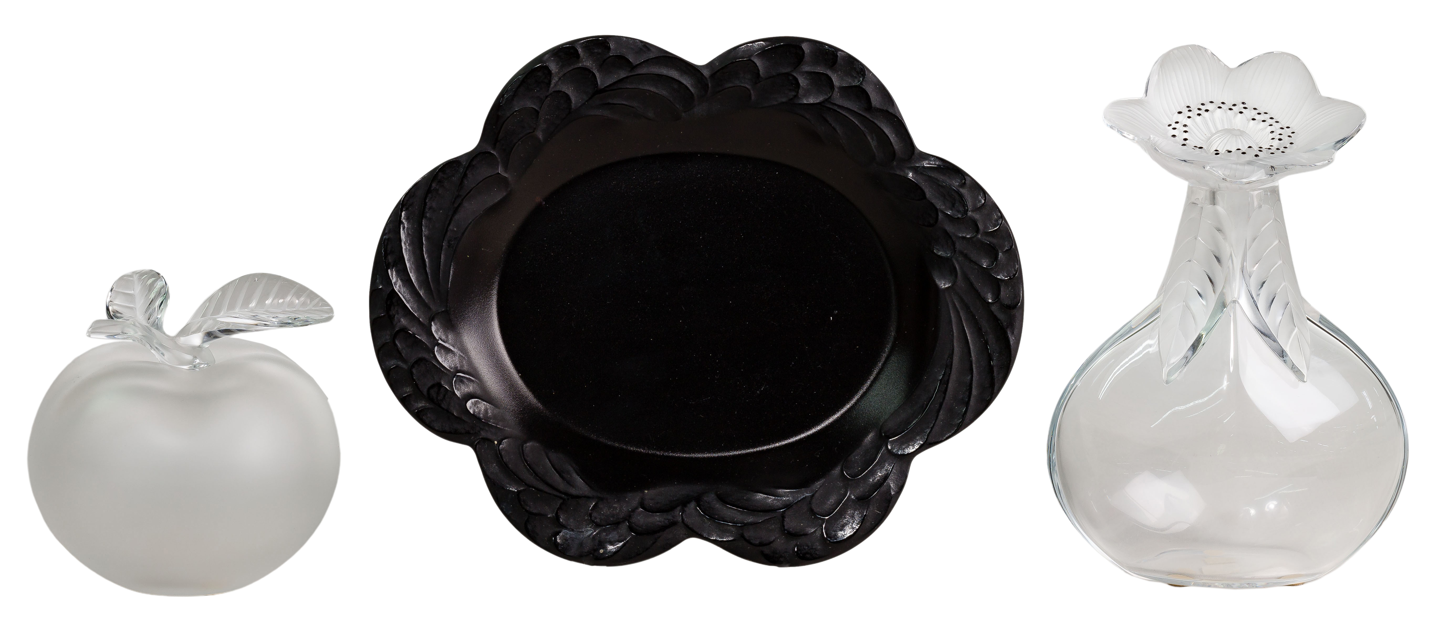 (4) items including ‘Osumi Leaf’ bud vase having box, ‘Grande Pomme’ perfume bottle, ‘Laure Noire’ matte black oval tray and ‘Anemone’ clear having black enamel flower paperweight; all having etched marks to undersides