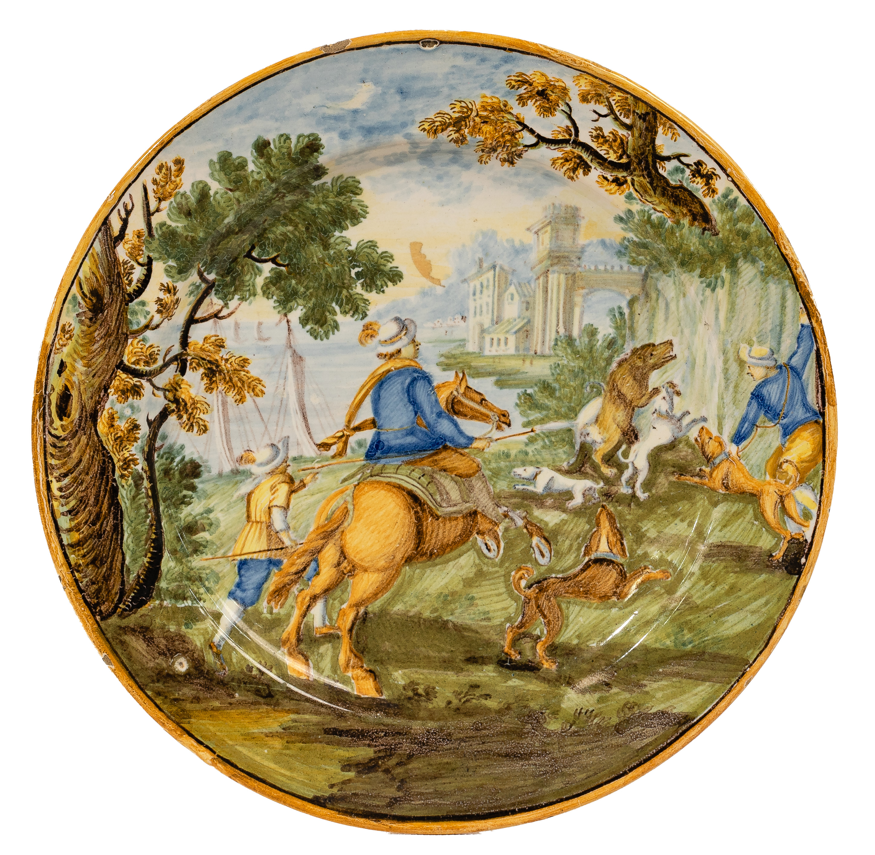 Hand painted, polychrome decorated depicting a boar hunting scene