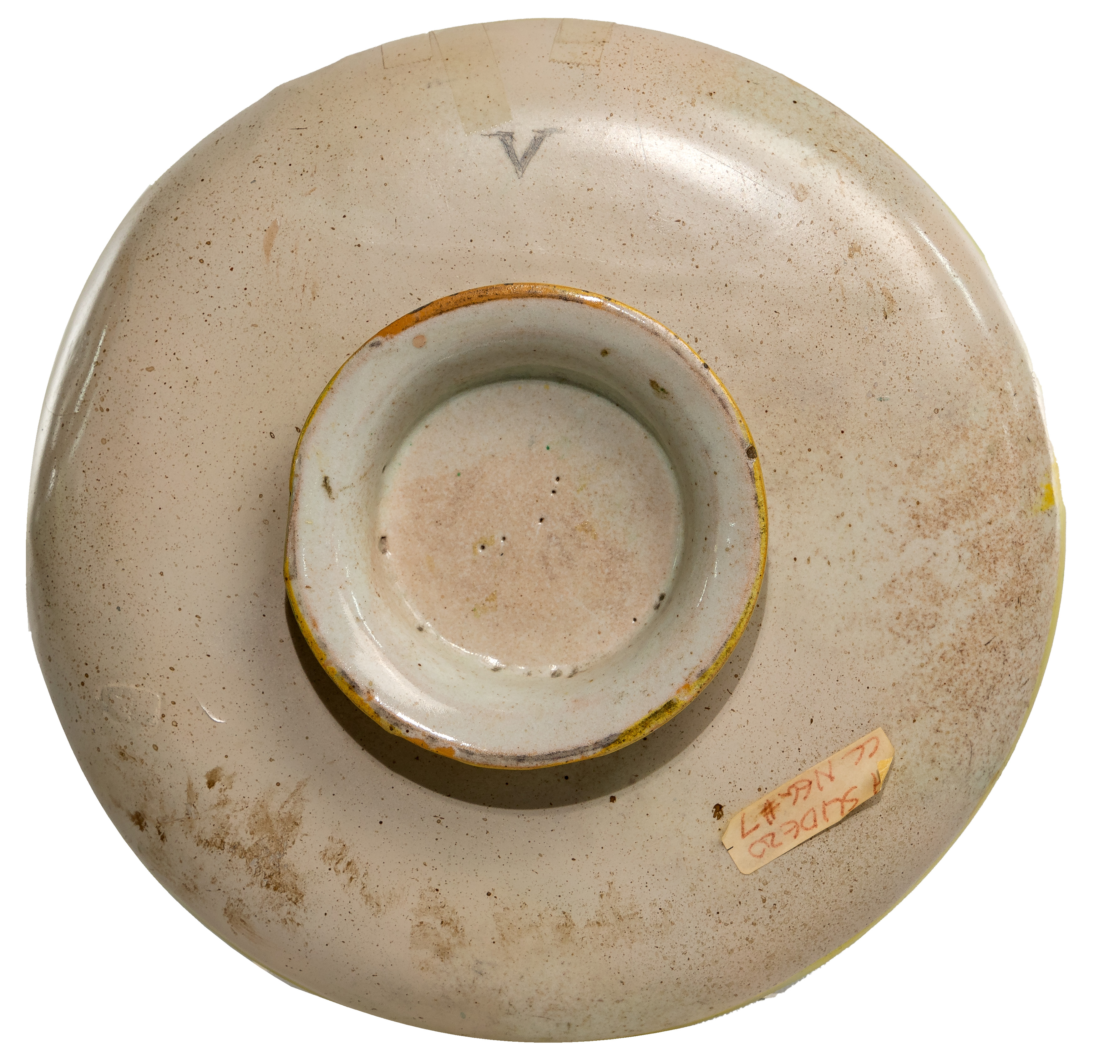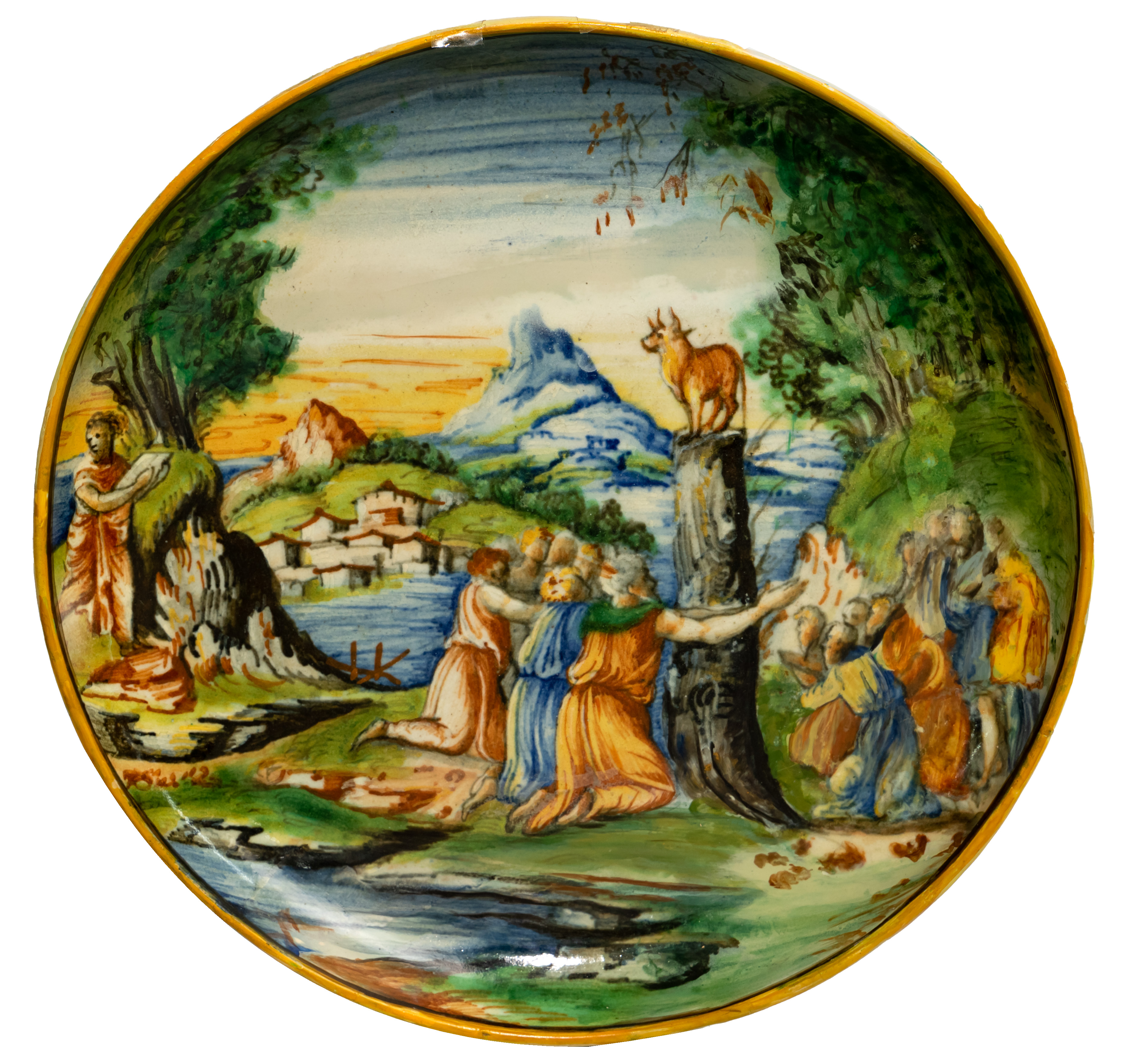 Having the initial ‘V’ painted on backside, polychrome painted depicting people worshiping the golden calf