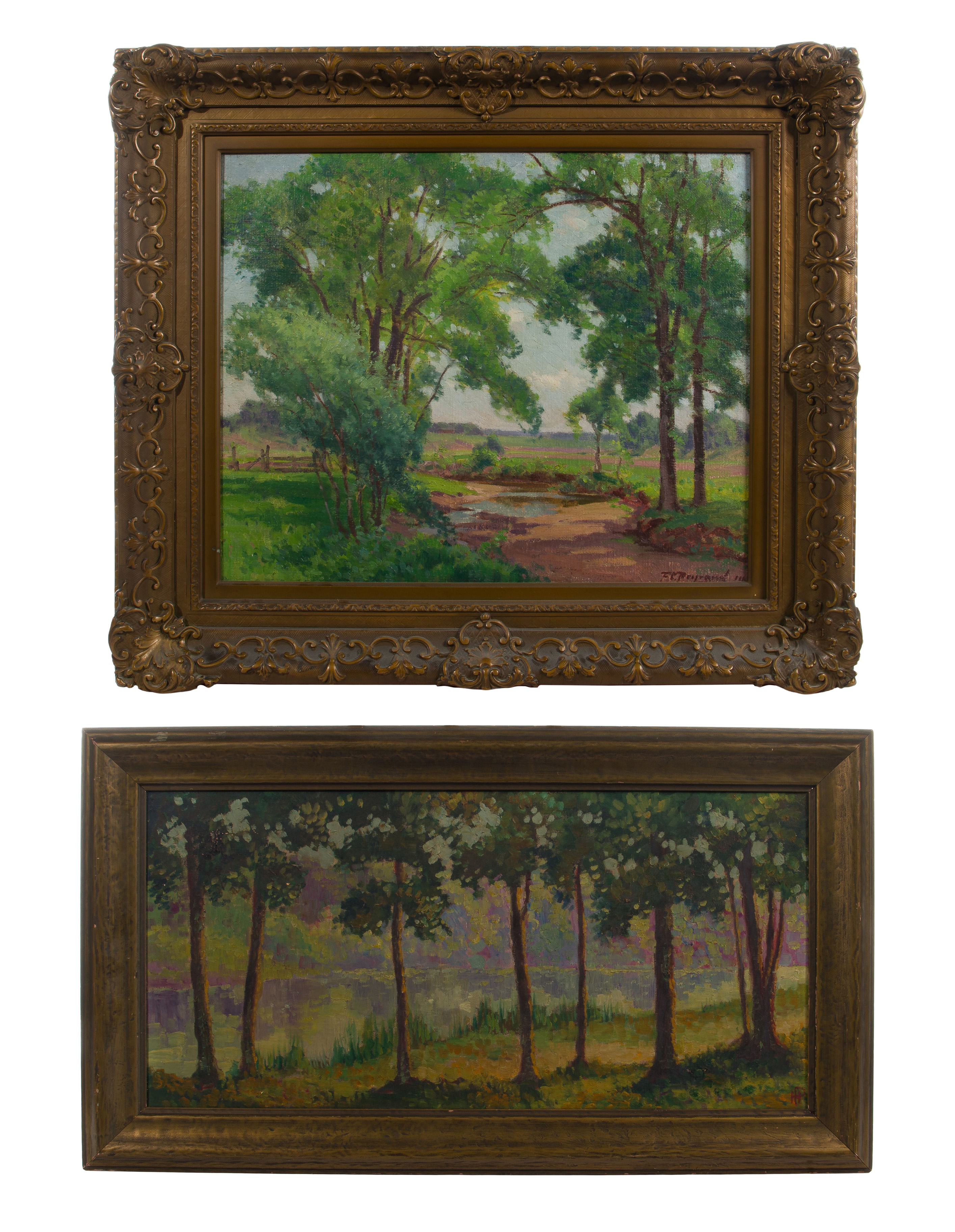 (2) total items including the Peyraud, undated, signed lower right, depicting a Midwestern landscape, having a bronze-tone gesso on carved wood frame; together with a landscape vista beyond a row of trees, monogramed ‘HP’ lower right, having a gold-tone wood frame