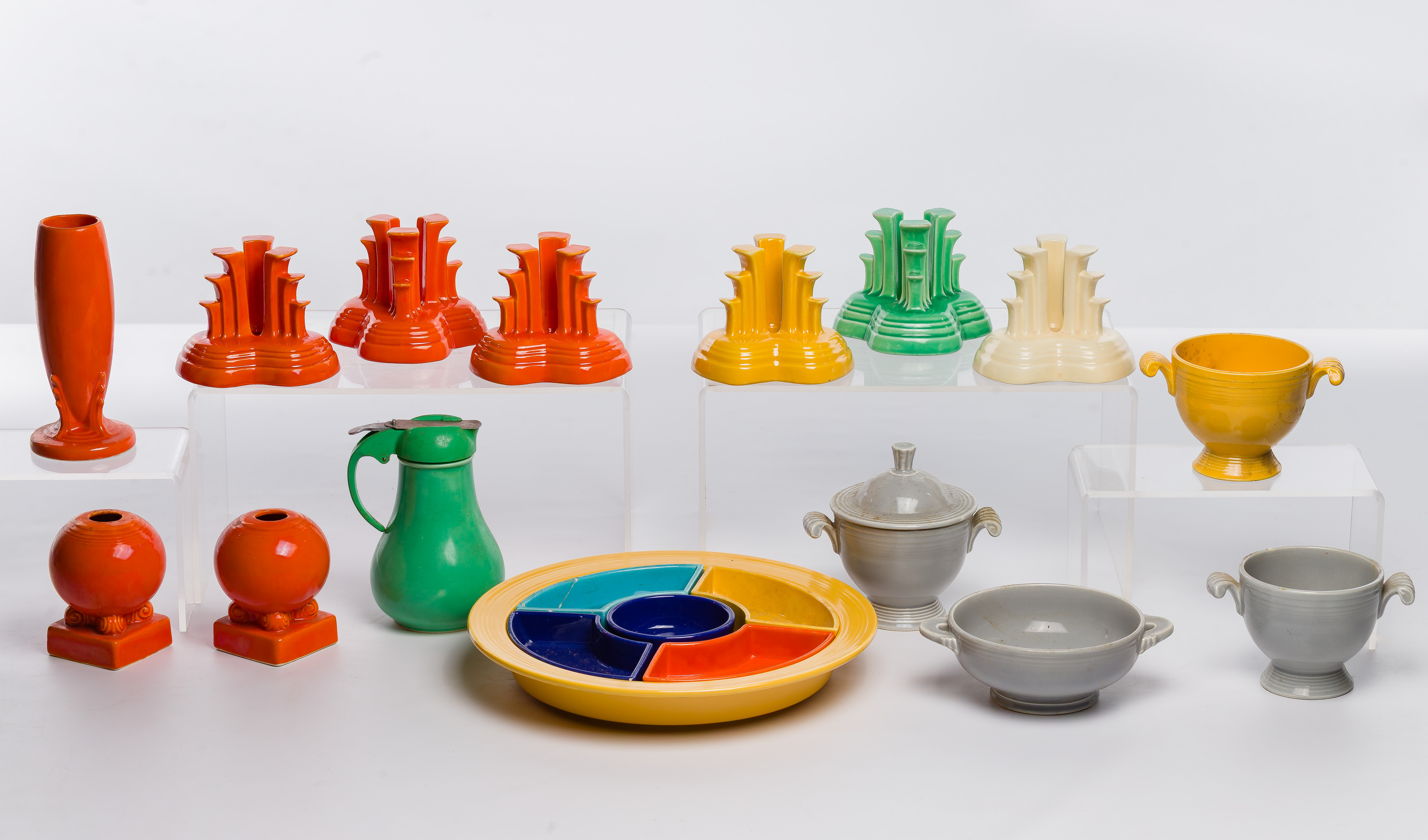 (15) items including a divided relish tray, (6) pyramid candleholders, a pair of bulb candle holders, a syrup dispenser, a vase, a cream soup bowl, a lidded sugar dish and (2) sugar bowls, all marked on underside, in various Fiesta colors