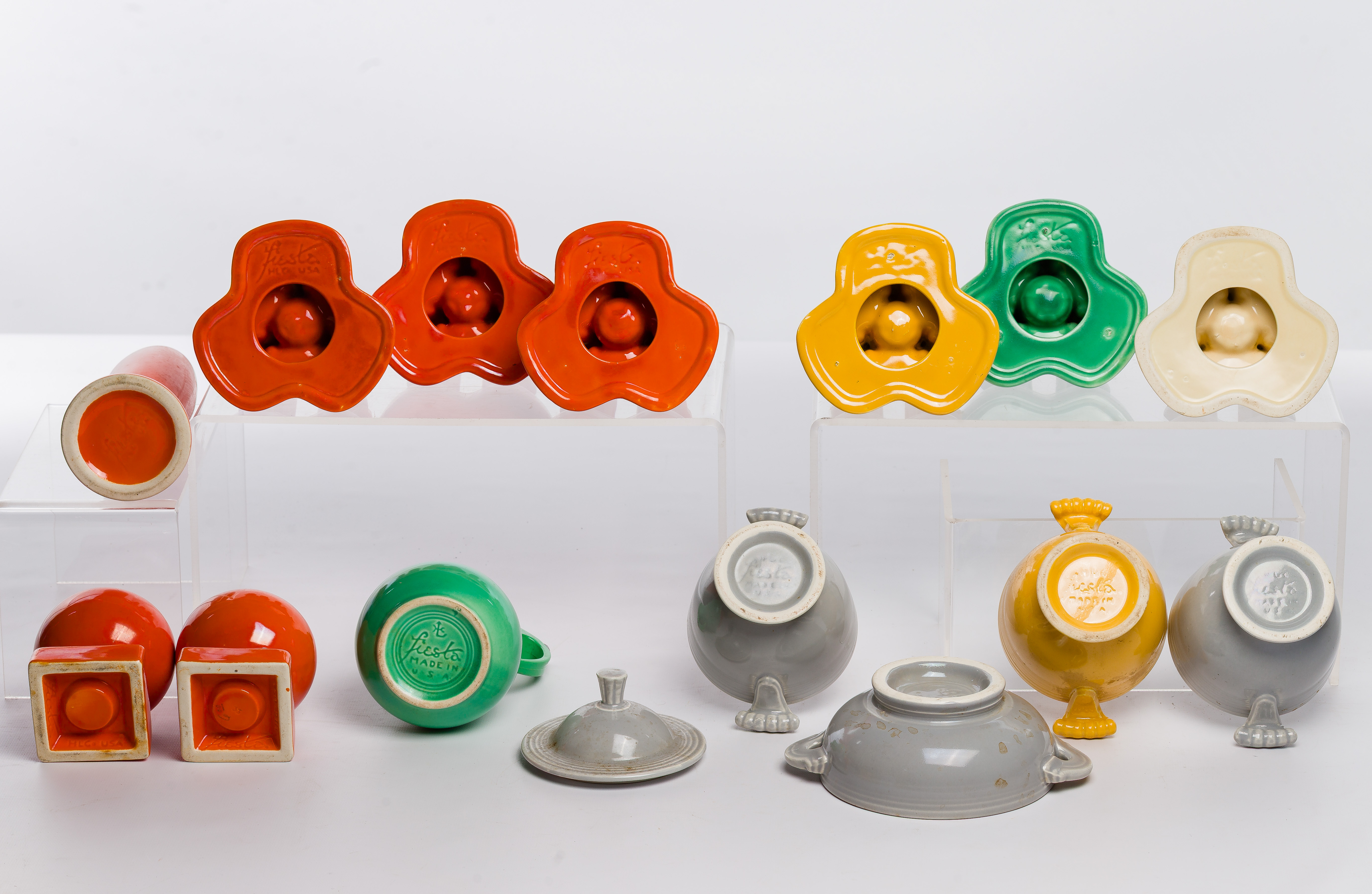 Condition: overall light wear consistent with normal use minor chips on edge of an orange pyramid, syrup dispenser lid does not open, a white dot of paint splatter on vase, a chip on upper edge of gray sugar bowl