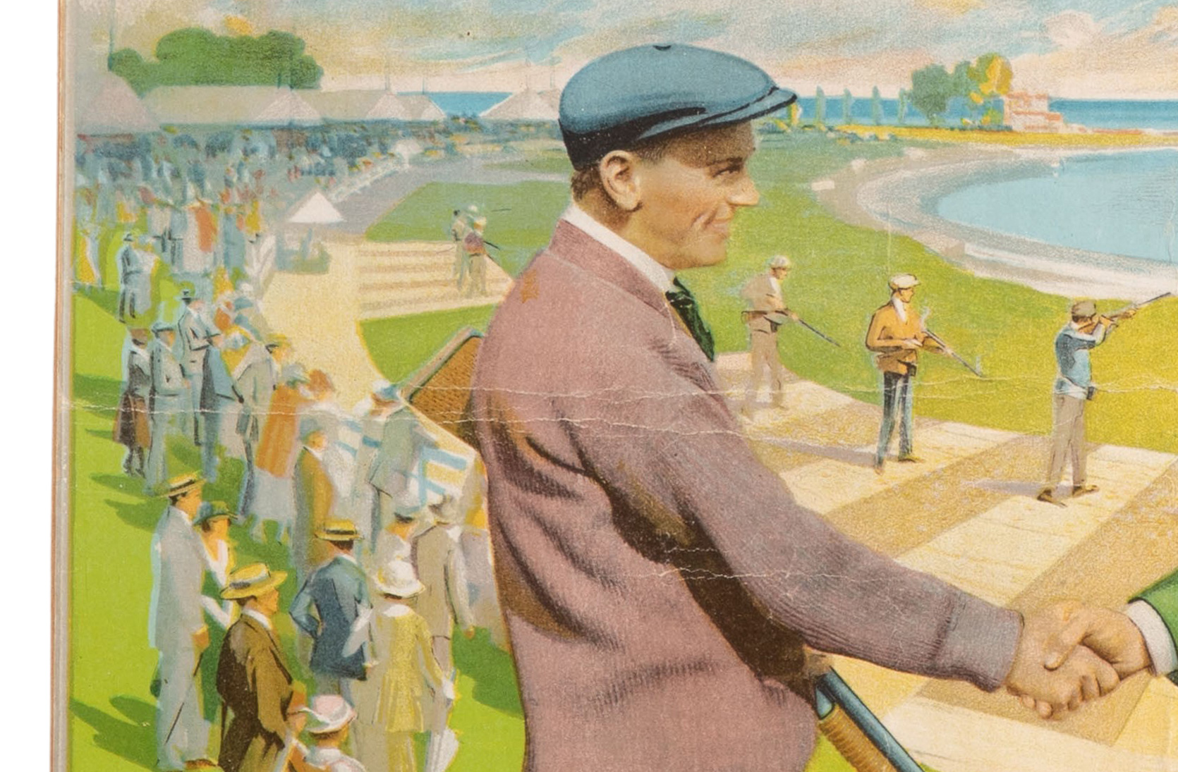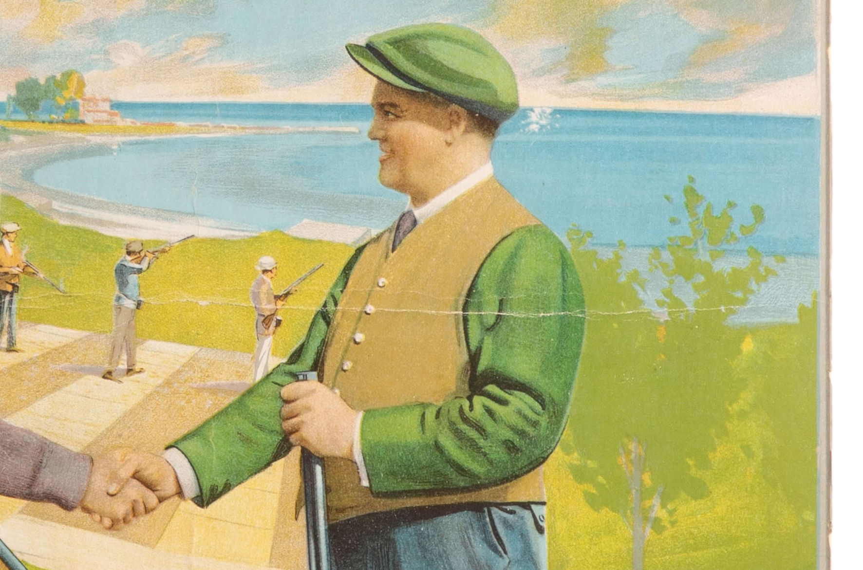 1918, depicting trapshooting Champions of America Frank Troech and Bart Lewis, full sheet displayed behind glass edge-clamped to plywood of same dimensions as sheet