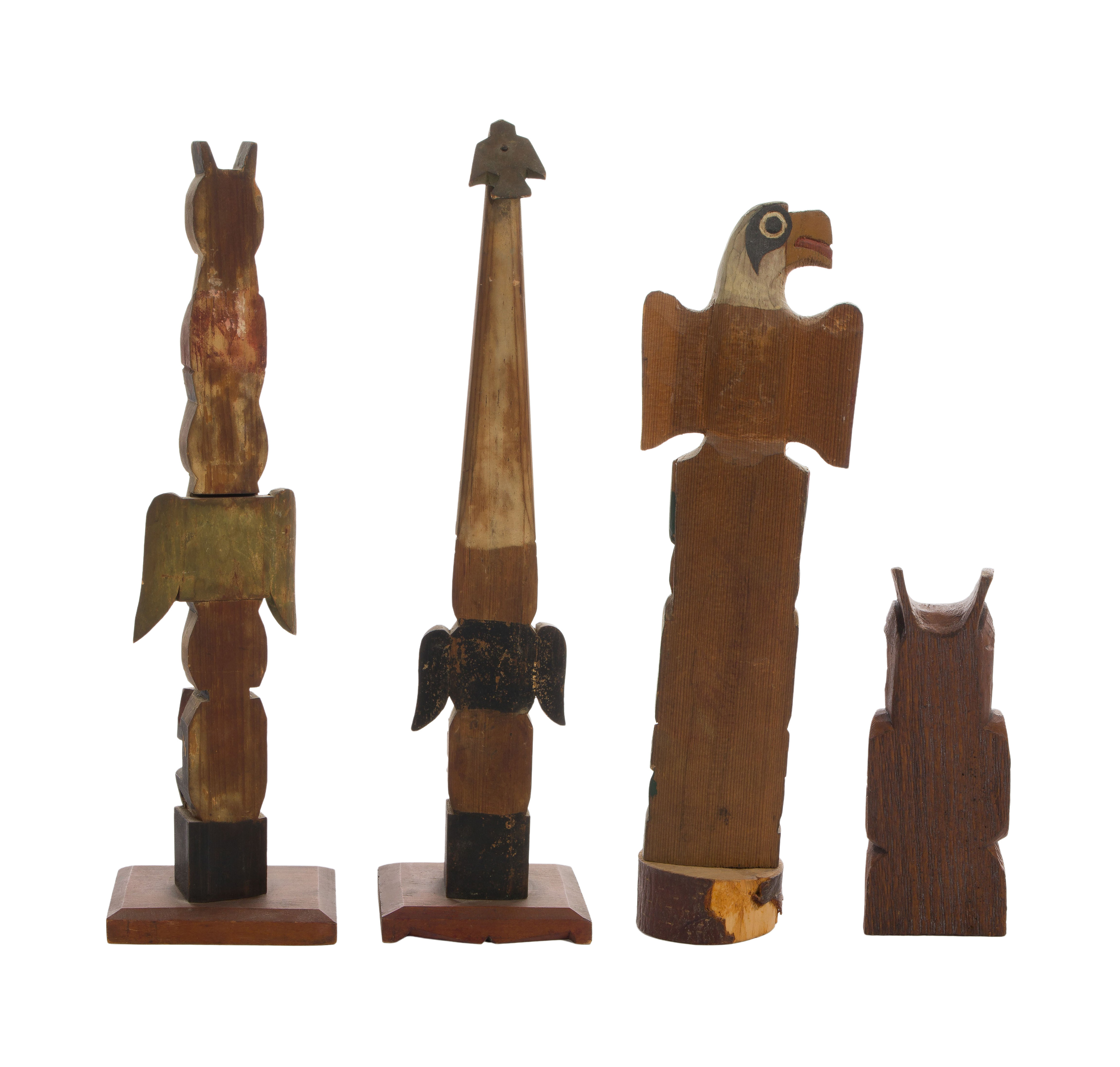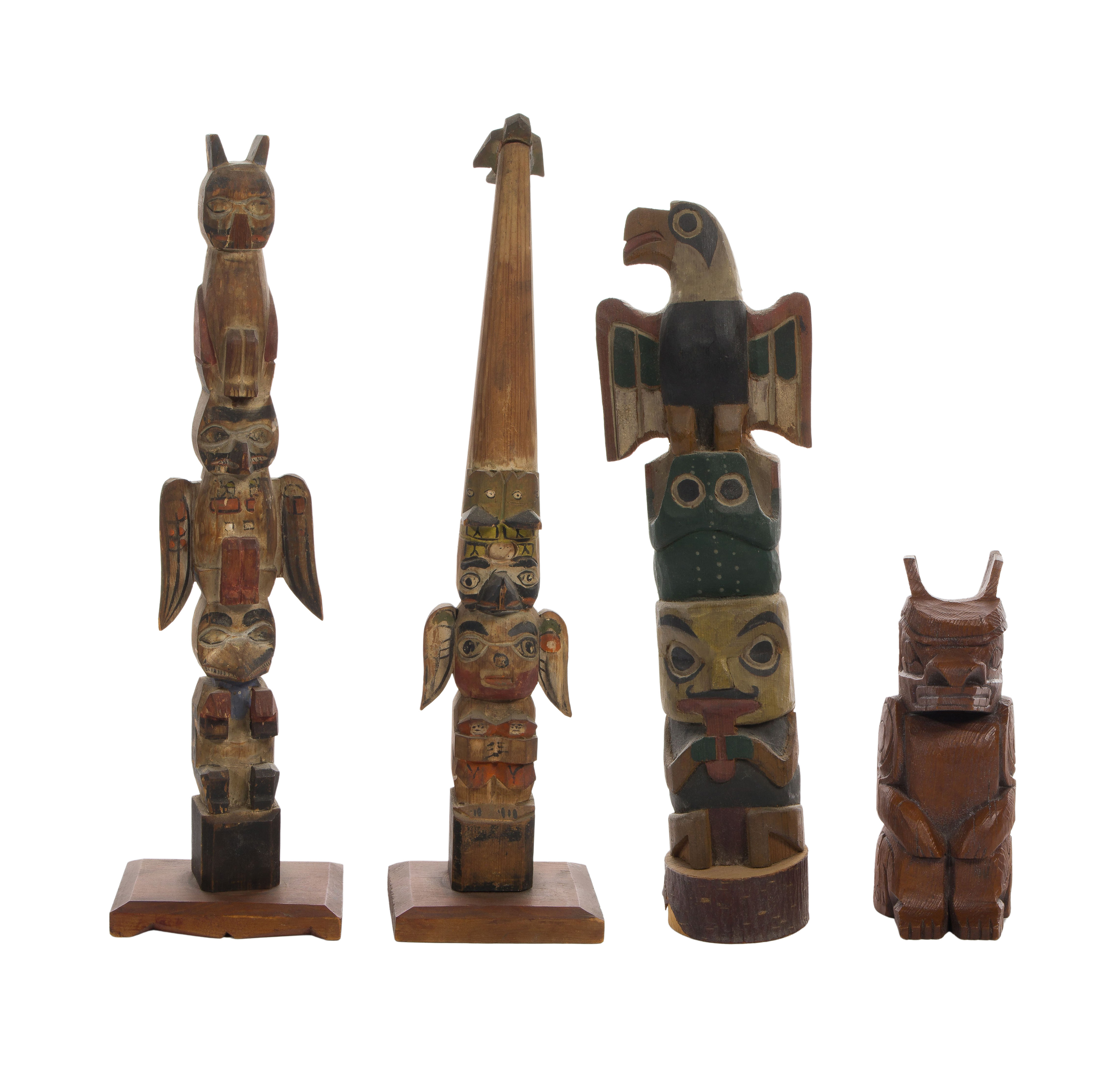 (4) total items including (3) unsigned carved and painted wood models, attached to stands; together with a cast resin wolf totem having cast inscription ‘Made in Alaska / Tufflukk’