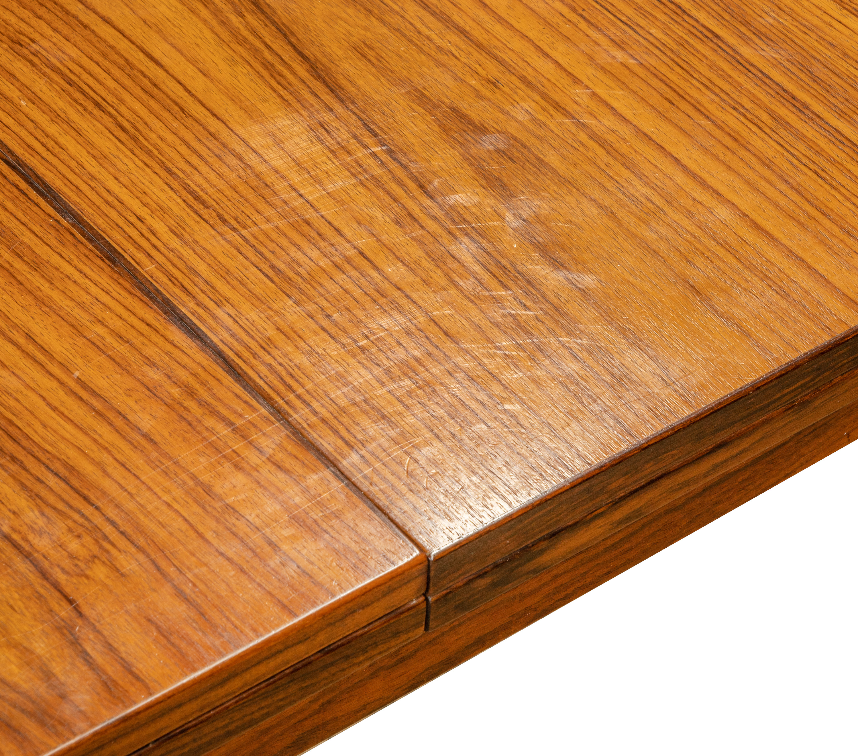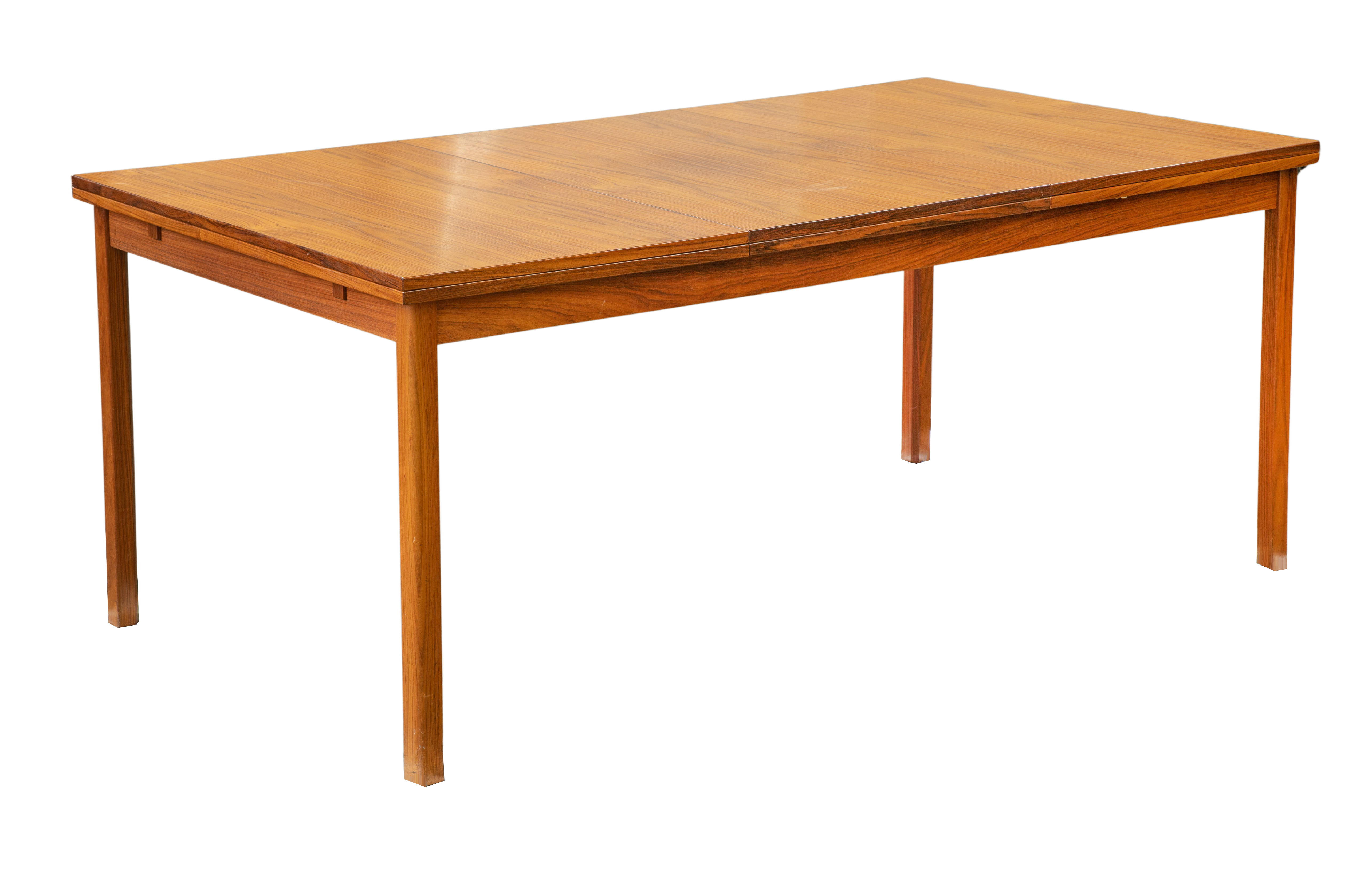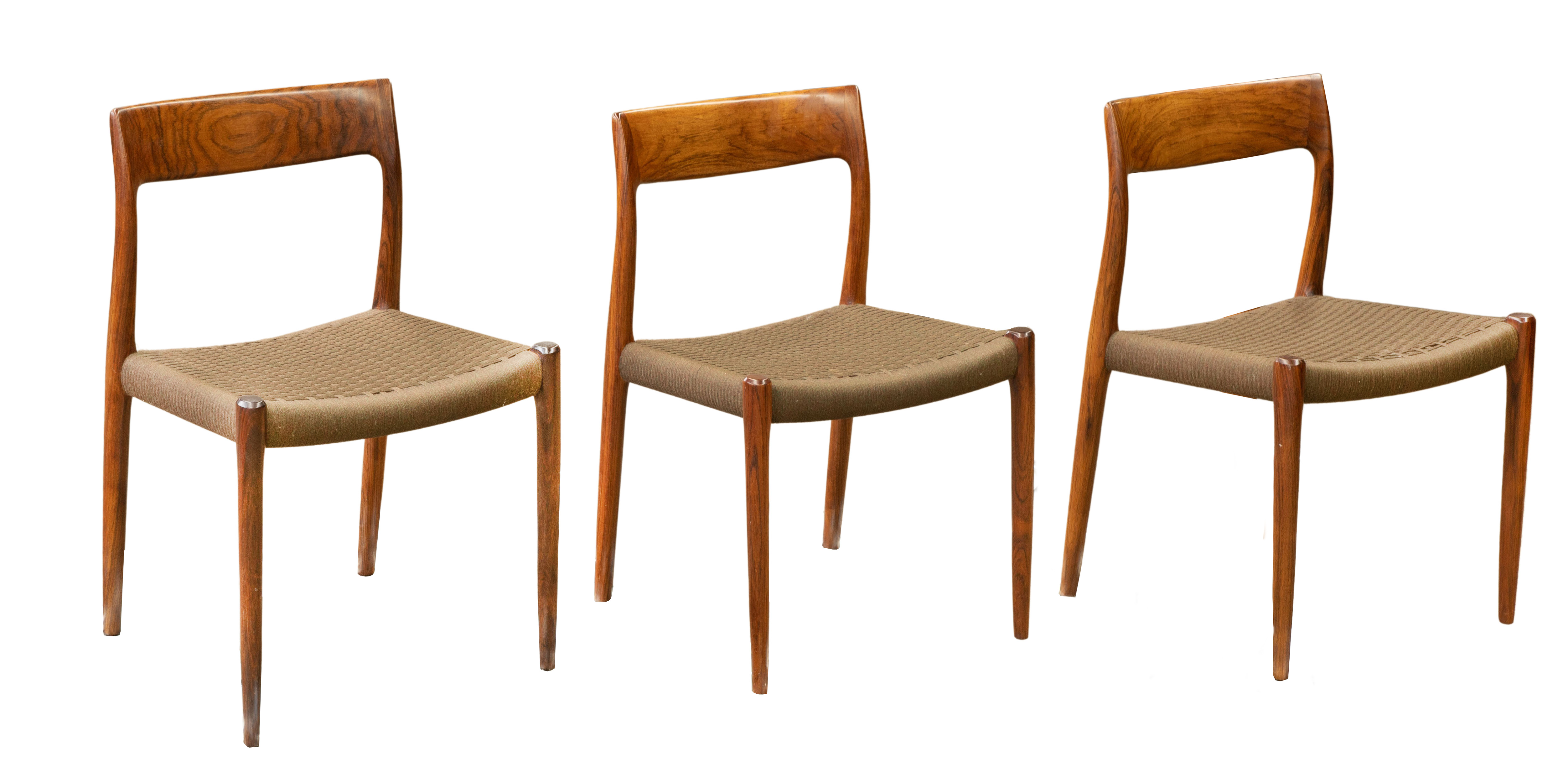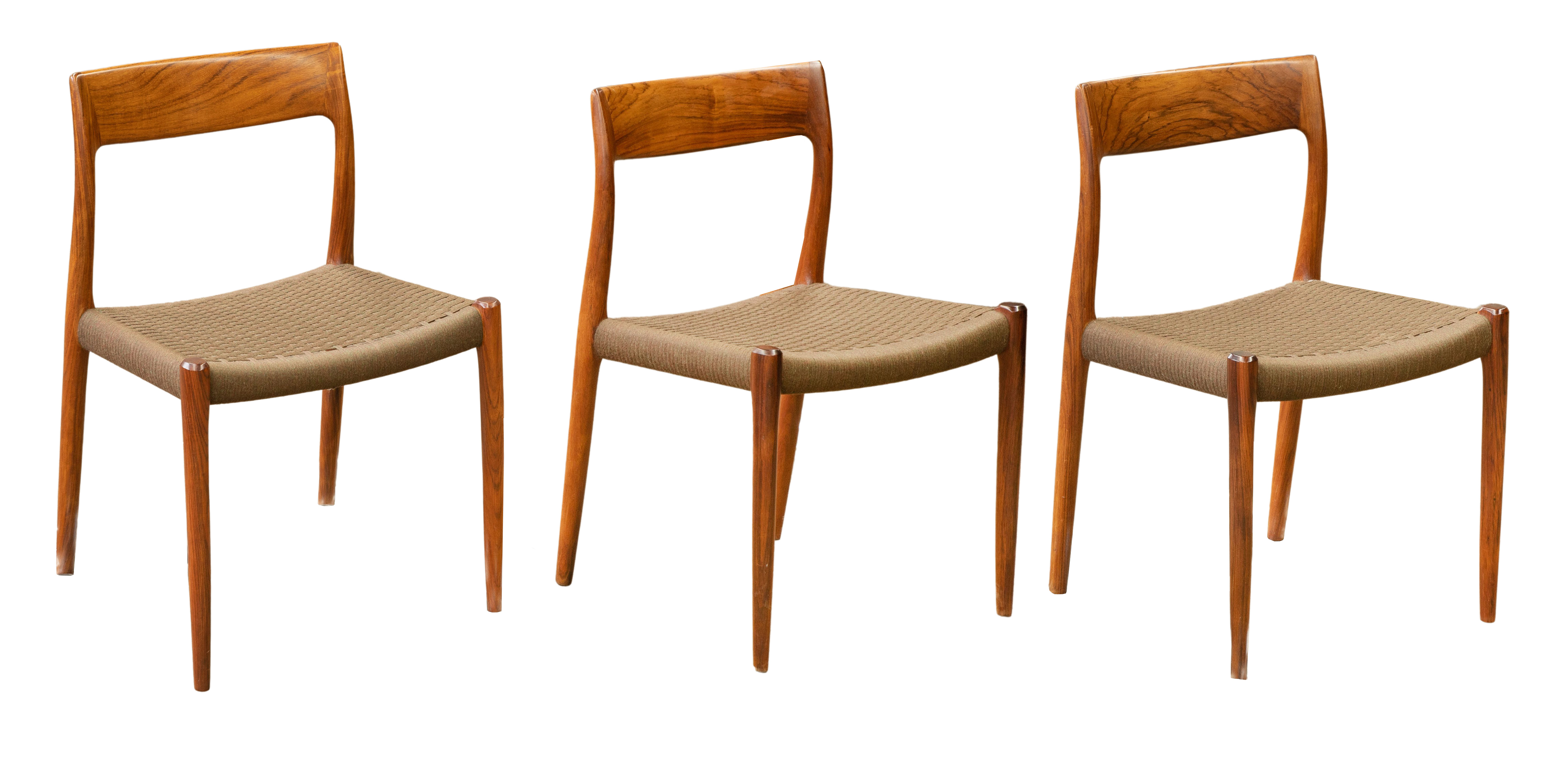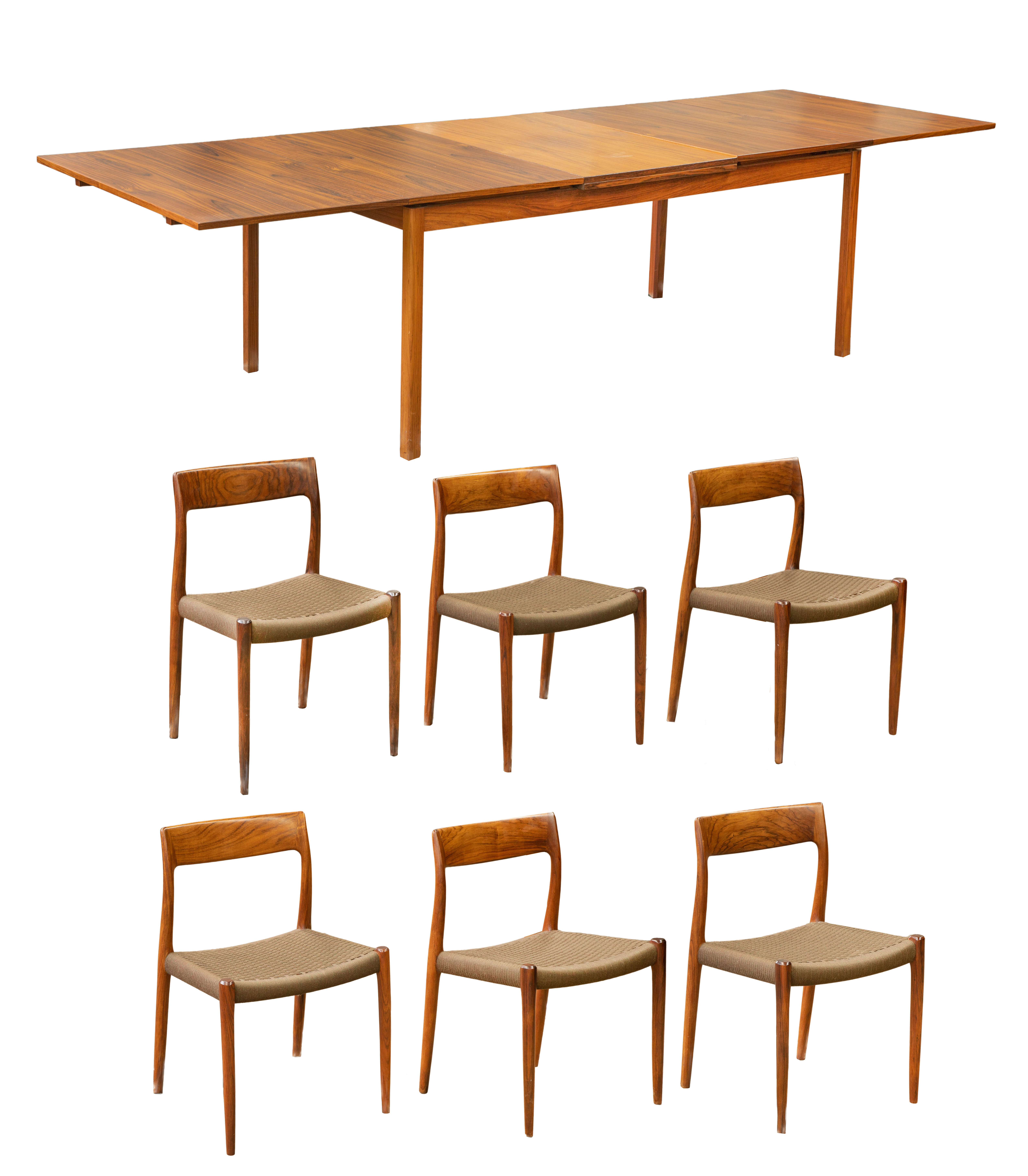 (7) items including a Danish modern rosewood refractory extension table opening to 118.5-inches, retaining original tag on underside and a set of (6) Moller design 77 rosewood chairs having woven thread seats, stamp on underside