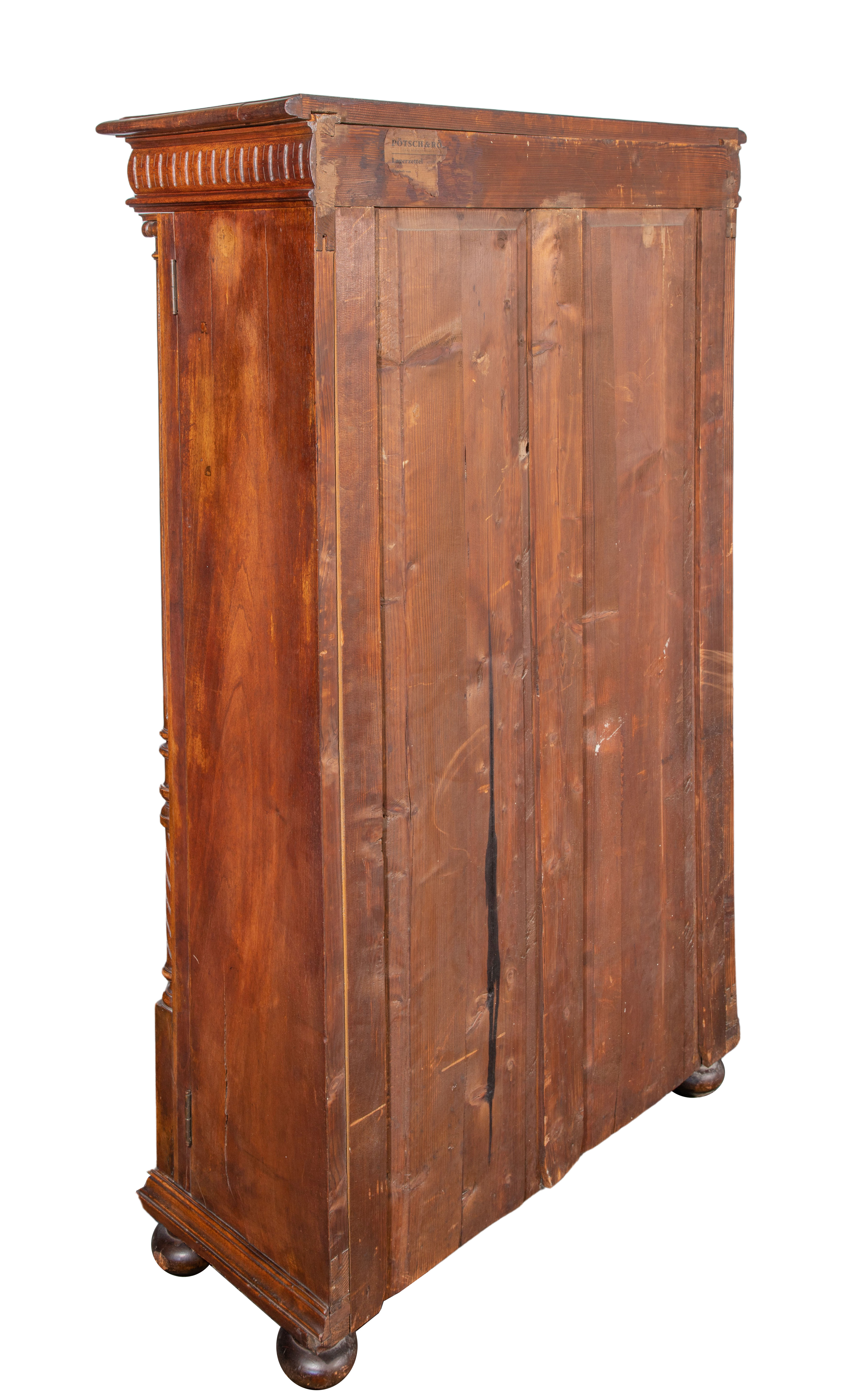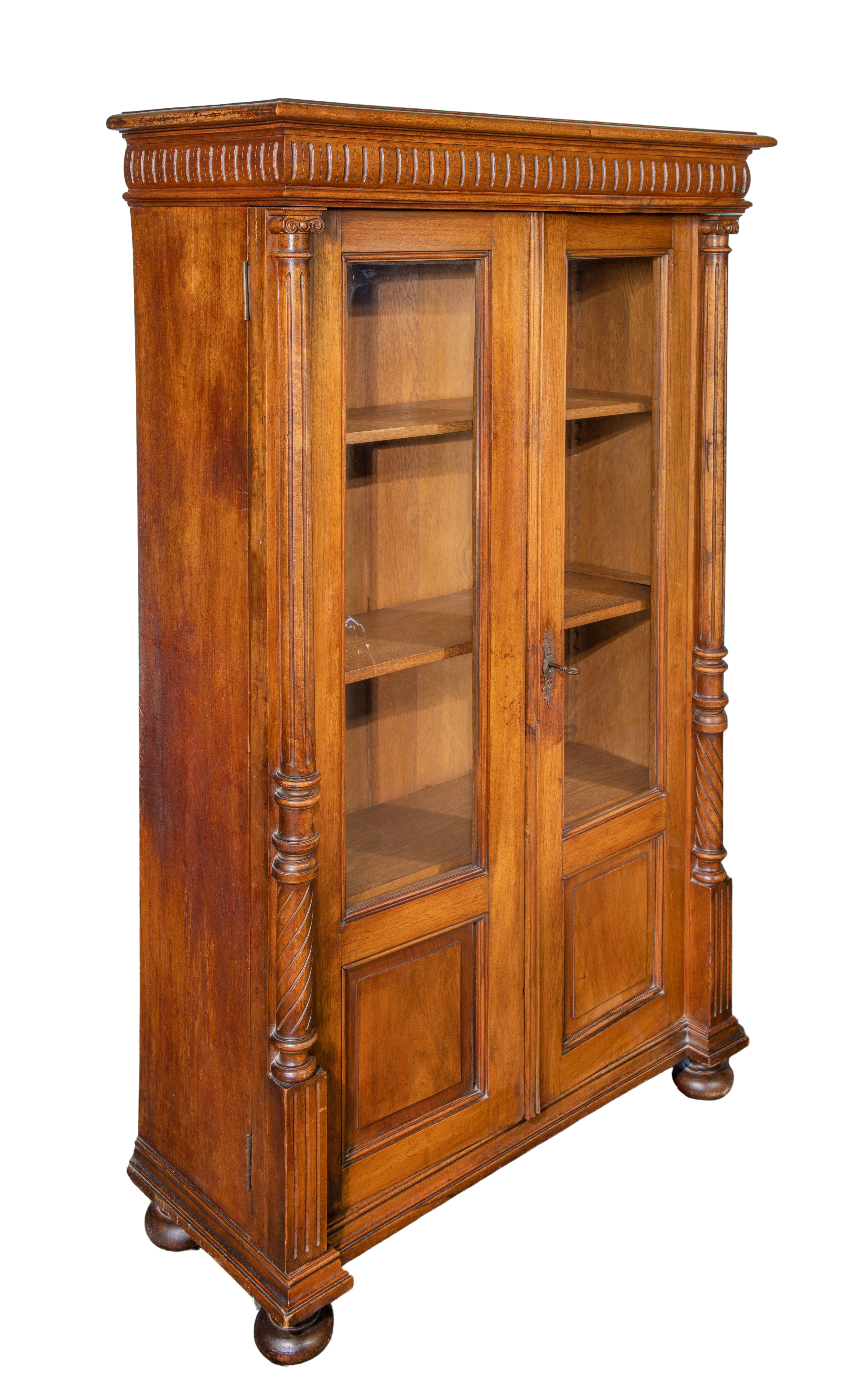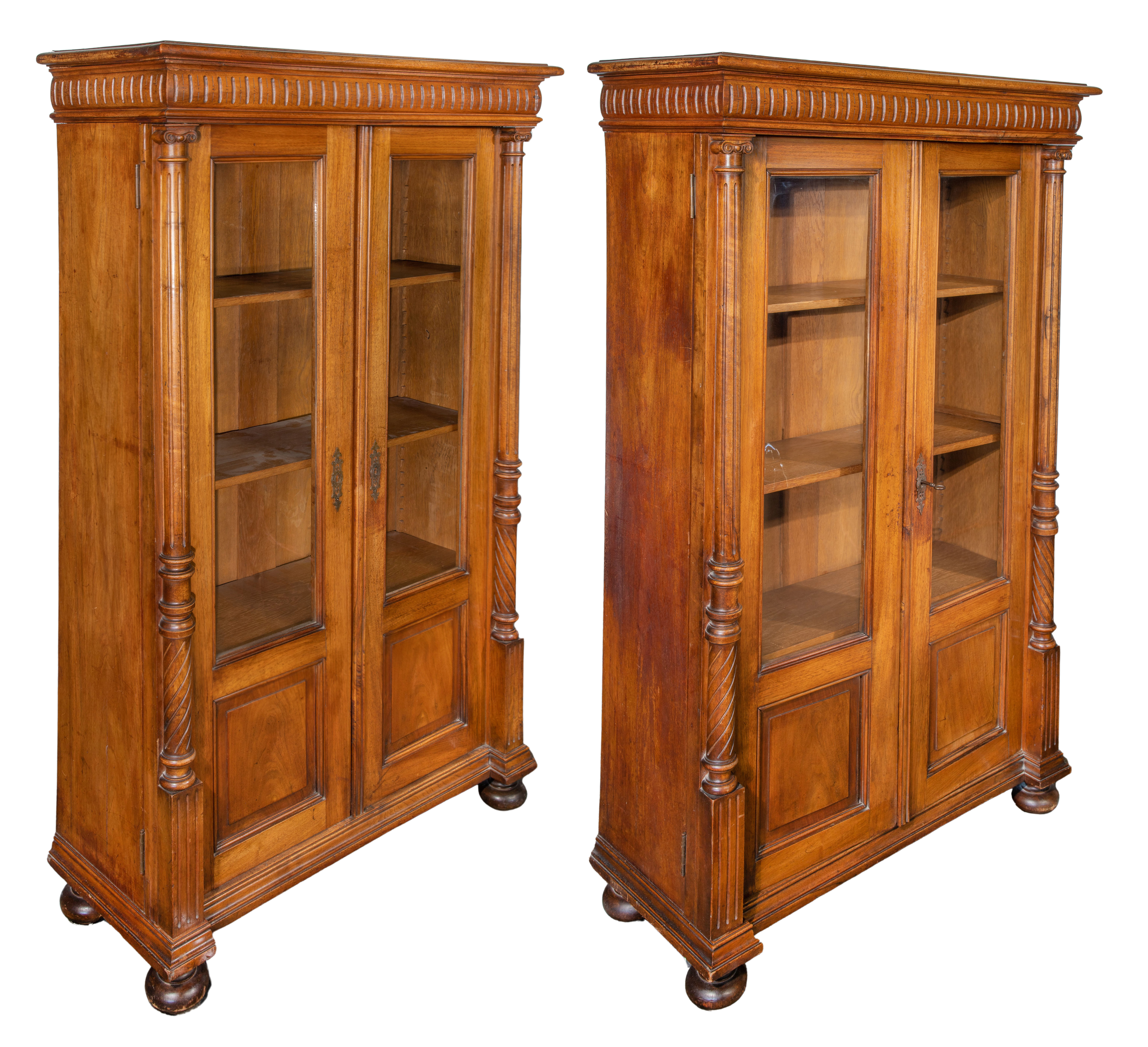 Pair of walnut veneered, dovetail joined cabinets, each having a dentil mold straight pediment above two glazed and paneled doors having attached fluted columns, opening on three adjustable shelves, bun feet, brass faux key escutcheons (not fitted for locks) and retaining partial labels of the Potsch & Rossler company, Graz, Austria