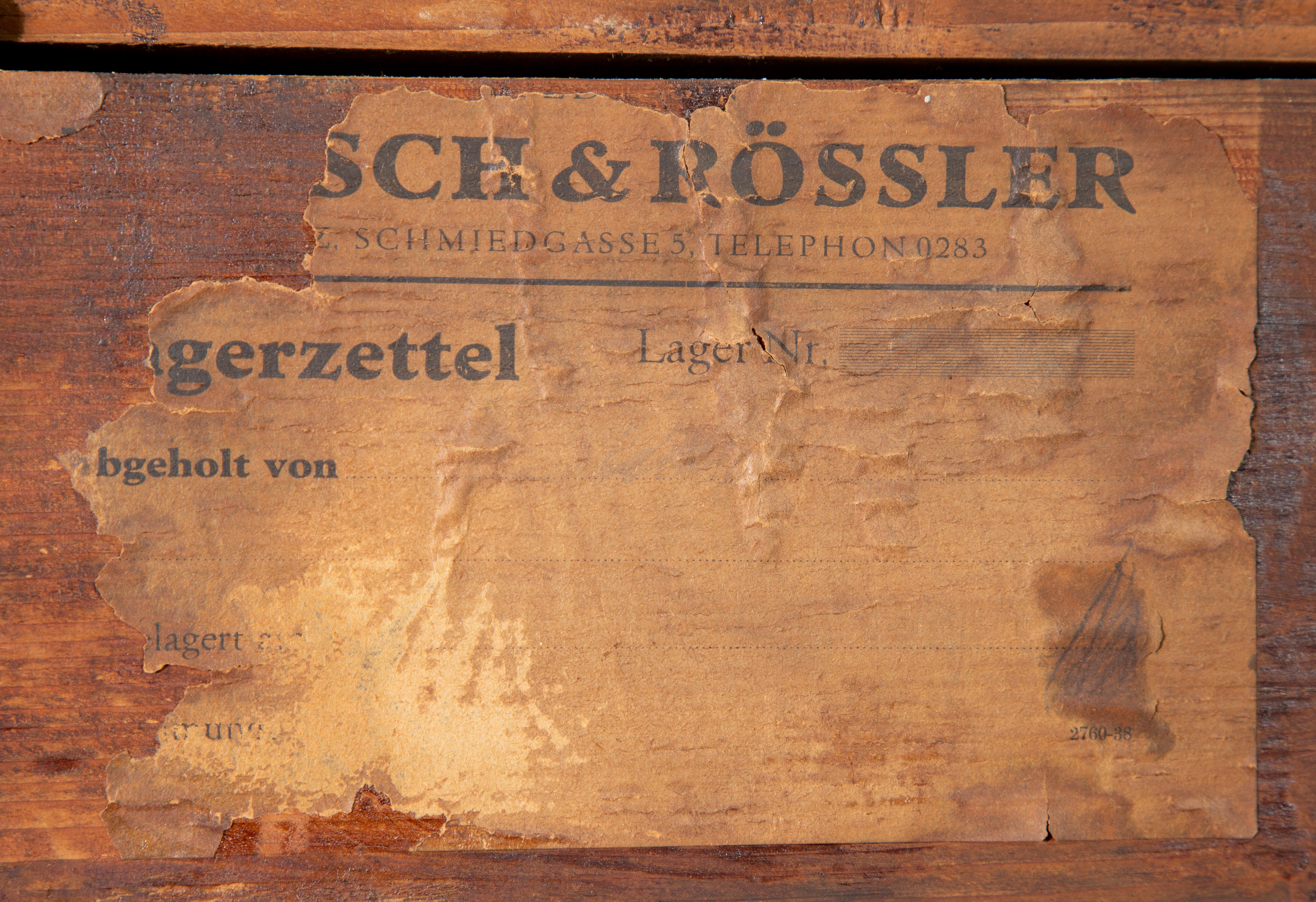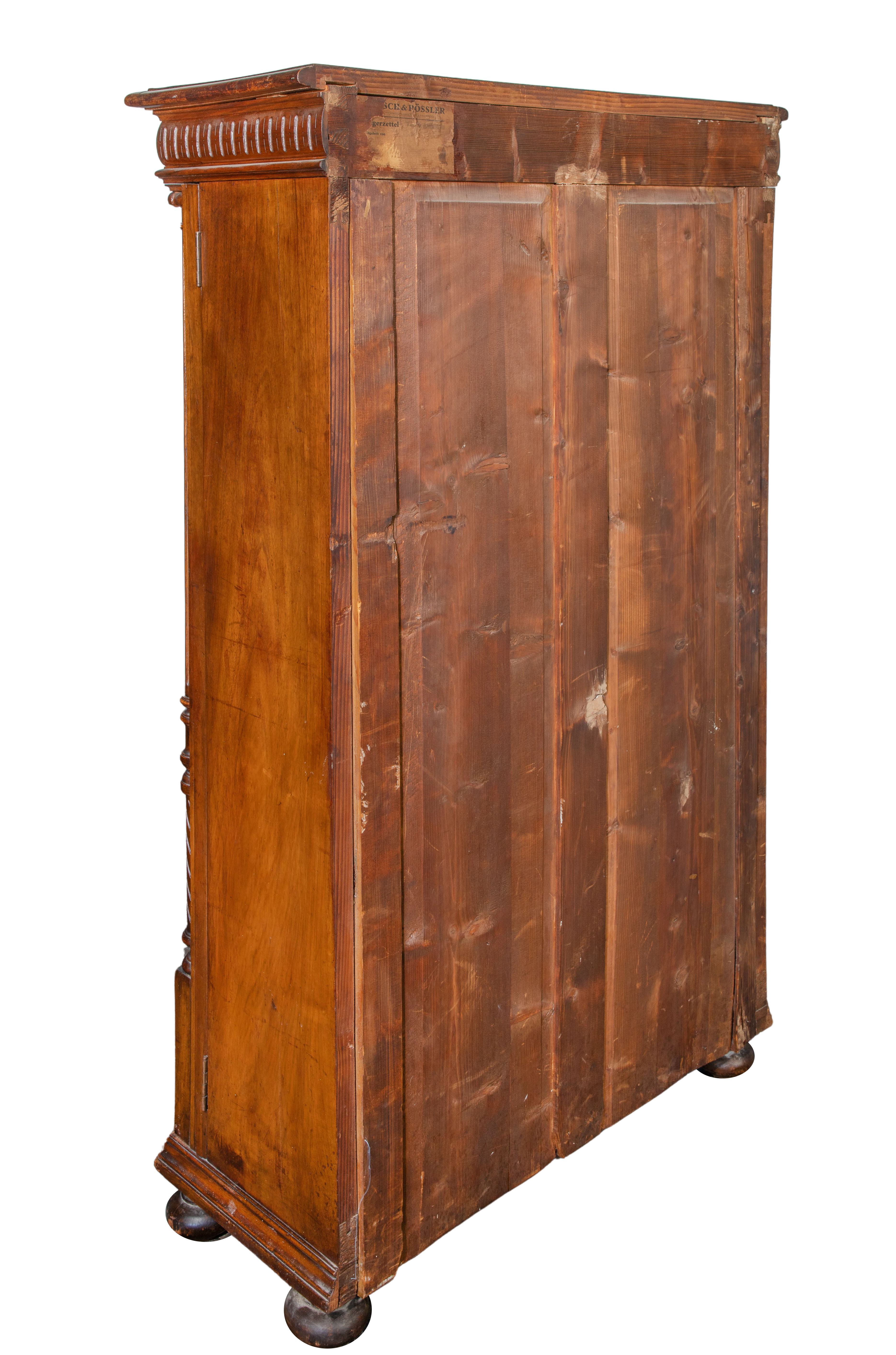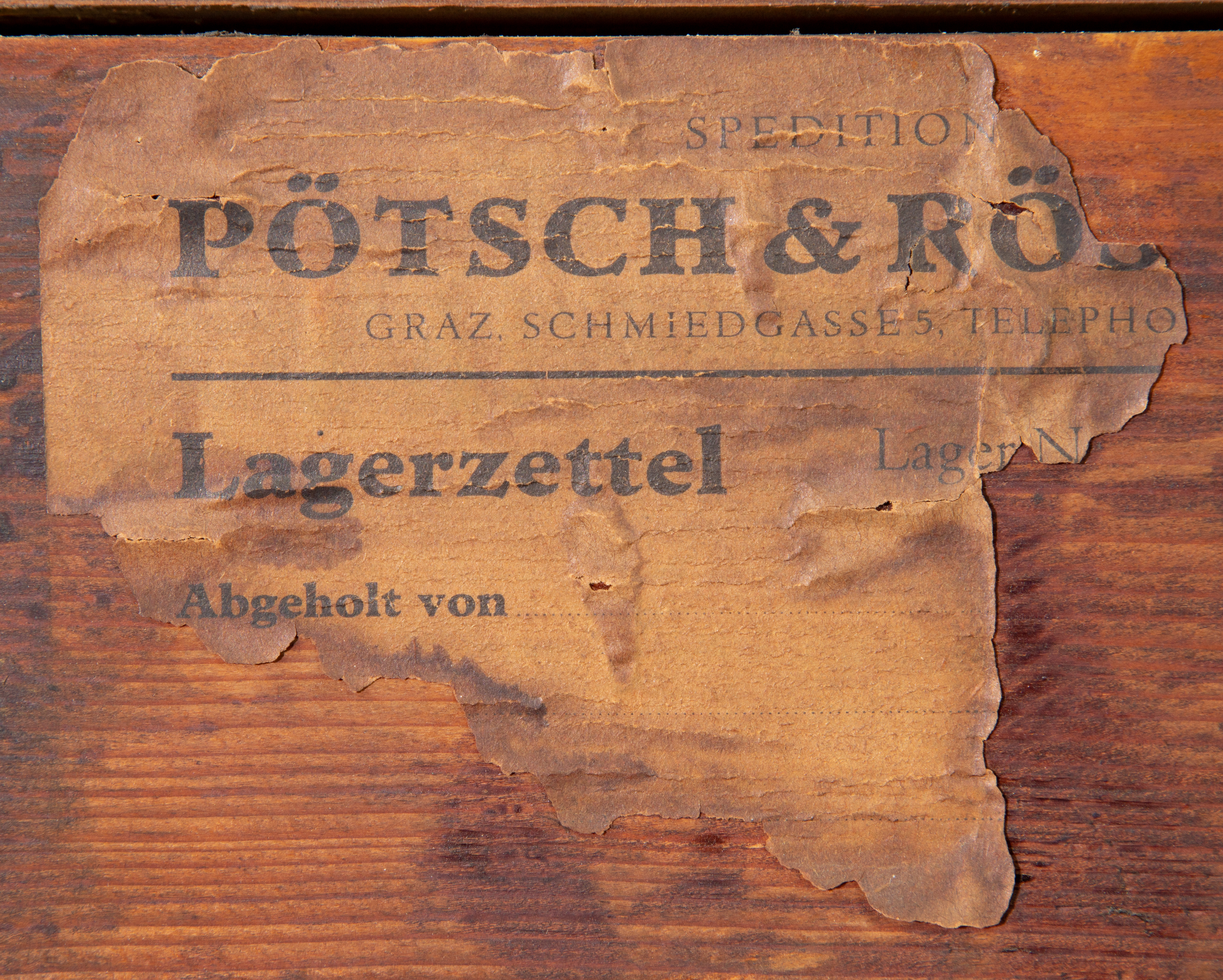 Pair of walnut veneered, dovetail joined cabinets, each having a dentil mold straight pediment above two glazed and paneled doors having attached fluted columns, opening on three adjustable shelves, bun feet, brass faux key escutcheons (not fitted for locks) and retaining partial labels of the Potsch & Rossler company, Graz, Austria