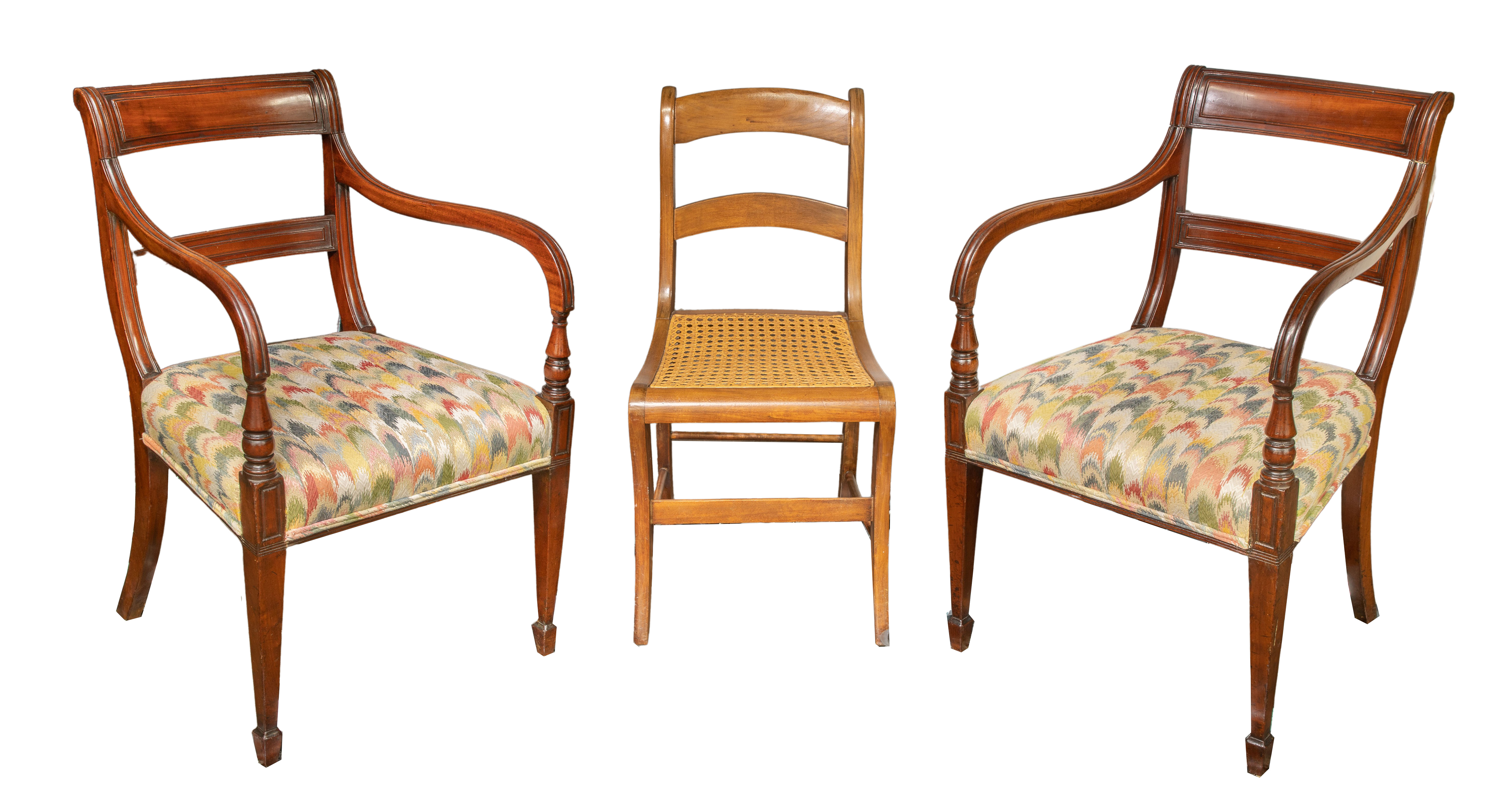 (3) total items including a pair of armchairs having sloping arms, turned returns, upholstered seats and turned fluted legs; together with a chair having a cane seat