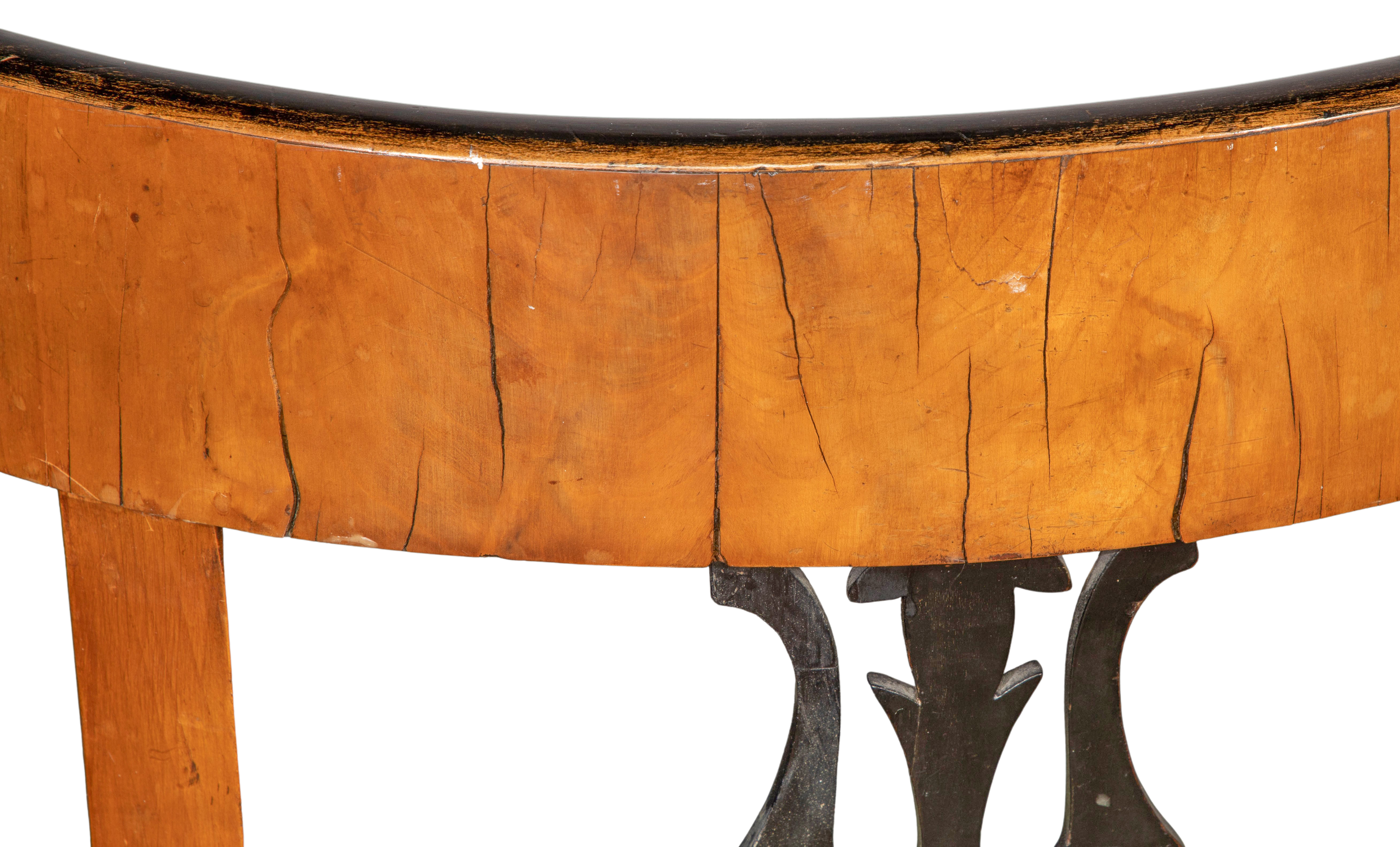 Condition: overall light to moderate wear consistent with normal use, chips, nicks, scratches overall, Beidermeier chairs having cracks and splits to veneers overall, arm chair having loose right arm