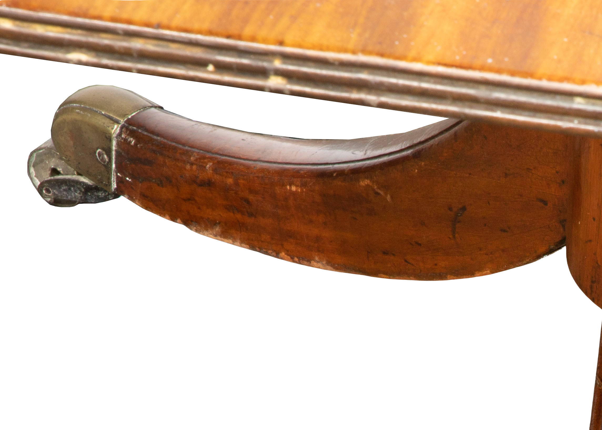 Having a rectangular top with rounded corners, tripartite base, brass caps and casters