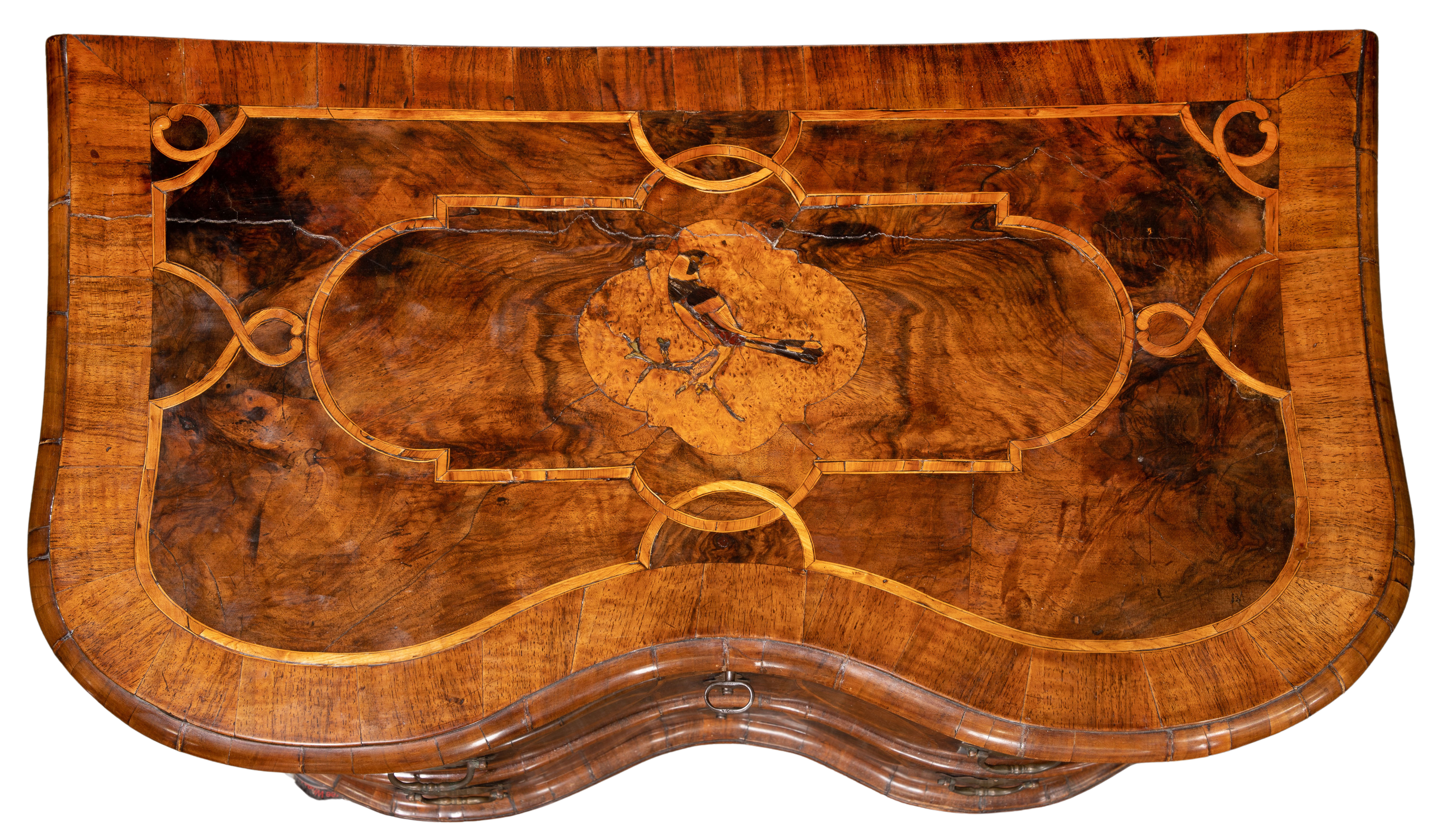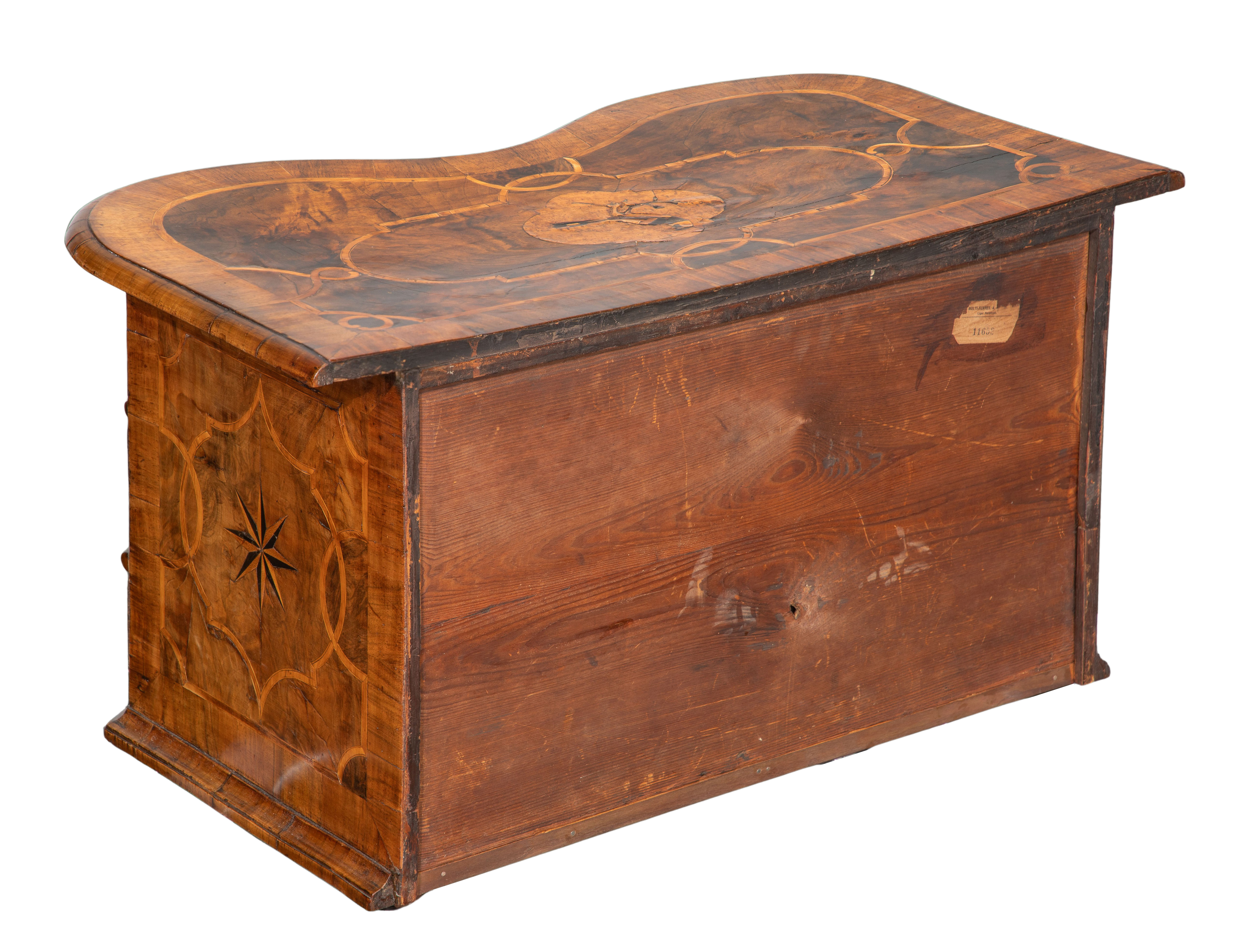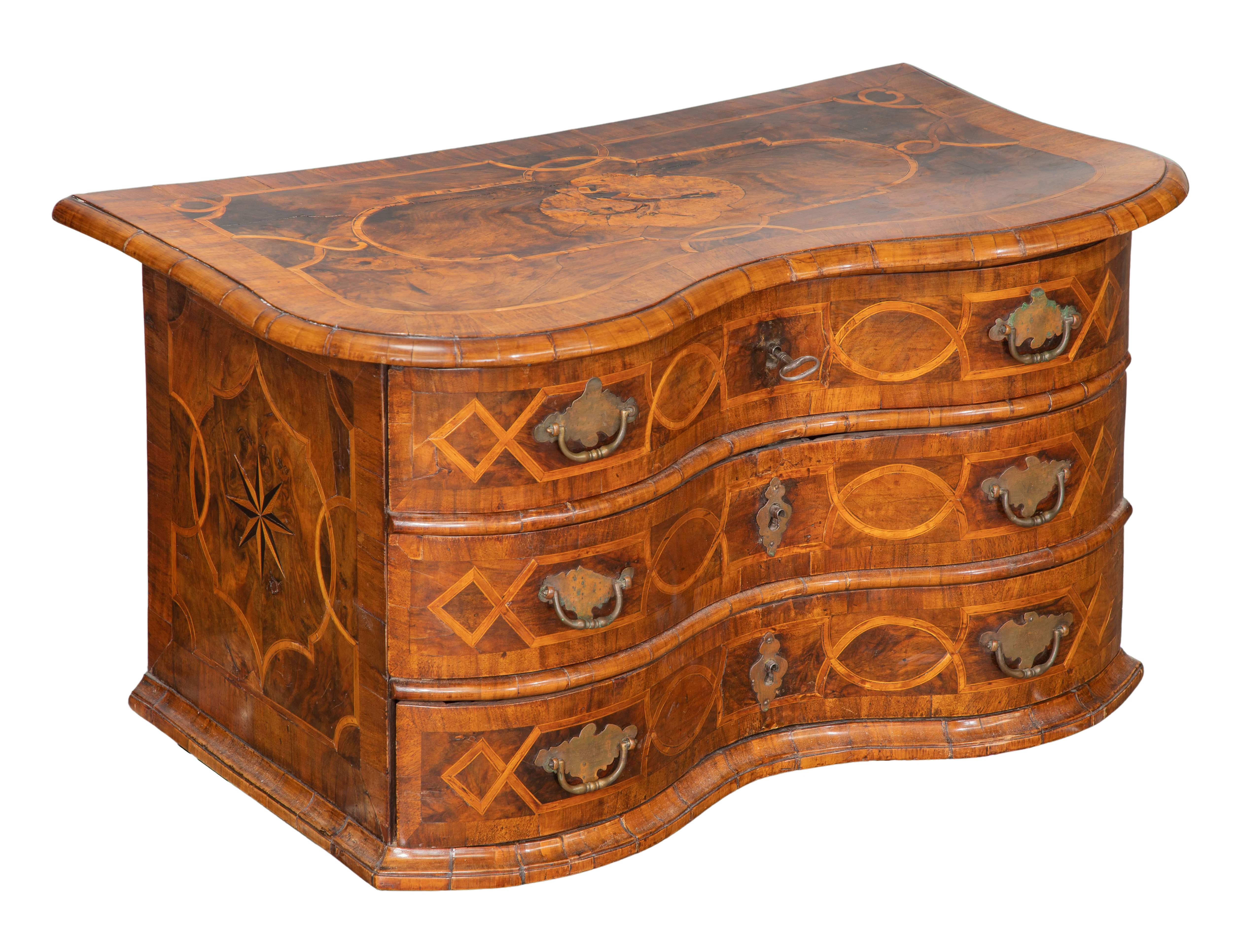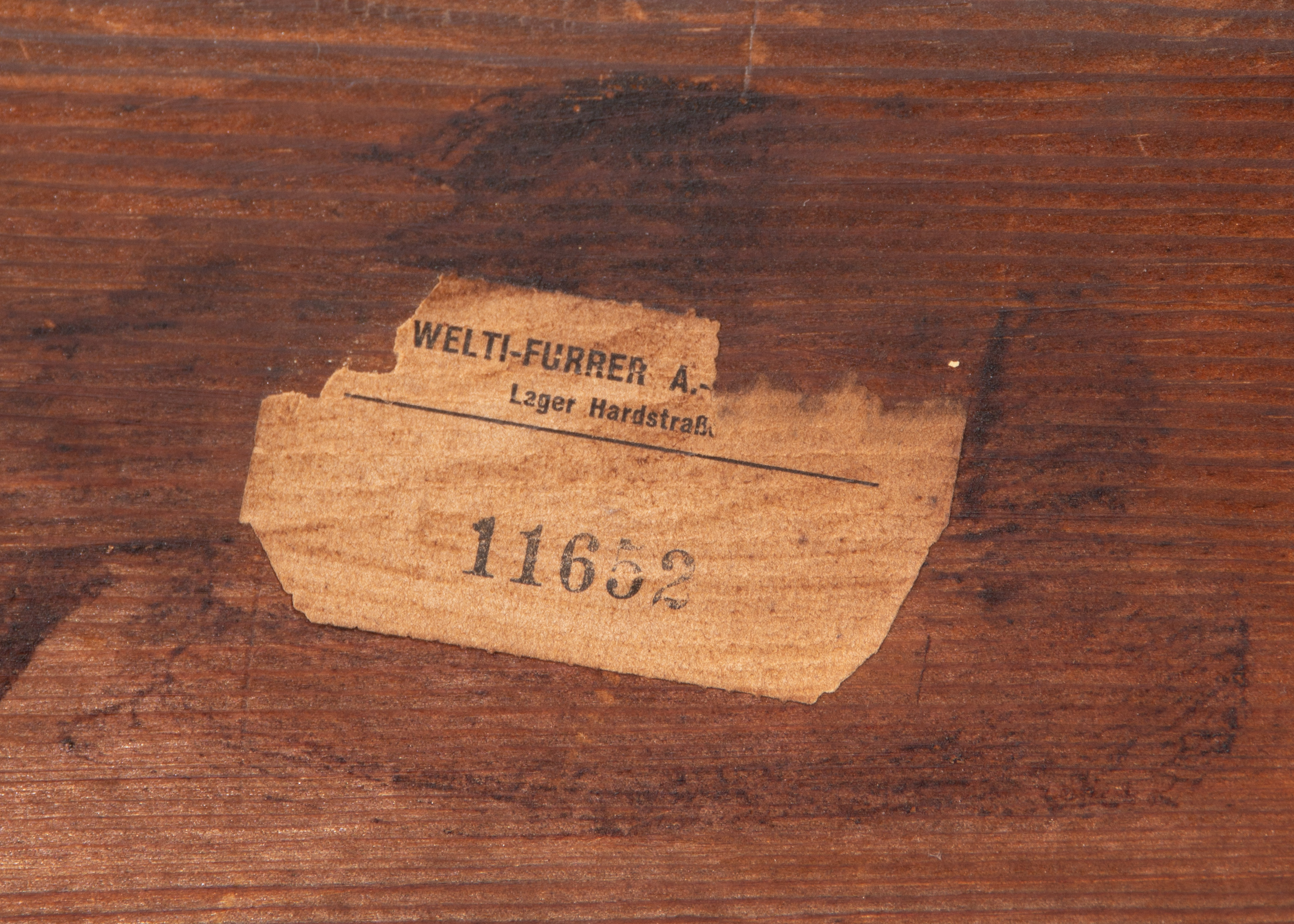 Having a shaped top inlaid in various wood veneers centering a bird on burl wood ground, compass inlays to sides, three dovetailed drawers having brass pulls attached using cotter pins, working locks and key, all on turned bun feet and having a partial paper label of Welti-Furrer, a Swiss company providing art-related logistics and transportation since 1838
