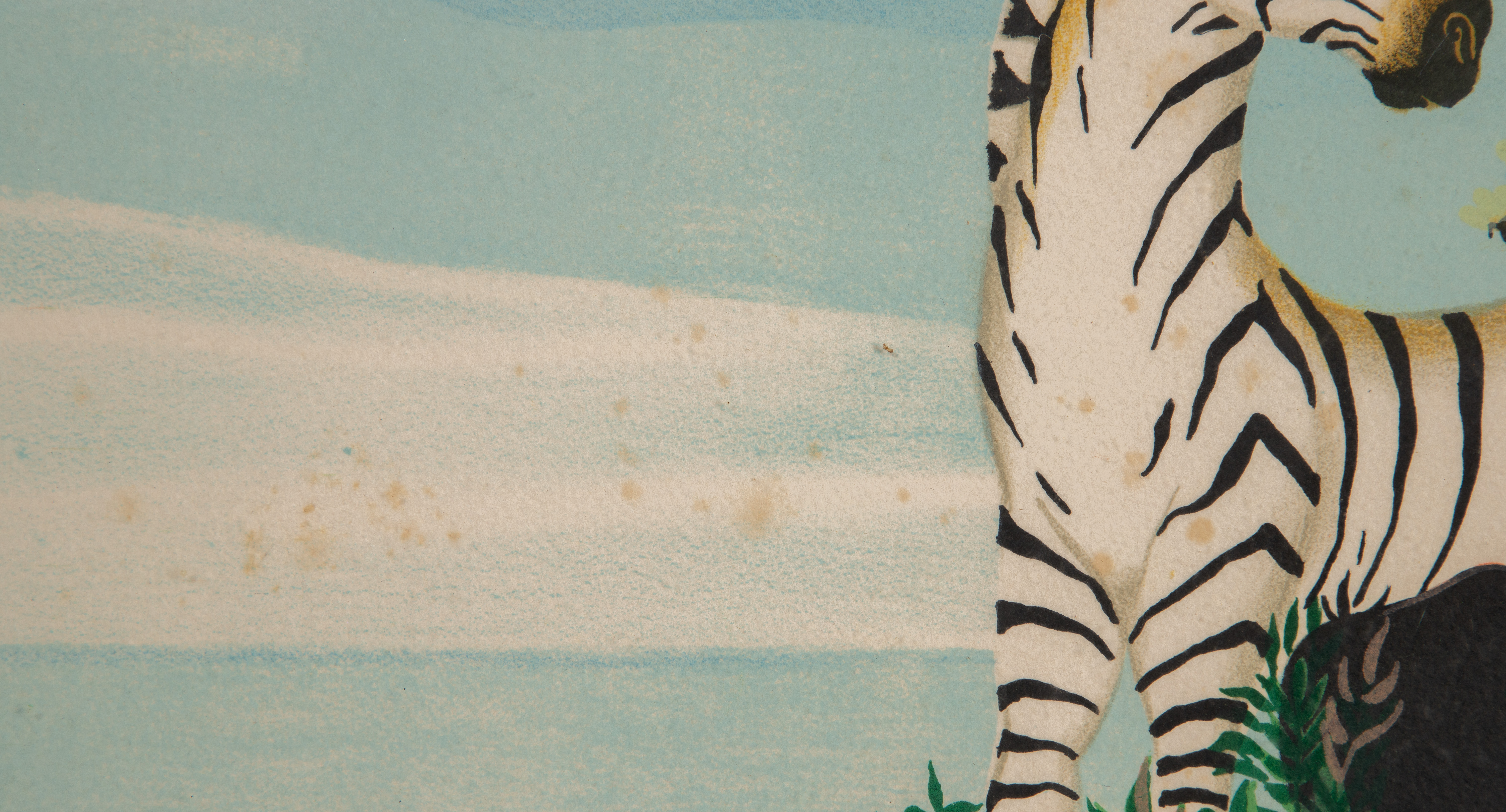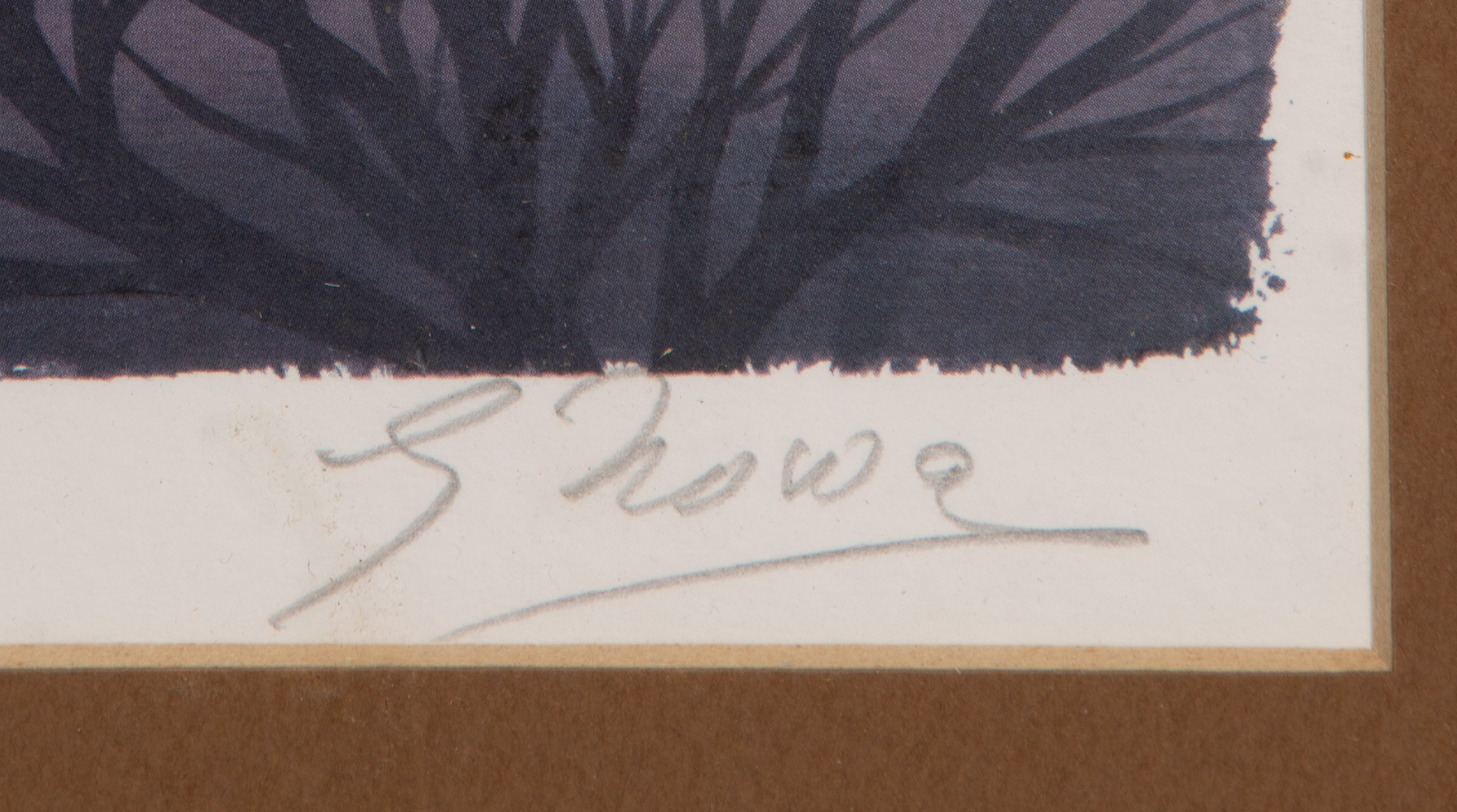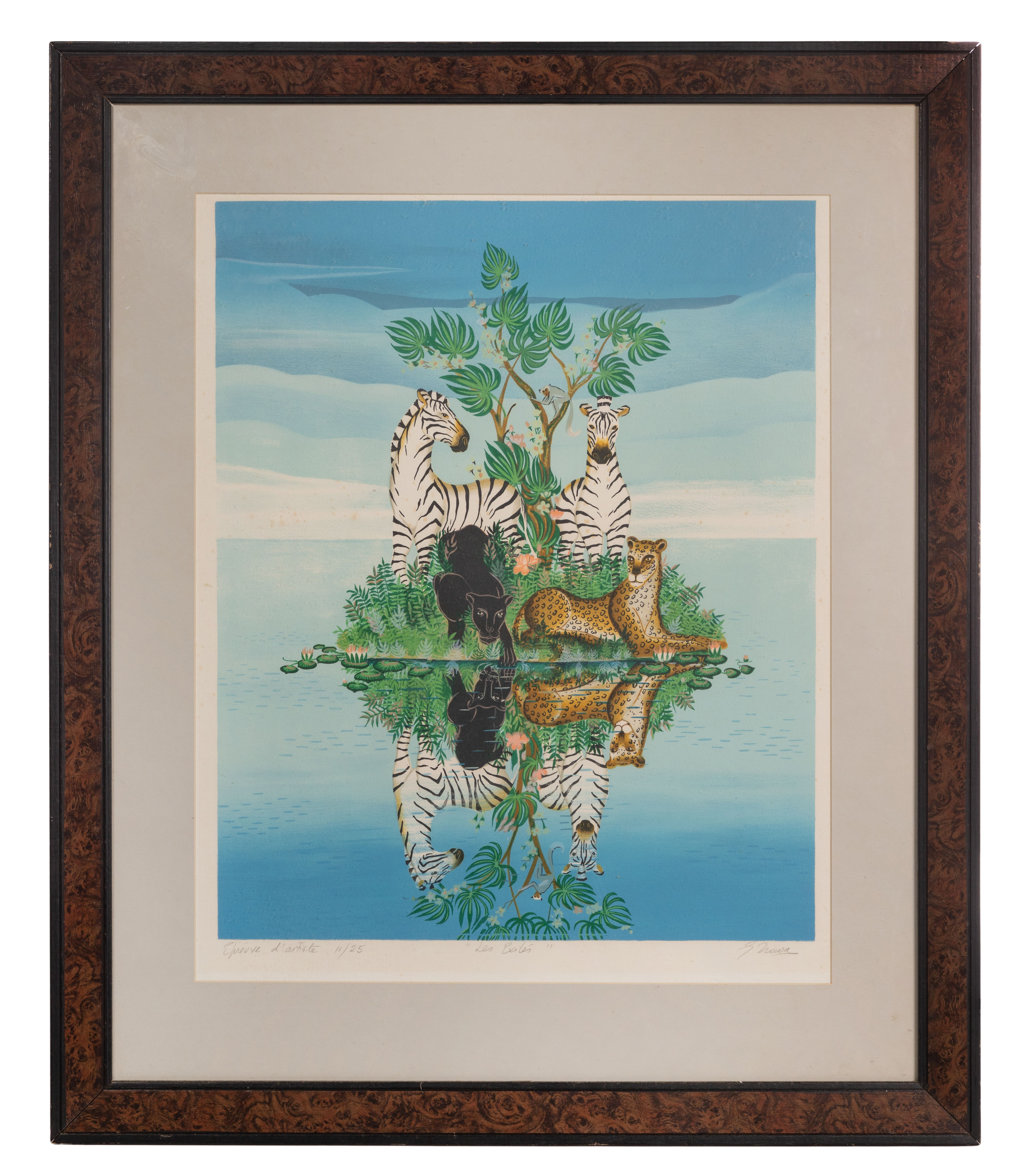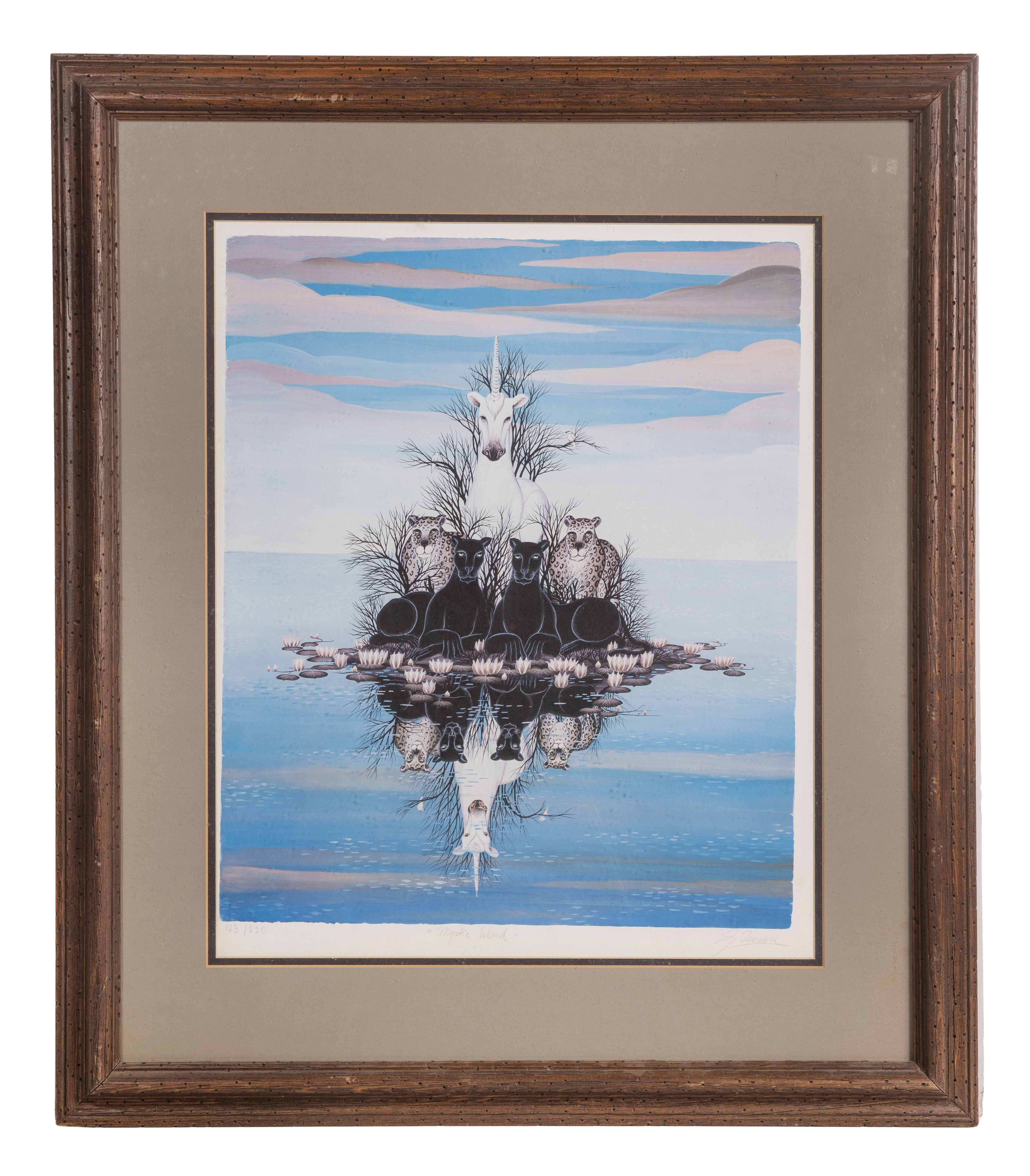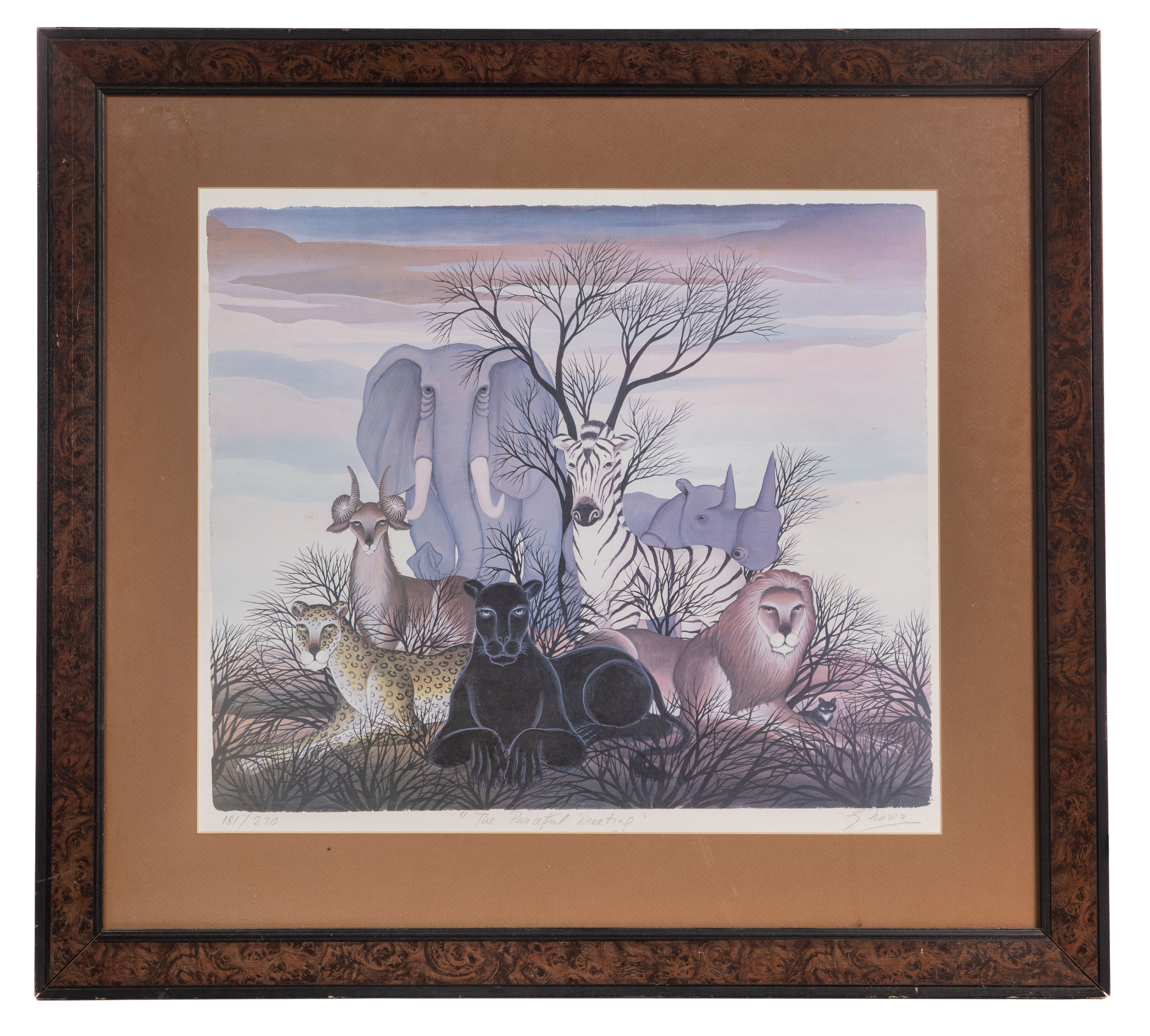 c.1970, all pencil signed lower right including ‘The Peaceful Meeting’, #181/230, ‘Mystic Island’, #123/230 and ‘Les Exiles’, Epreuve d’ Artiste #11/25, depicting whimsical paintings featuring animals, all matted under glass in wood frames
