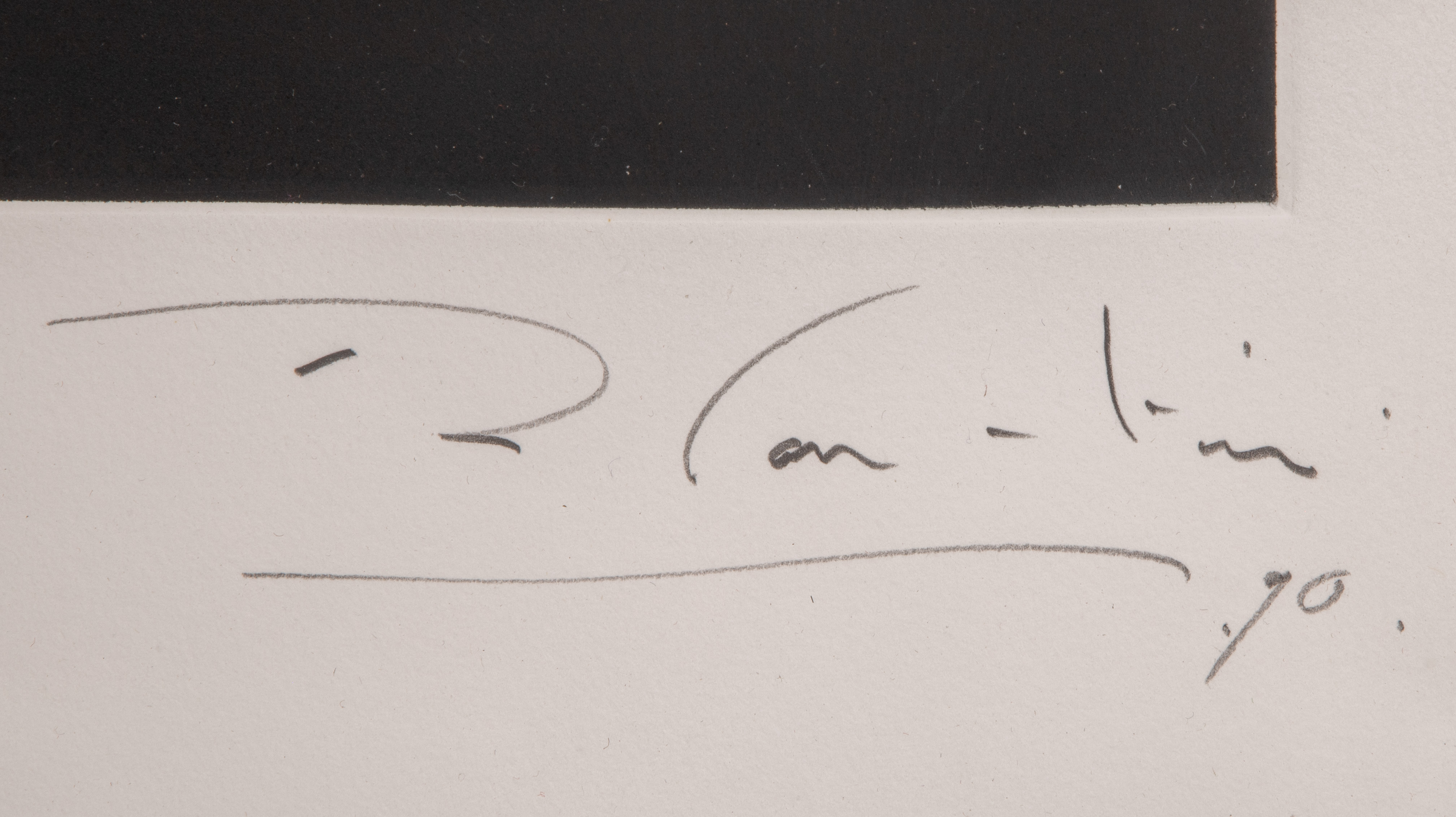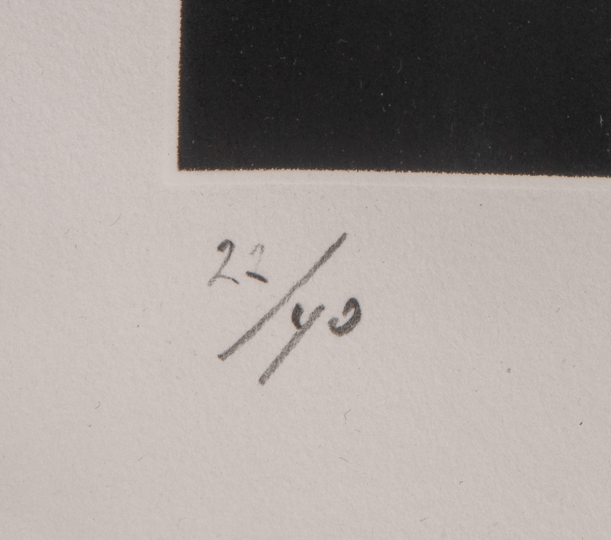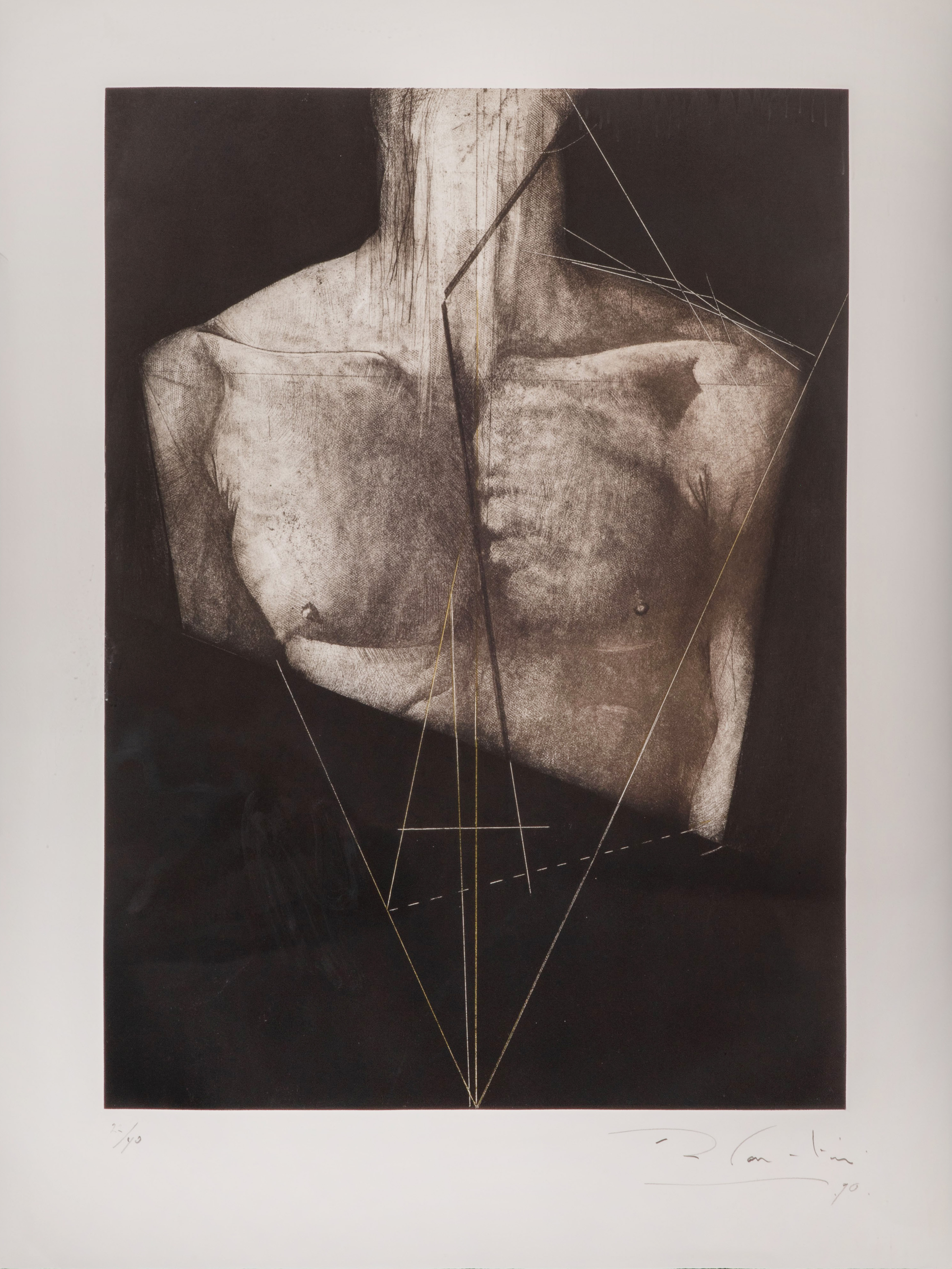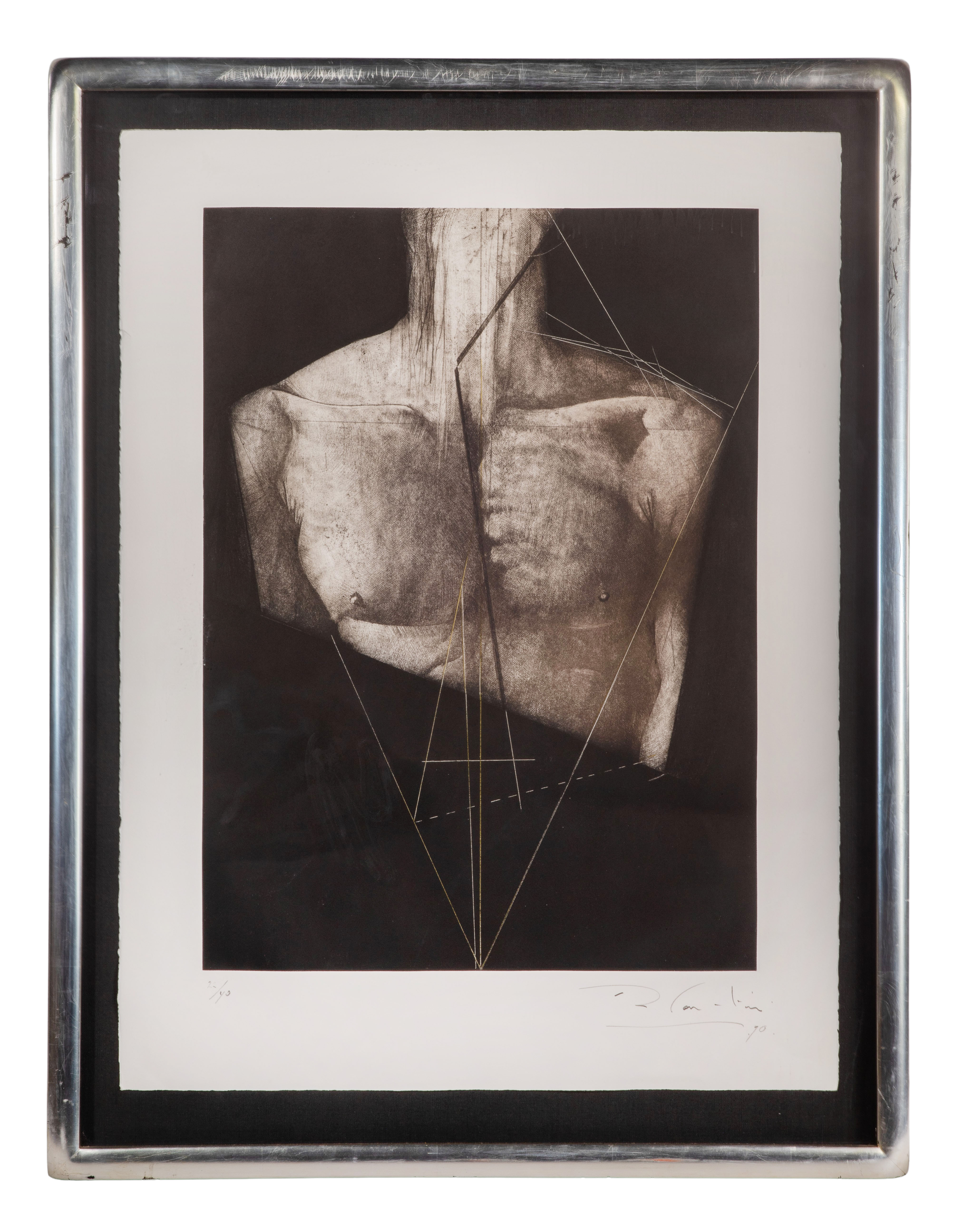 1990, pencil signed lower right and #22/40, depicting an upper torso having intersecting lines overall, float matted in a silver metallic painted wood frame