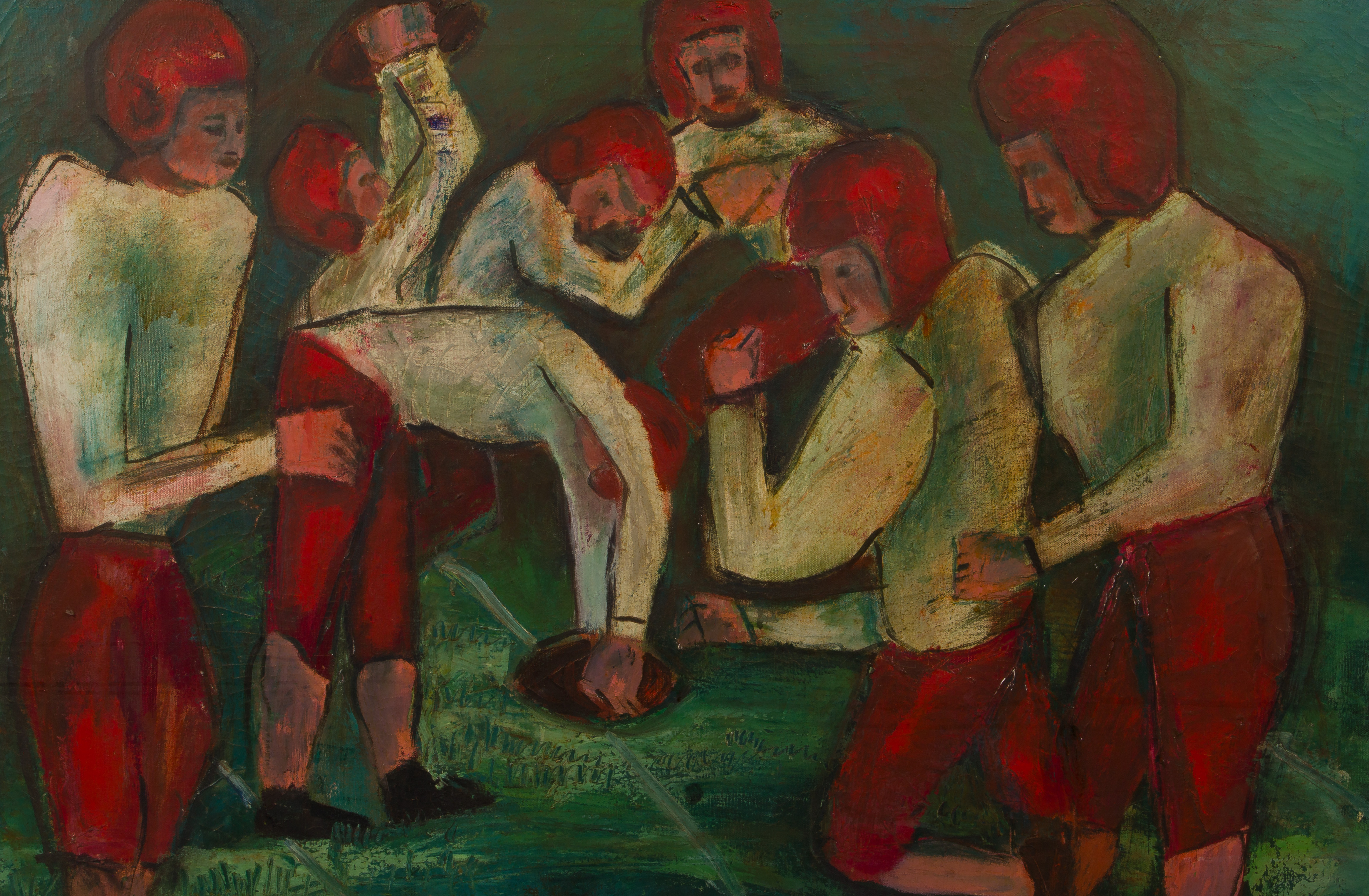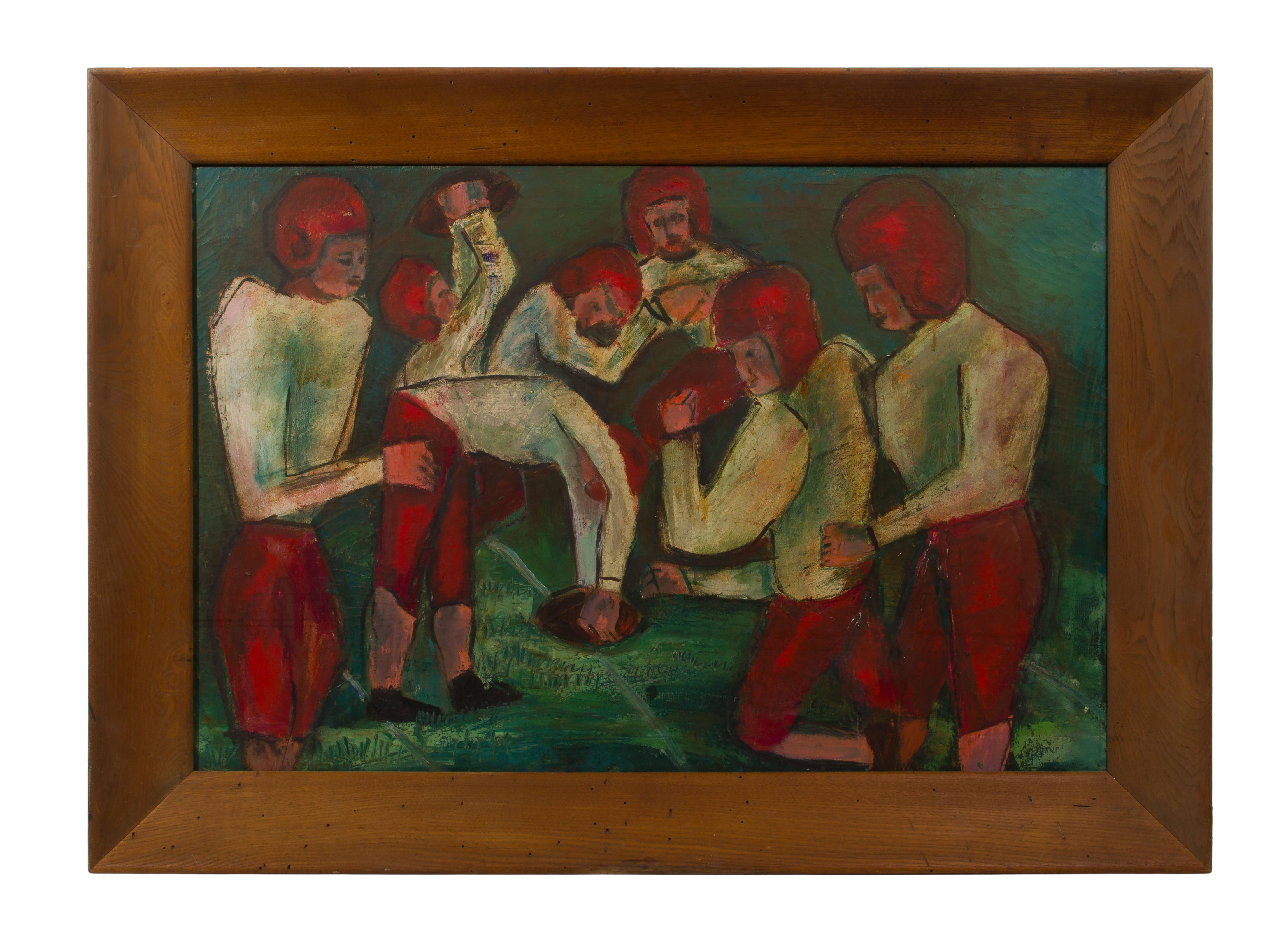 Undated, unsigned, depicting football players, in a wood frame, annotation ‘Gary Maddox’ on canvas verso