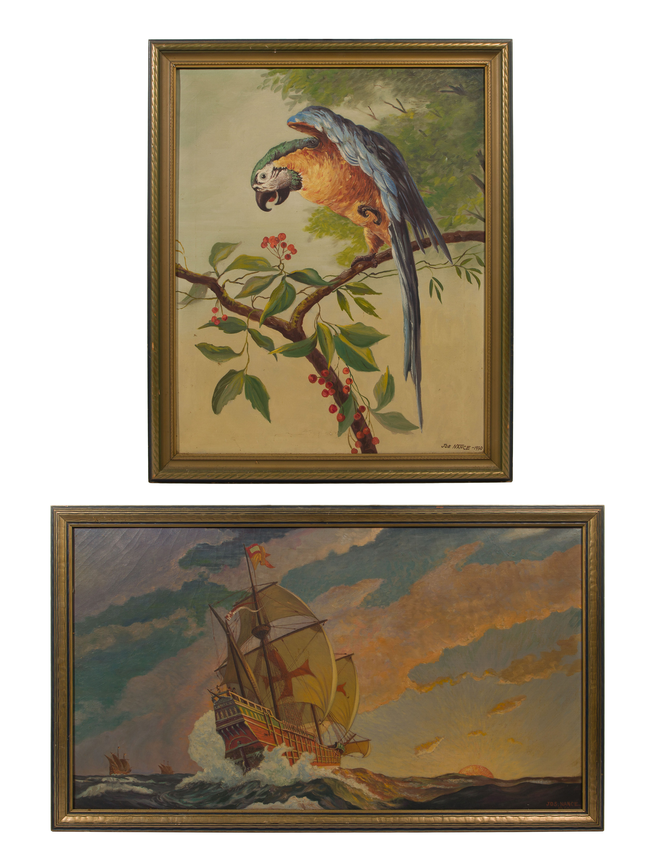 1930, both signed and dated lower right, depicting a parrot and a Spanish ship, in gold-tone wood frames