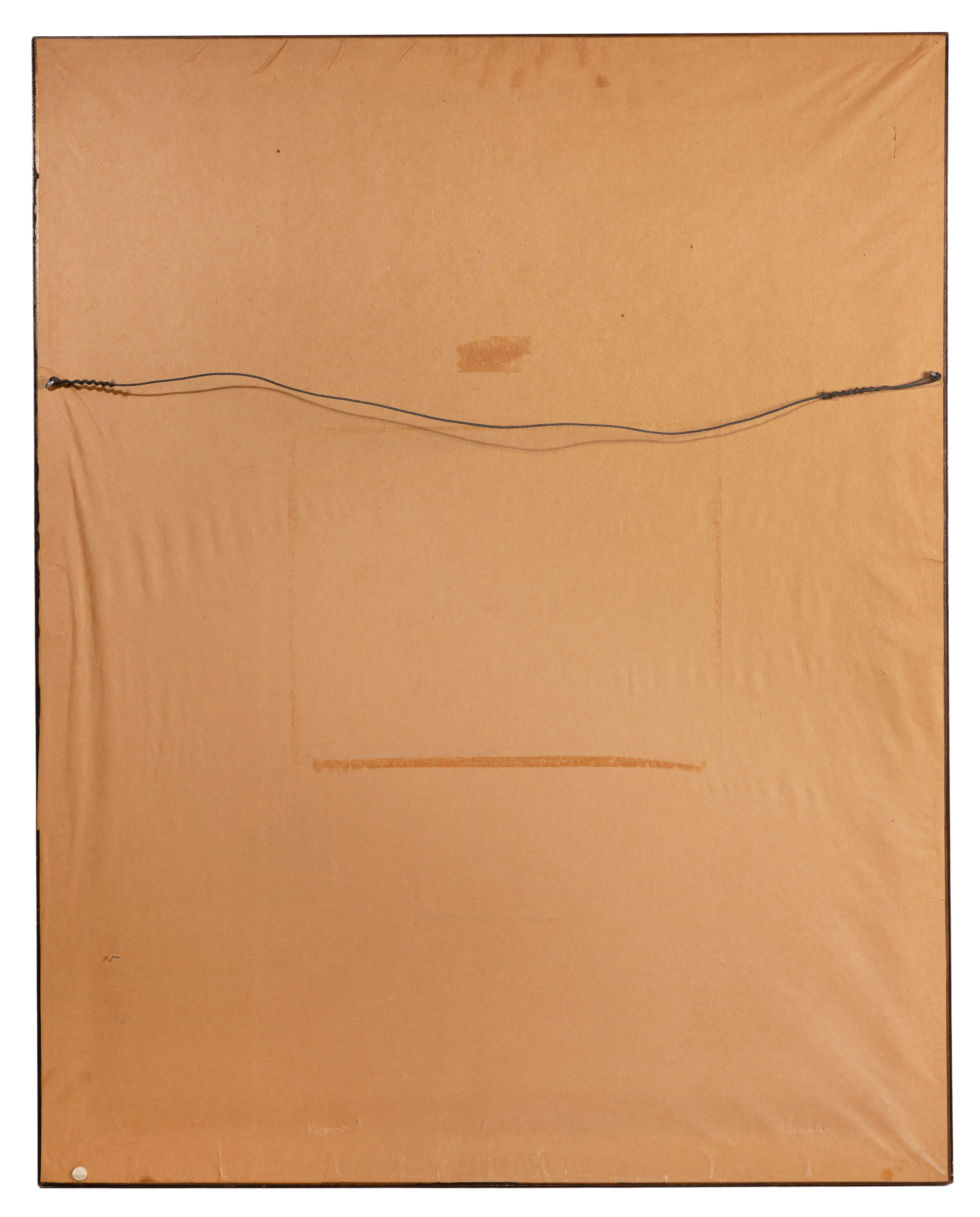 Condition: canvas mounted on board, areas of inpainting throughout, paint loss along edges, scratch in black field near bottom, stretcher marks, bubbling on canvas, craquelure overall, frame having minor chips