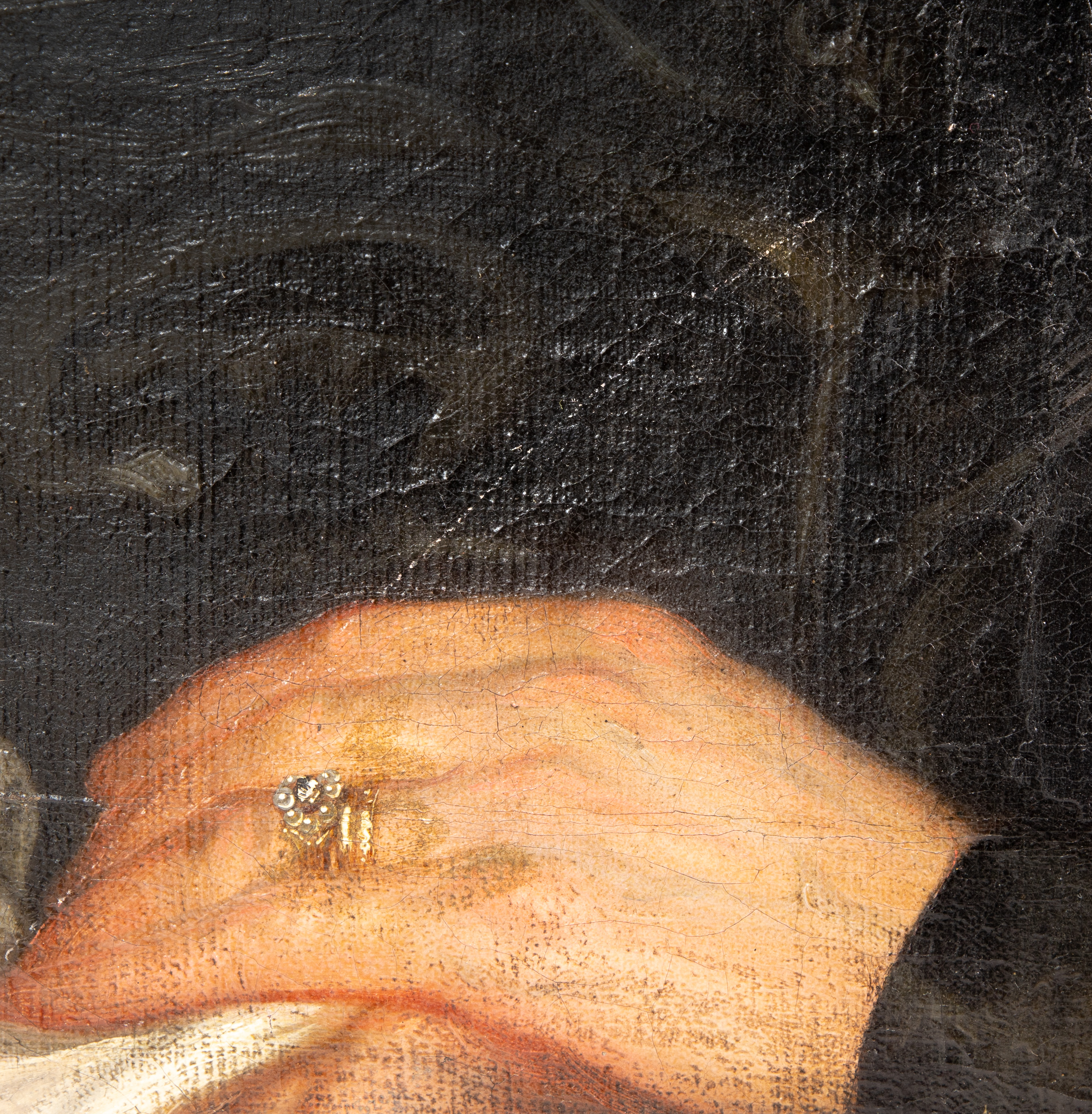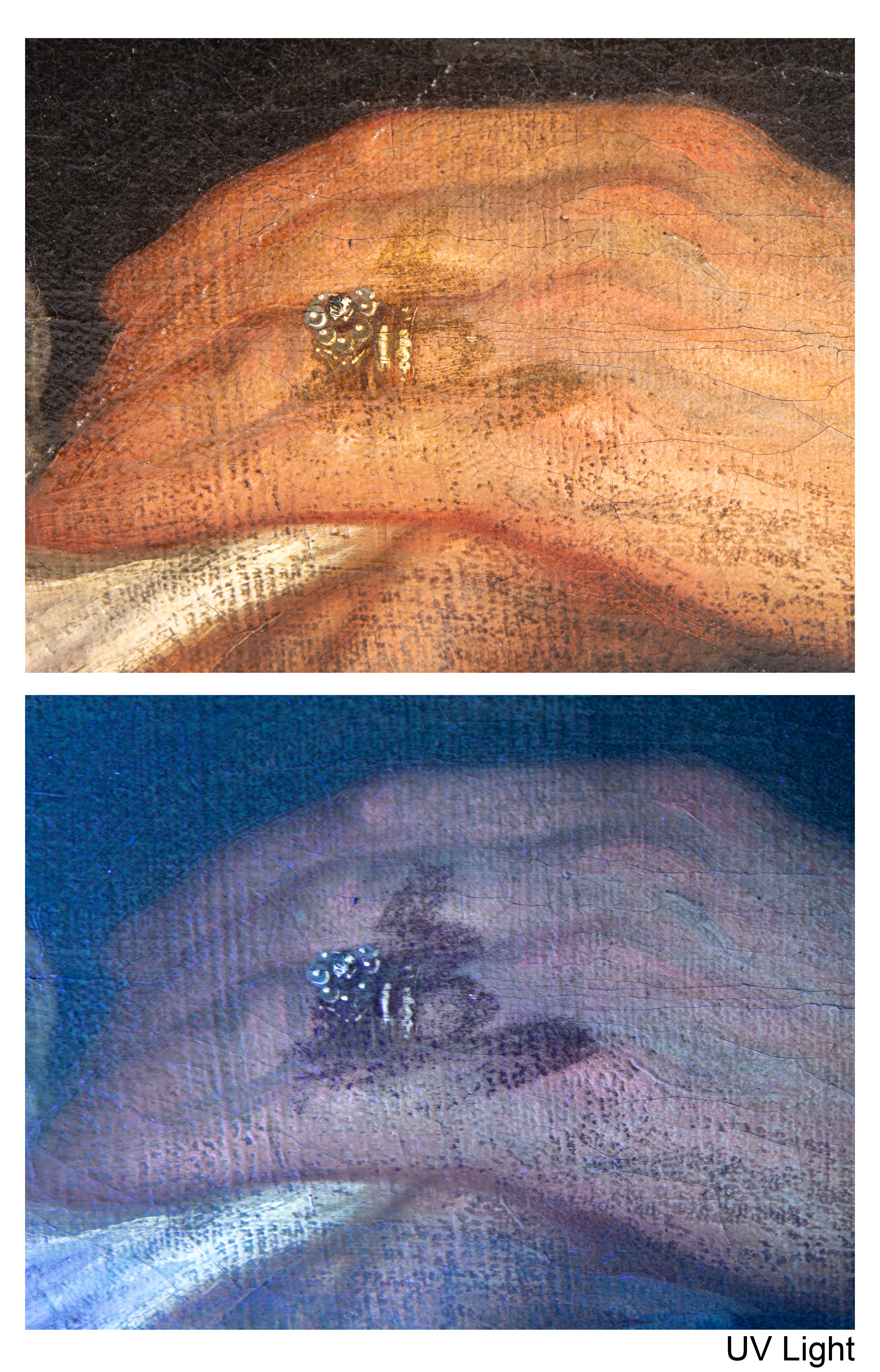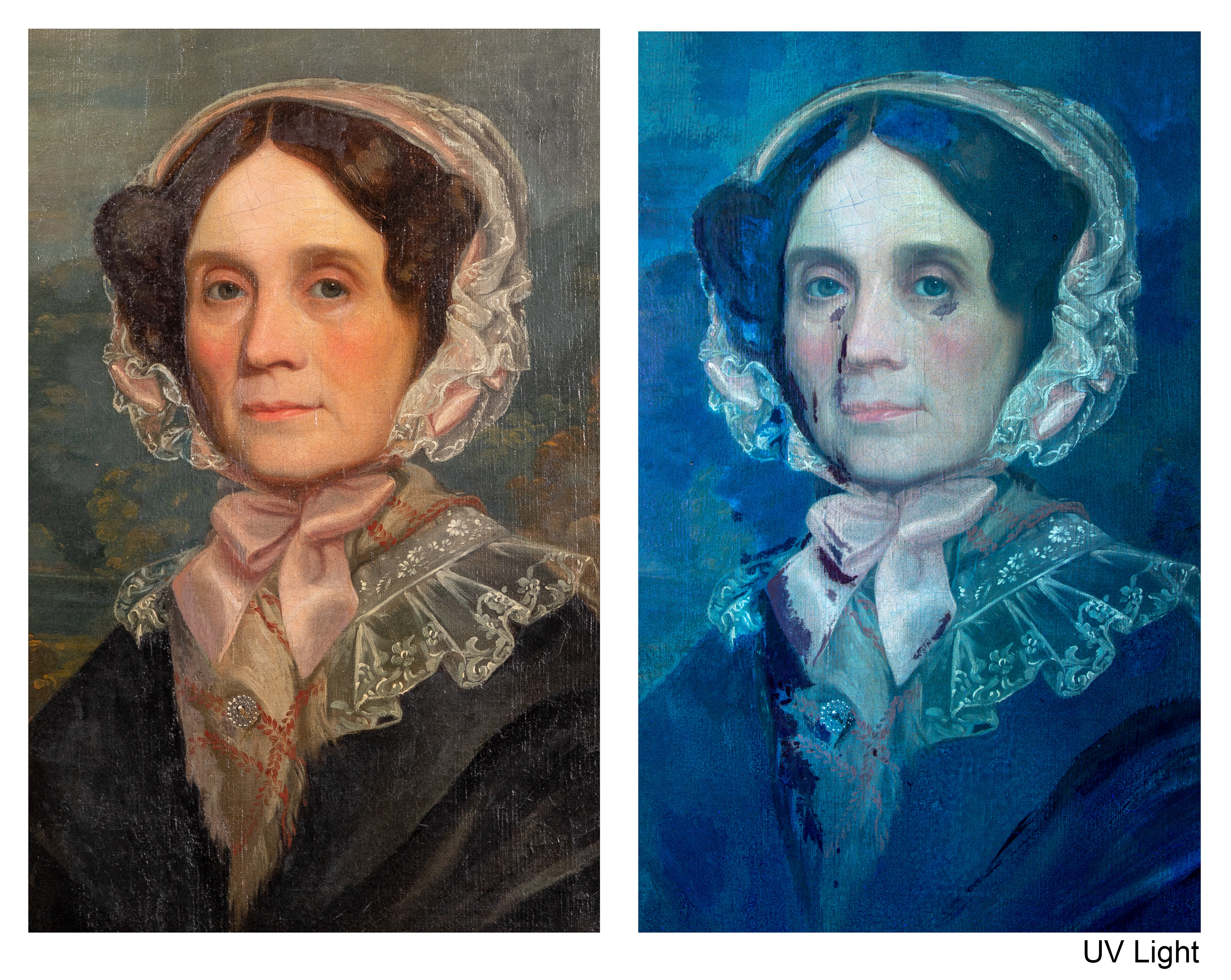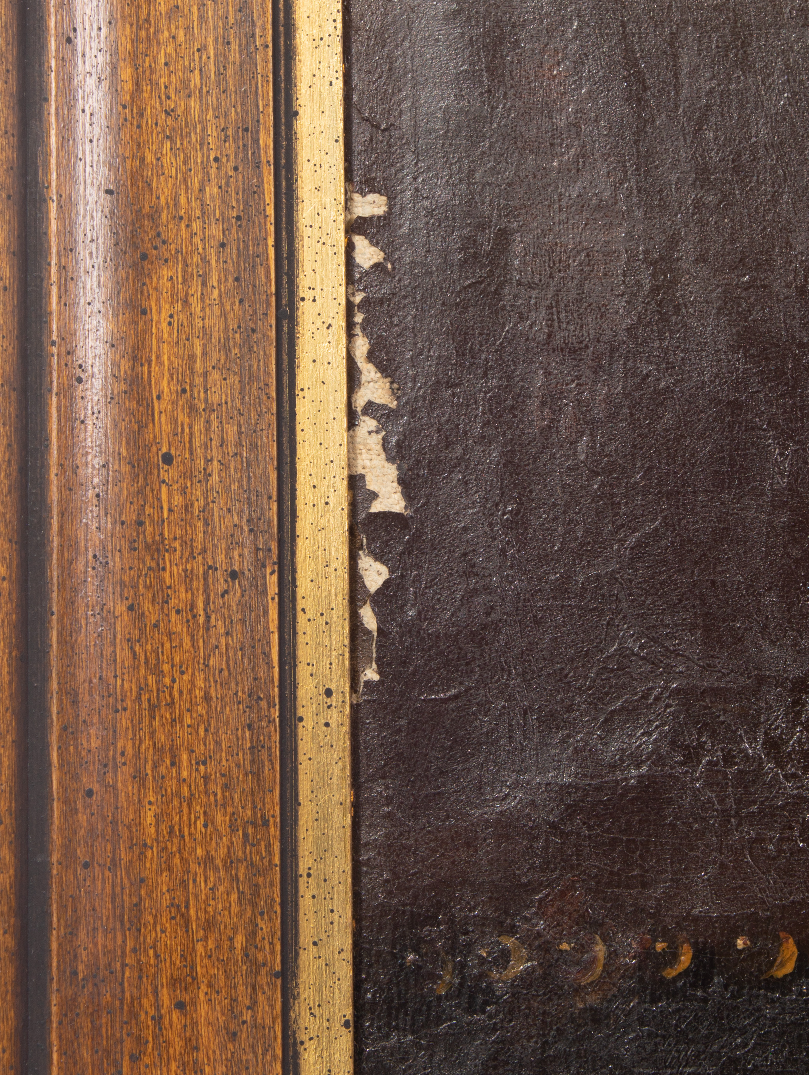 canvas mounted on board, areas of inpainting throughout, paint loss along edges, scratch in black field near bottom, stretcher marks, bubbling on canvas, craquelure overall, frame having minor chips