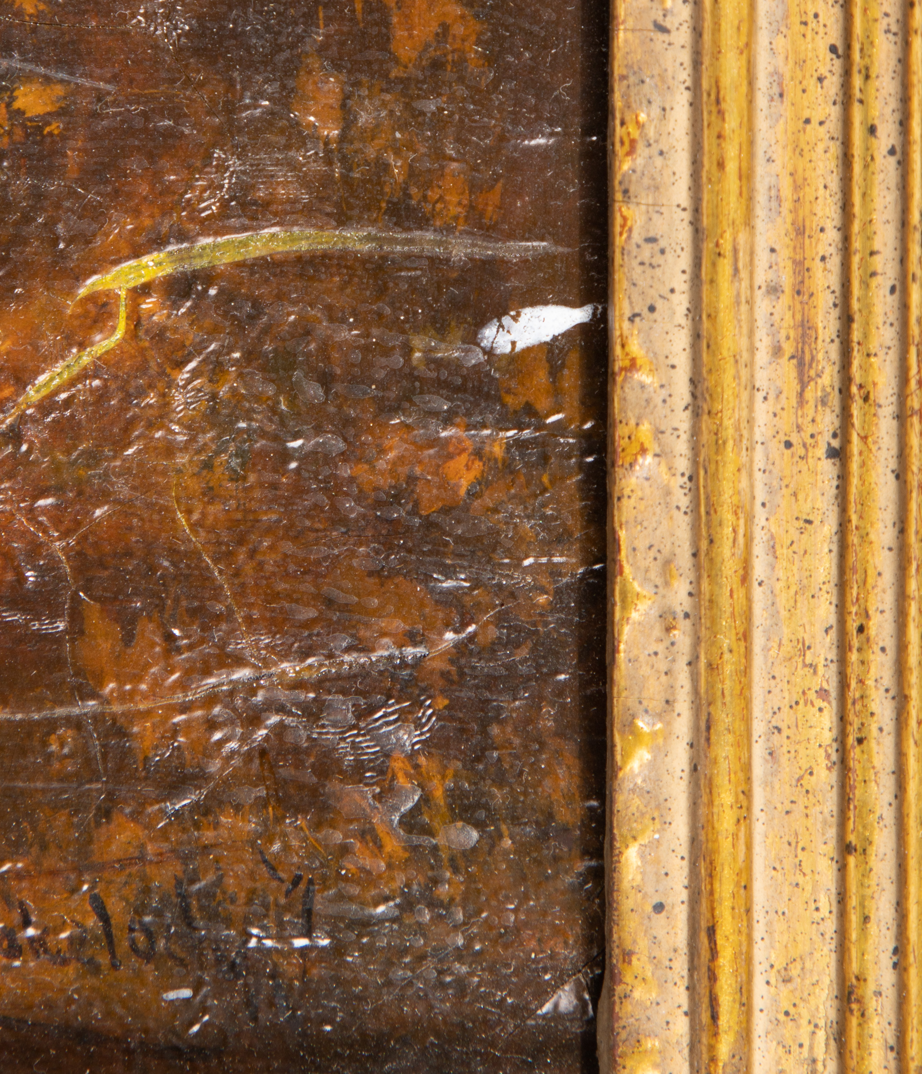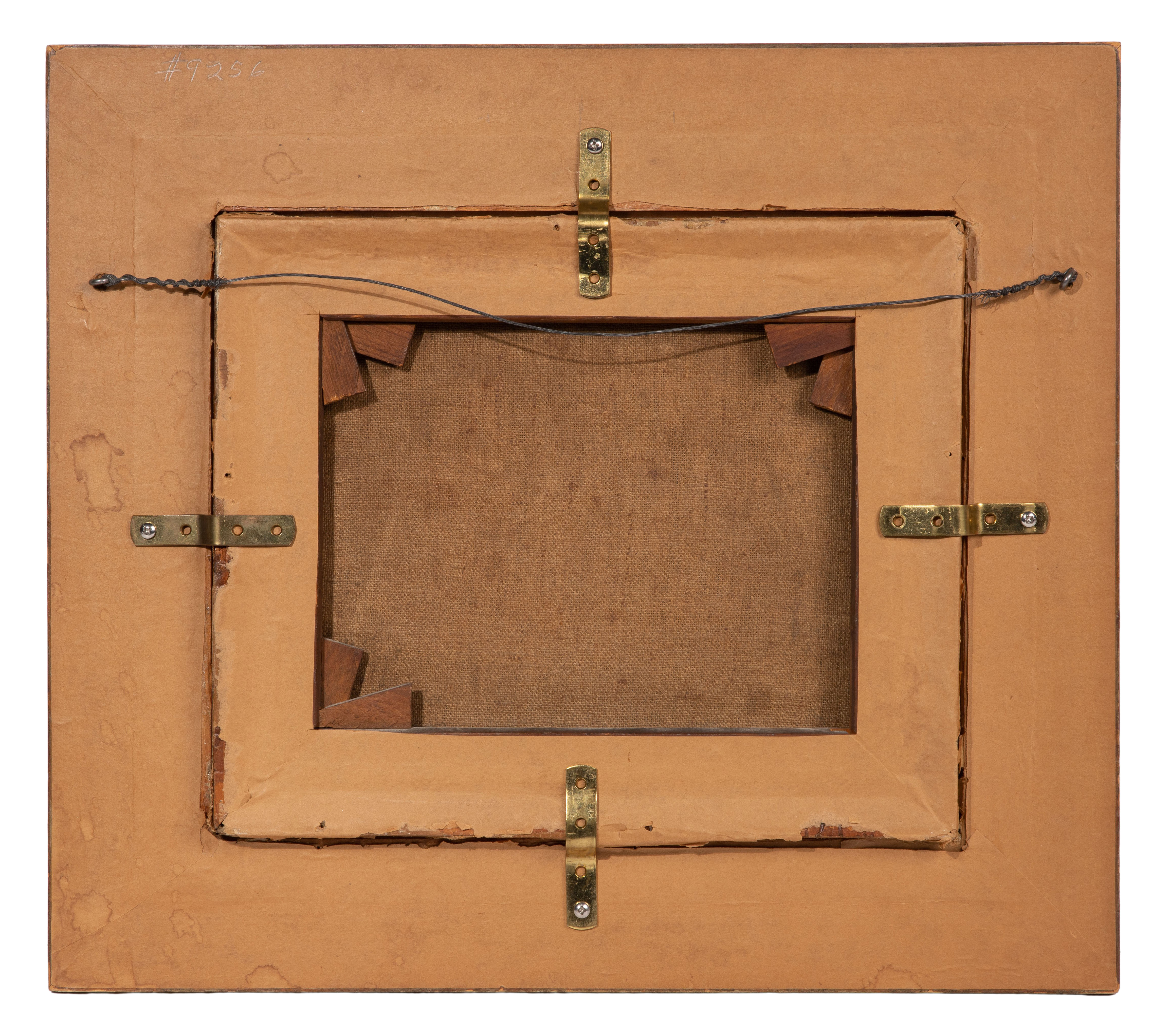 Condition: inspected under UV lighting, heavy craquelure overall, minor chips having missing paint, minor areas of white paint splatter, minor inpainting lower left, frame having minor wear