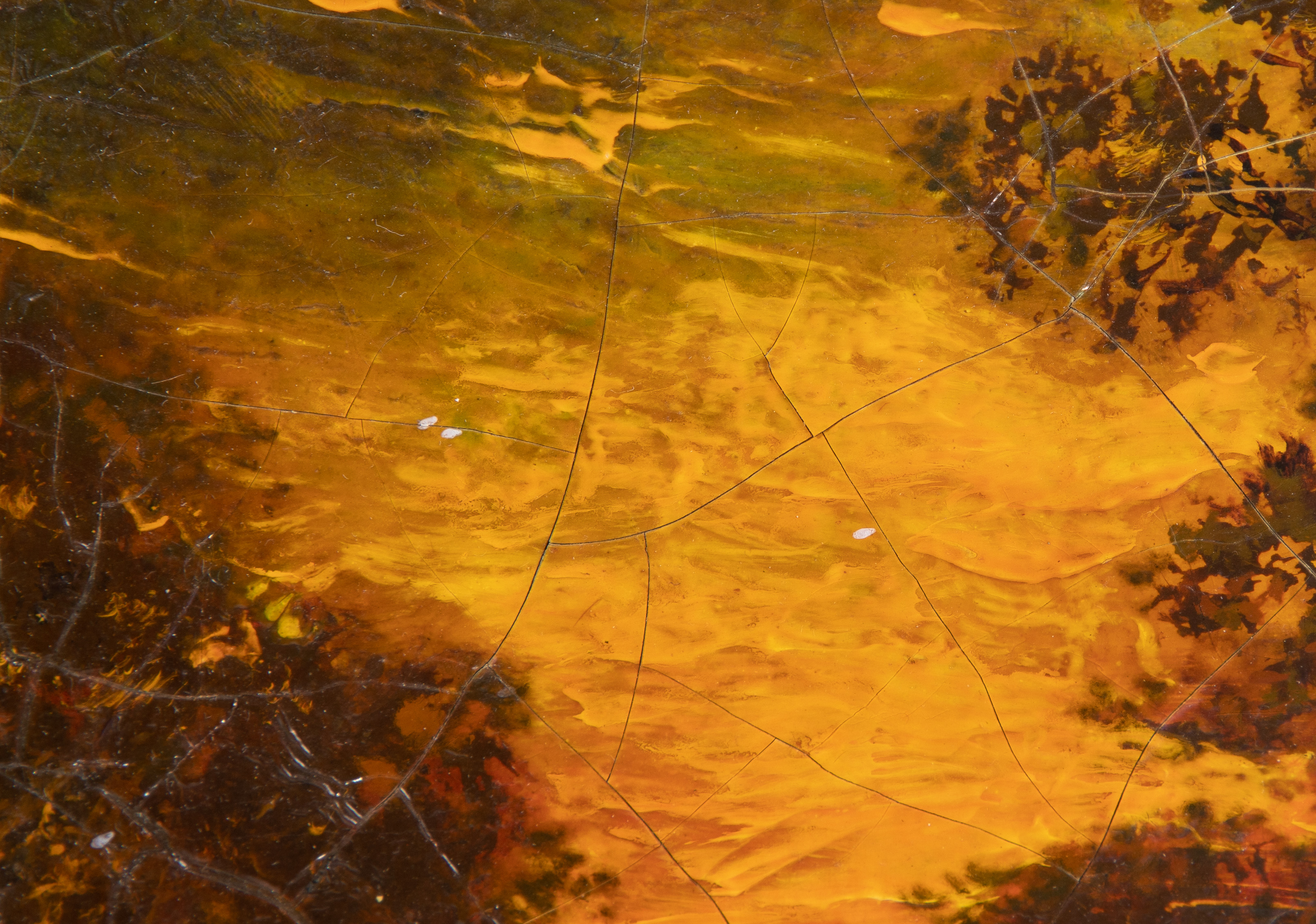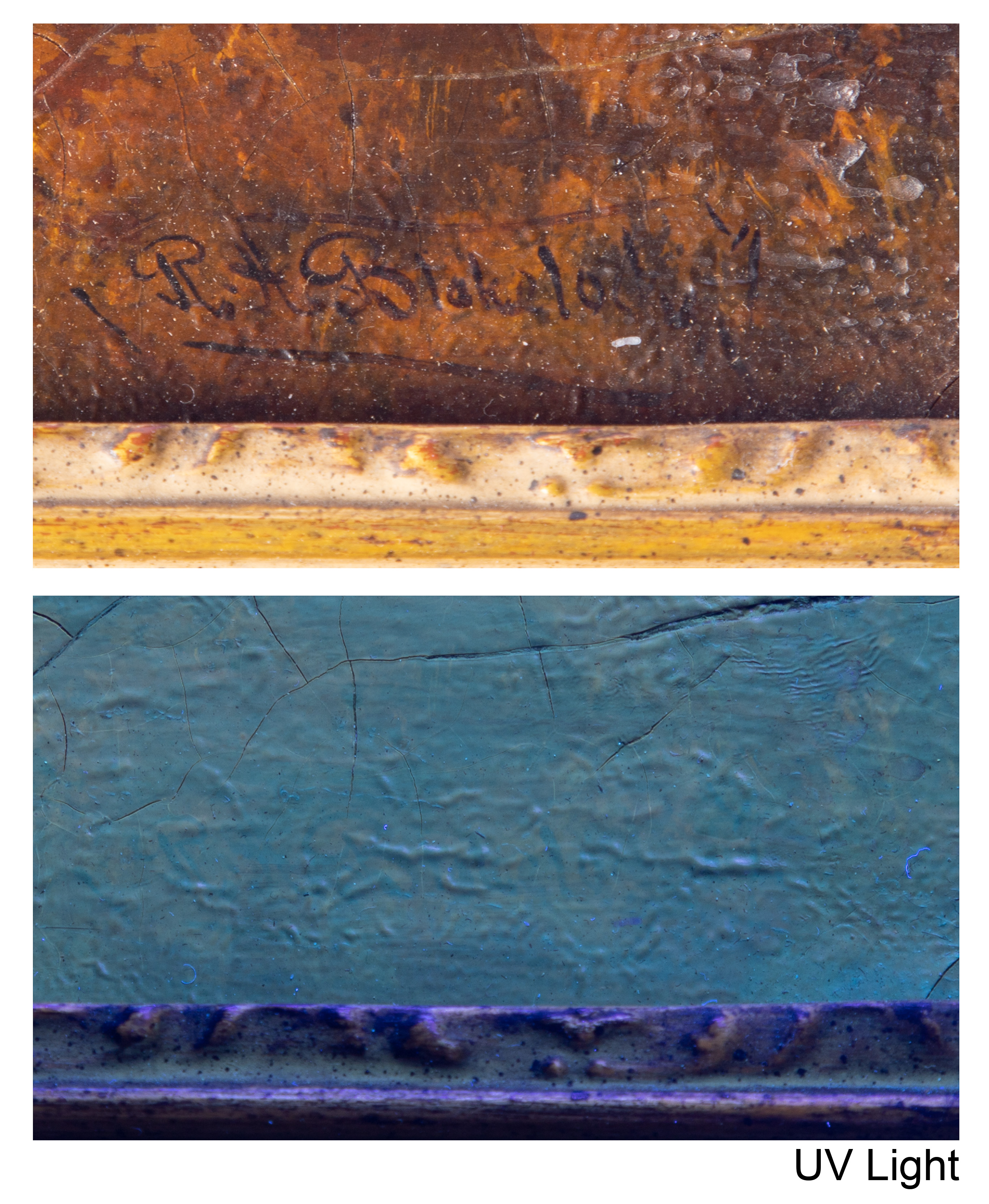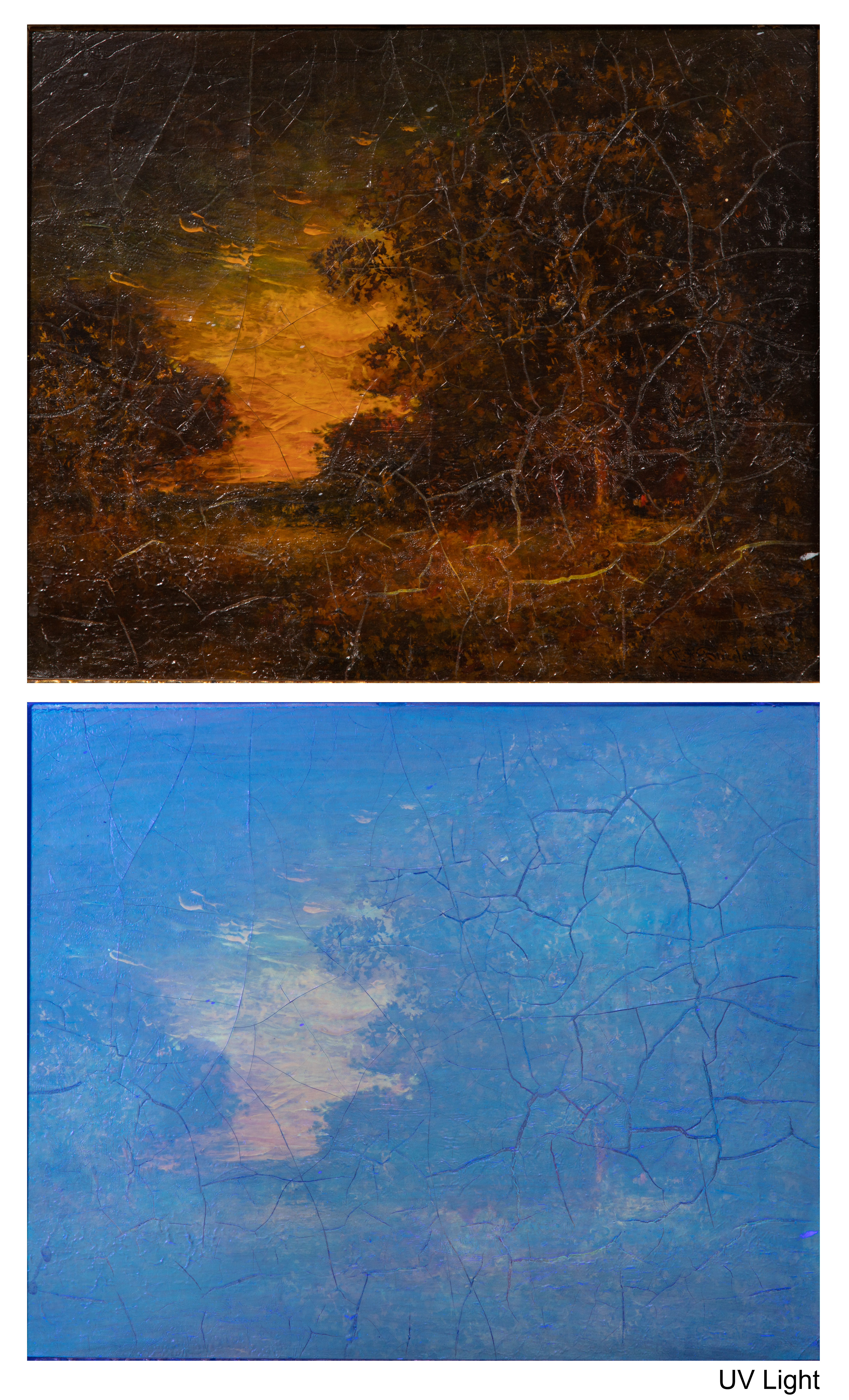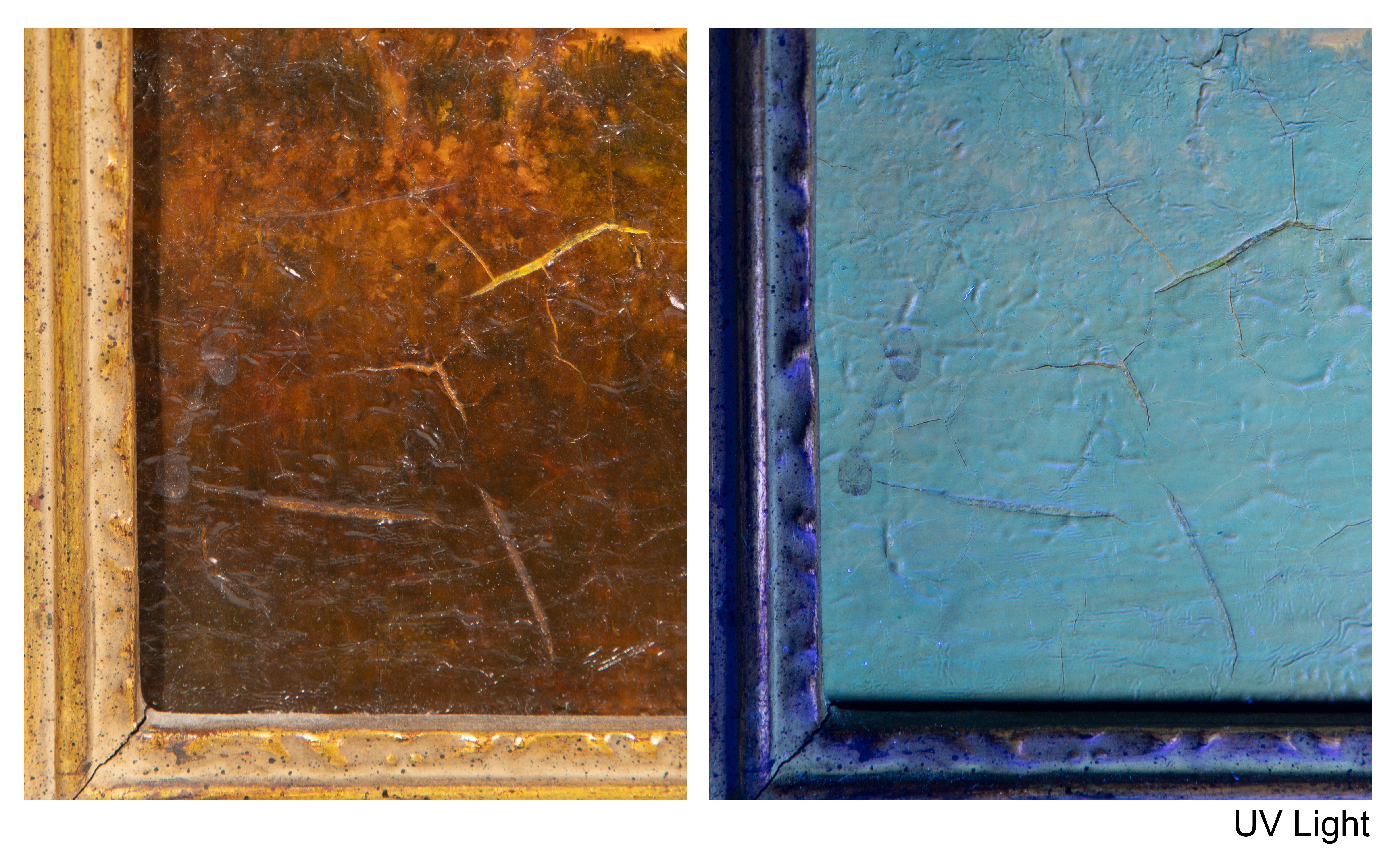 inspected under UV lighting, heavy craquelure overall, minor chips having missing paint, minor areas of white paint splatter, minor inpainting lower left, frame having minor wear