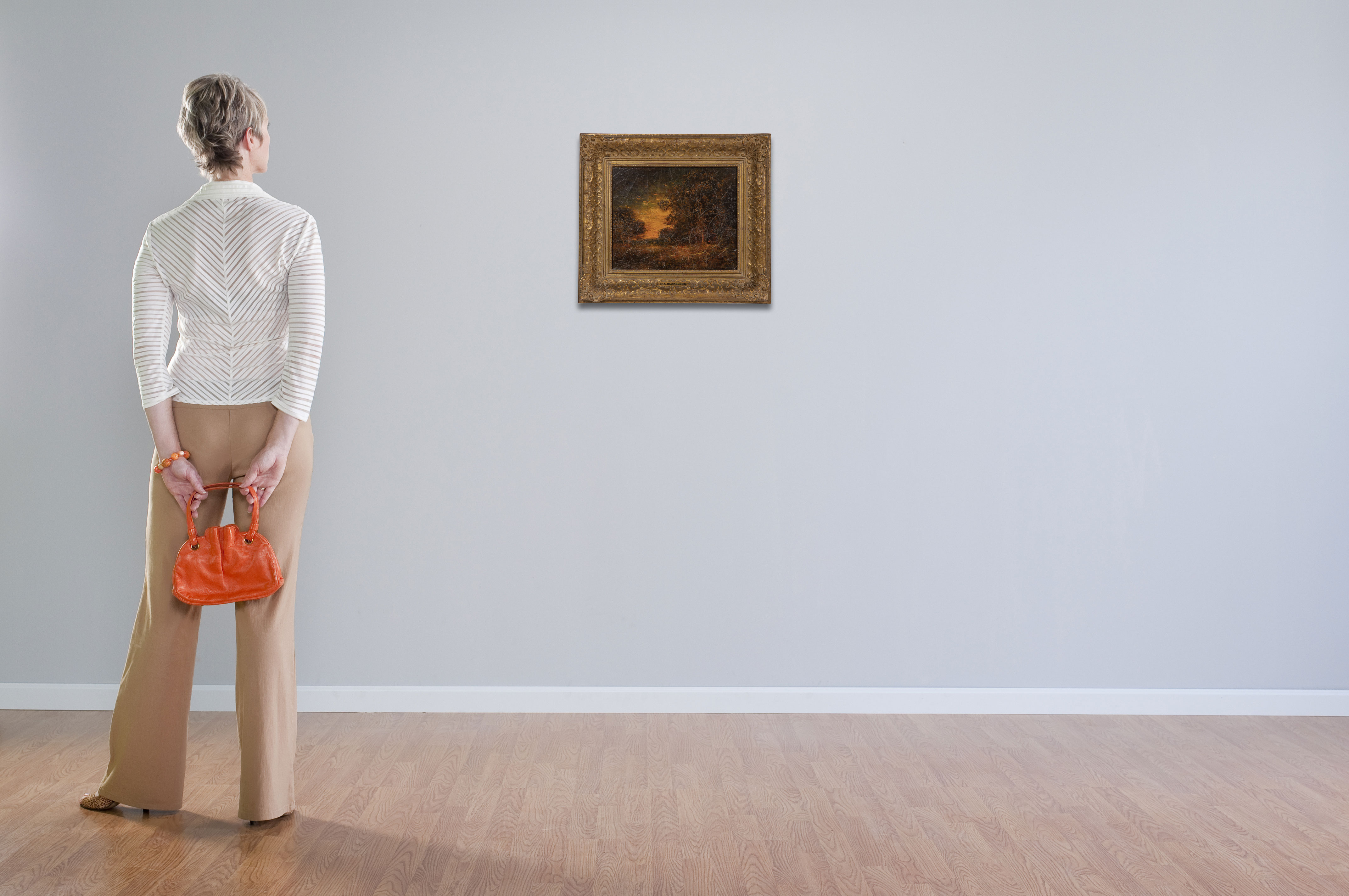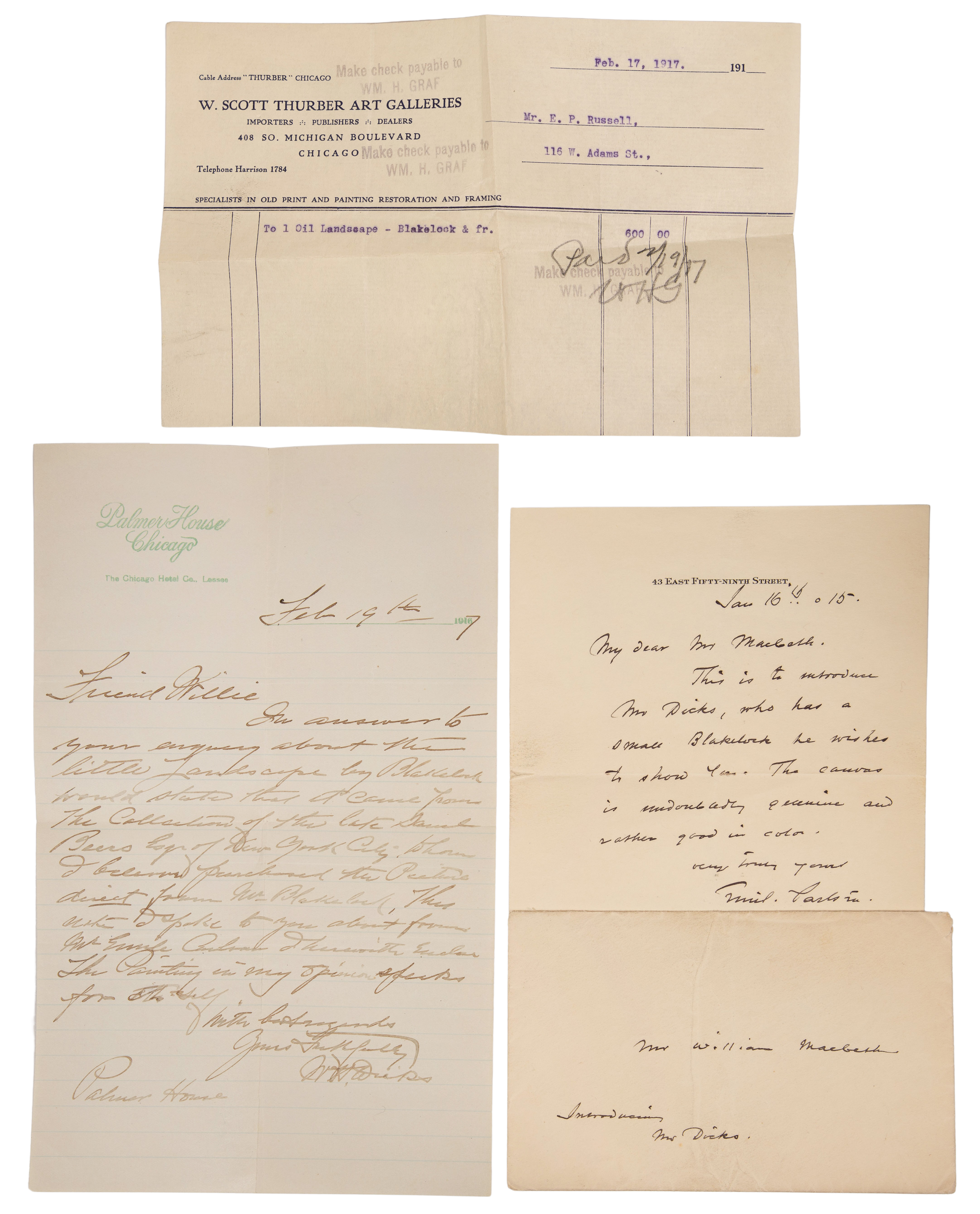 Undated, signed lower right, depicting a forest landscape at sunset, in a gold-tone painted wood frame having name placard at center, including letter stating authenticity, original receipt dated 1917 from W. Scott Thurber Art Gallery