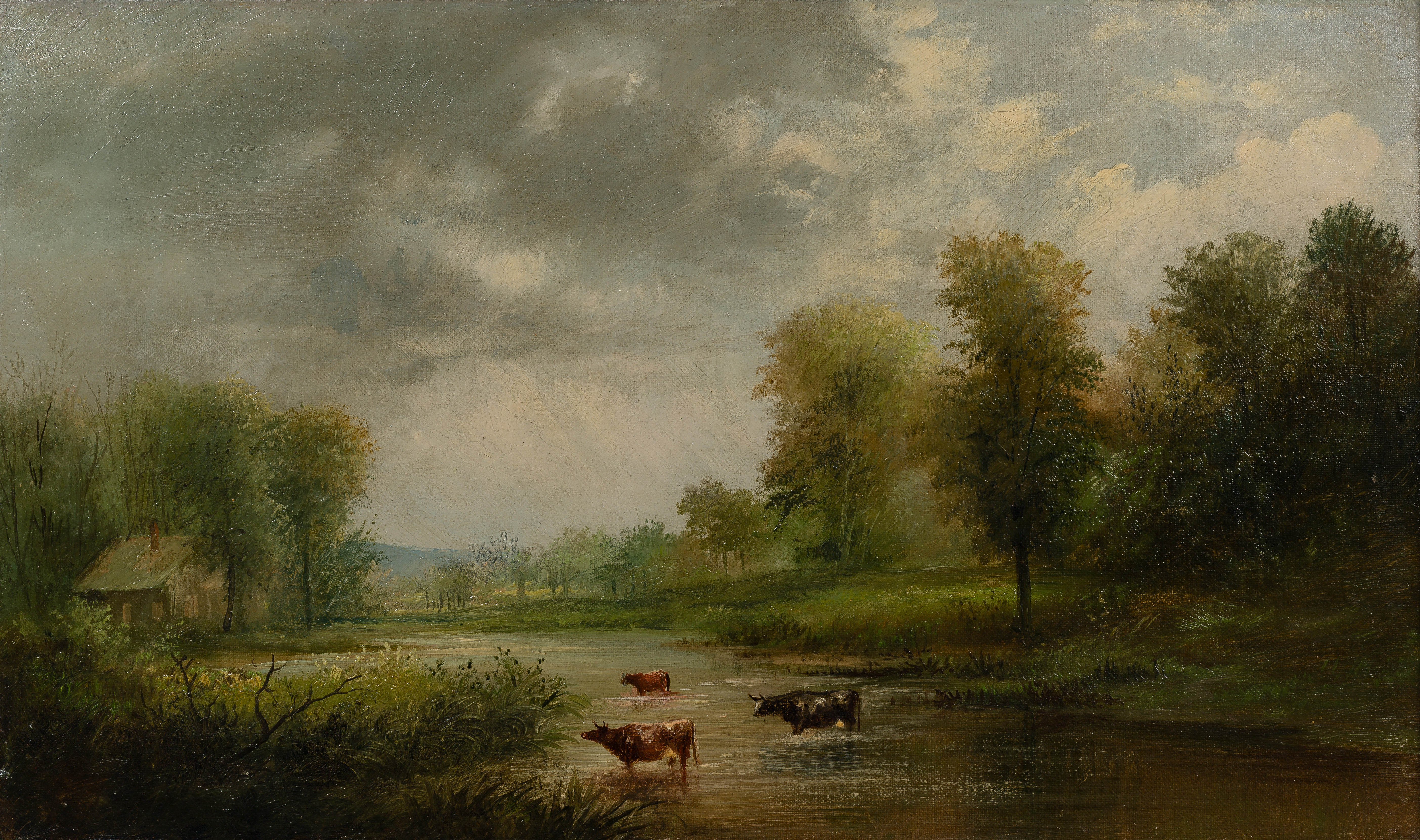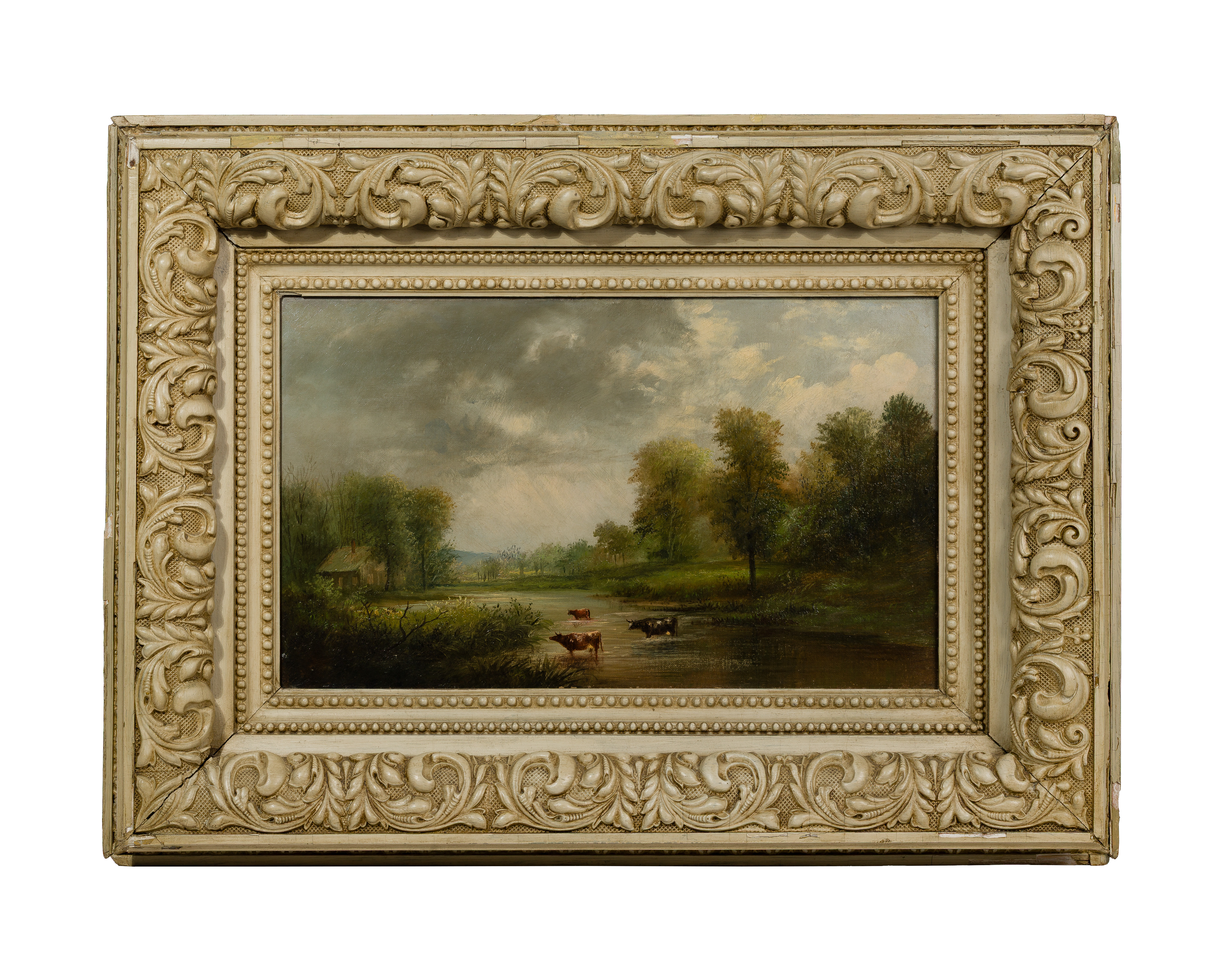 Undated, unsigned, depicting three cows in a stream, in a white gesso carved frame