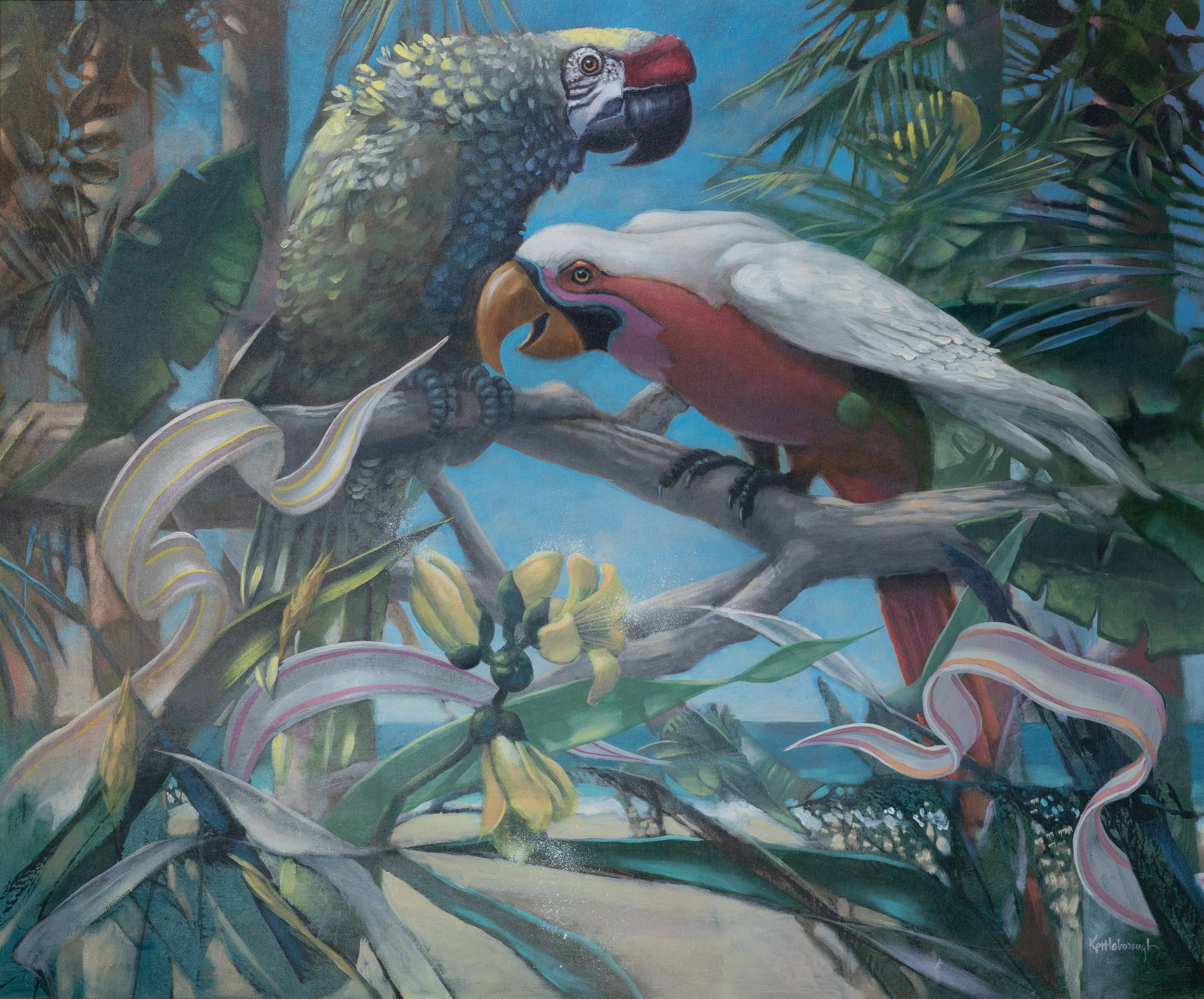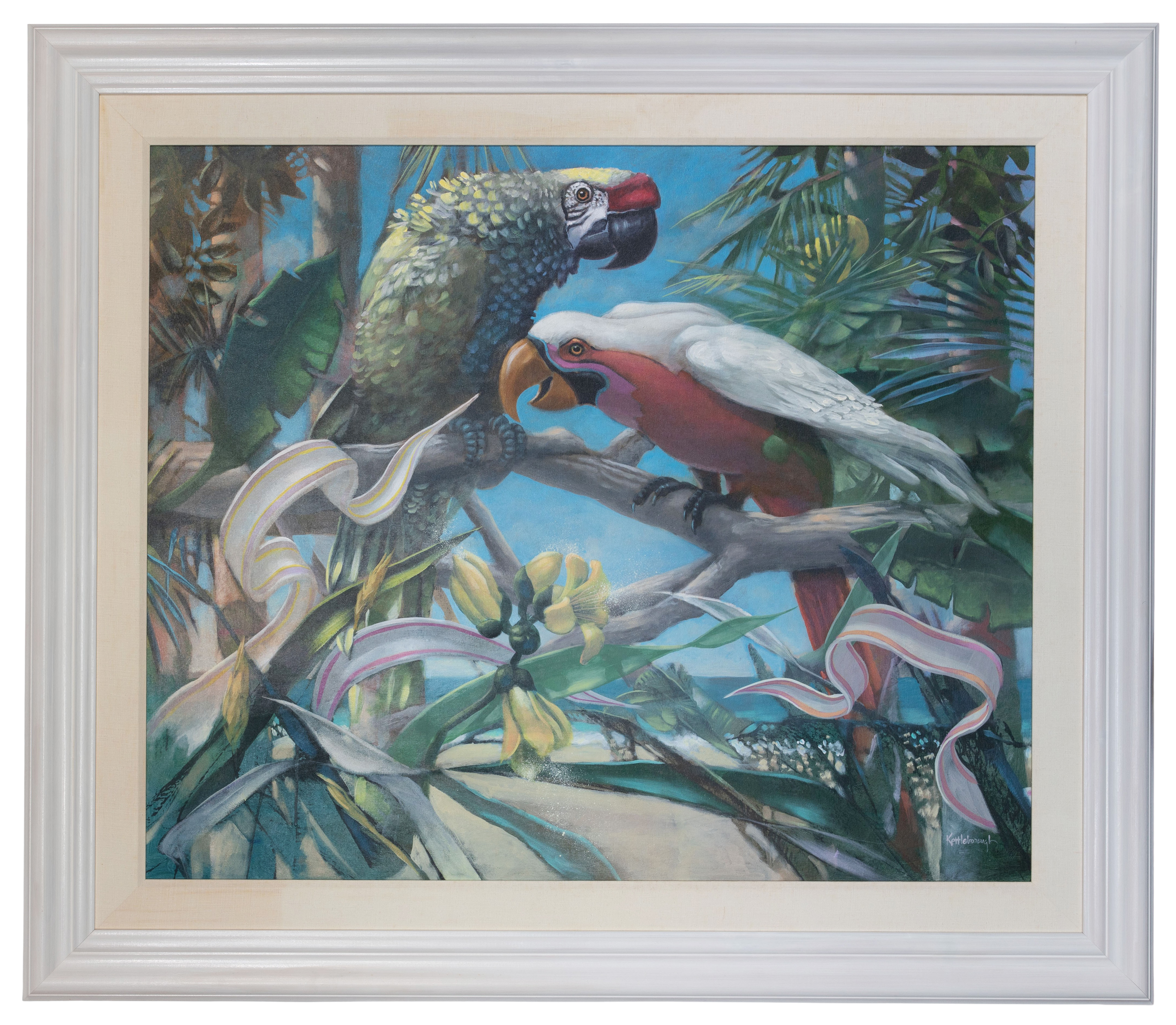 Undated, signed lower right, depicting parrots in a lush jungle, in a painted wood frame