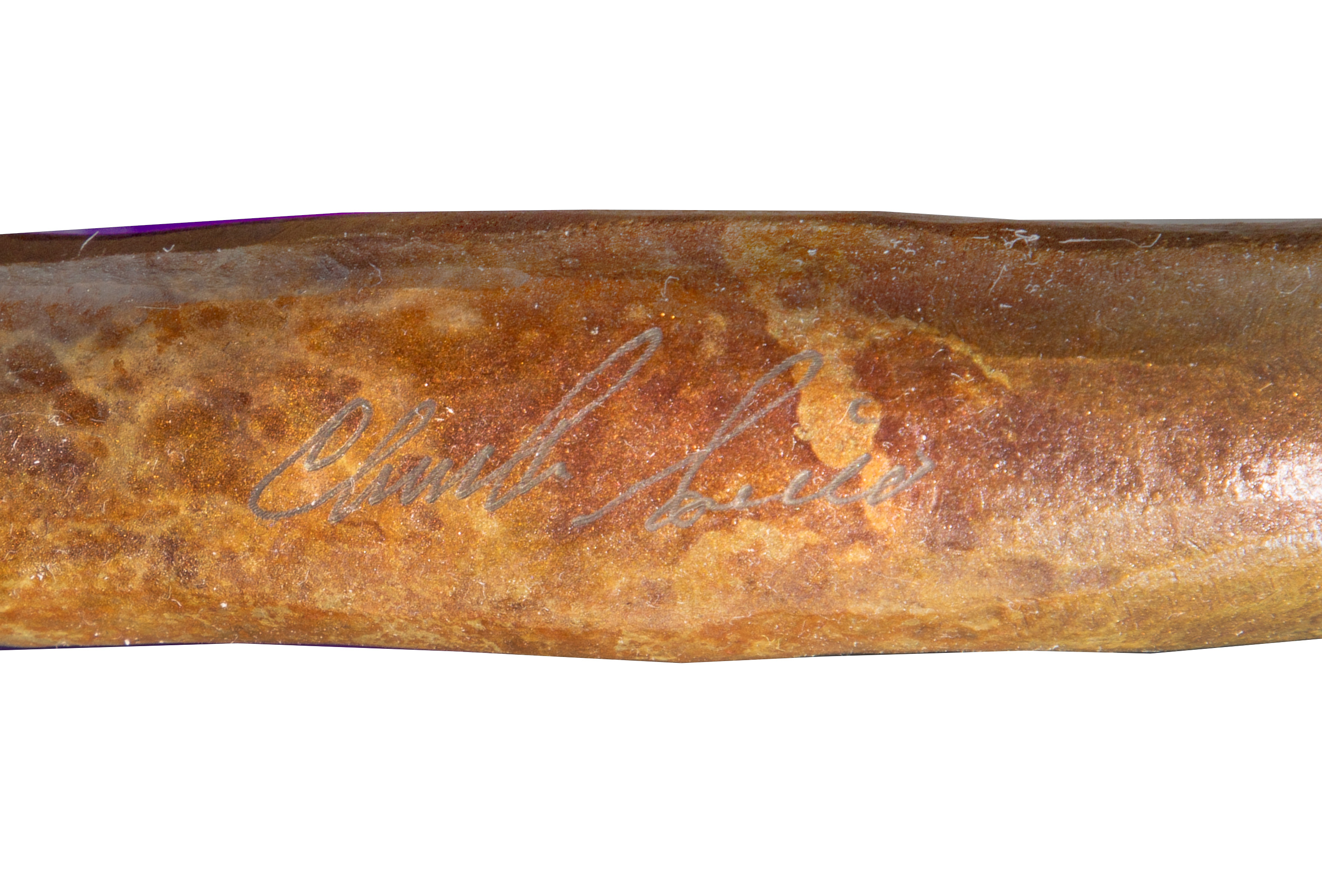 Undated, engraved signature on upper surface of one of three branching supports of the bronze base for the trumpet flower shaped blown glass