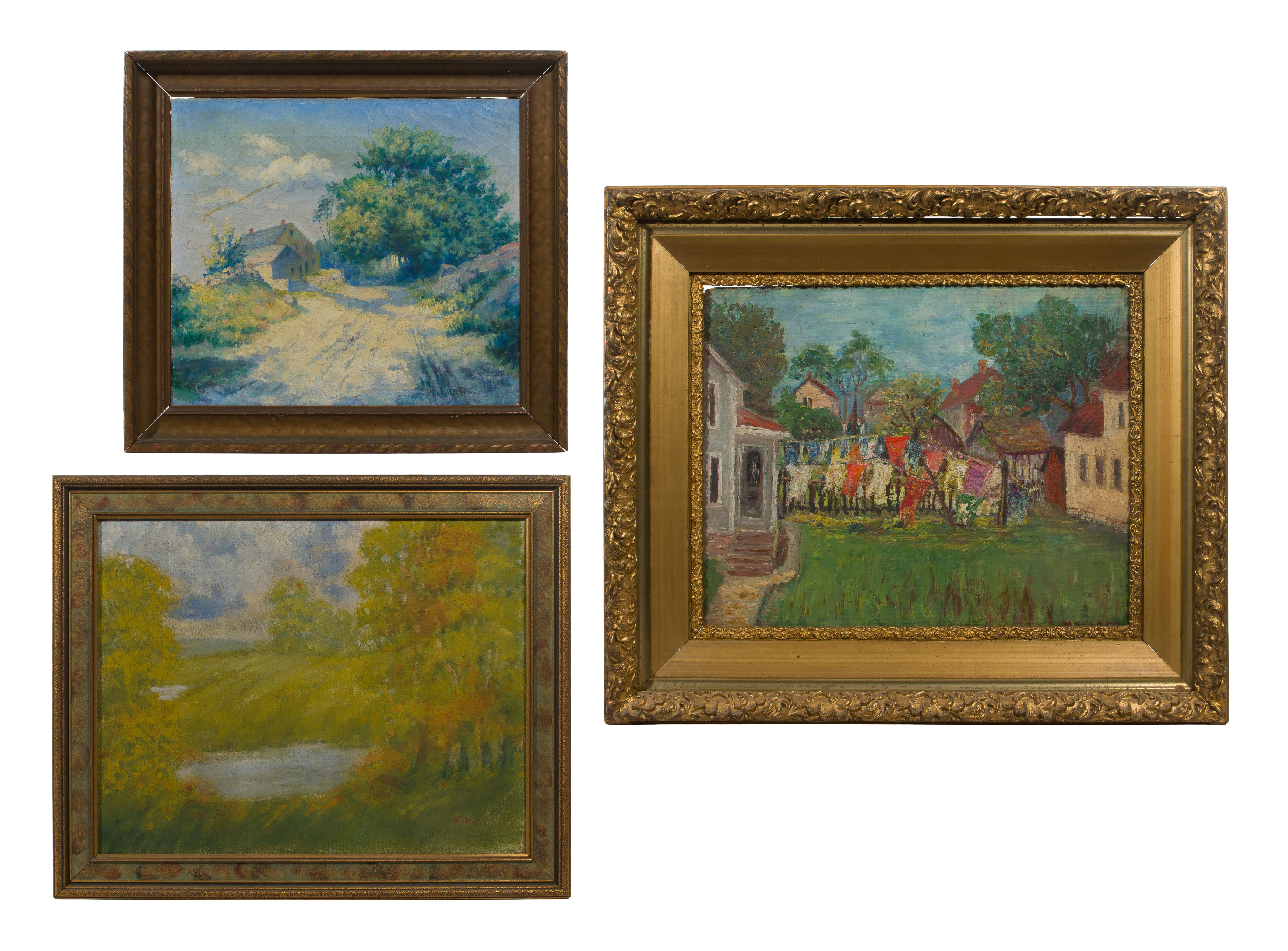 (3) total items including an undated, signed lower right, depiction of a farmhouse near a road, in a gold-tone wood frame; together with oils on board including a signed ‘M. M. Clark’ backyard scene and an illegibly signed depiction of a forest pond, all framed