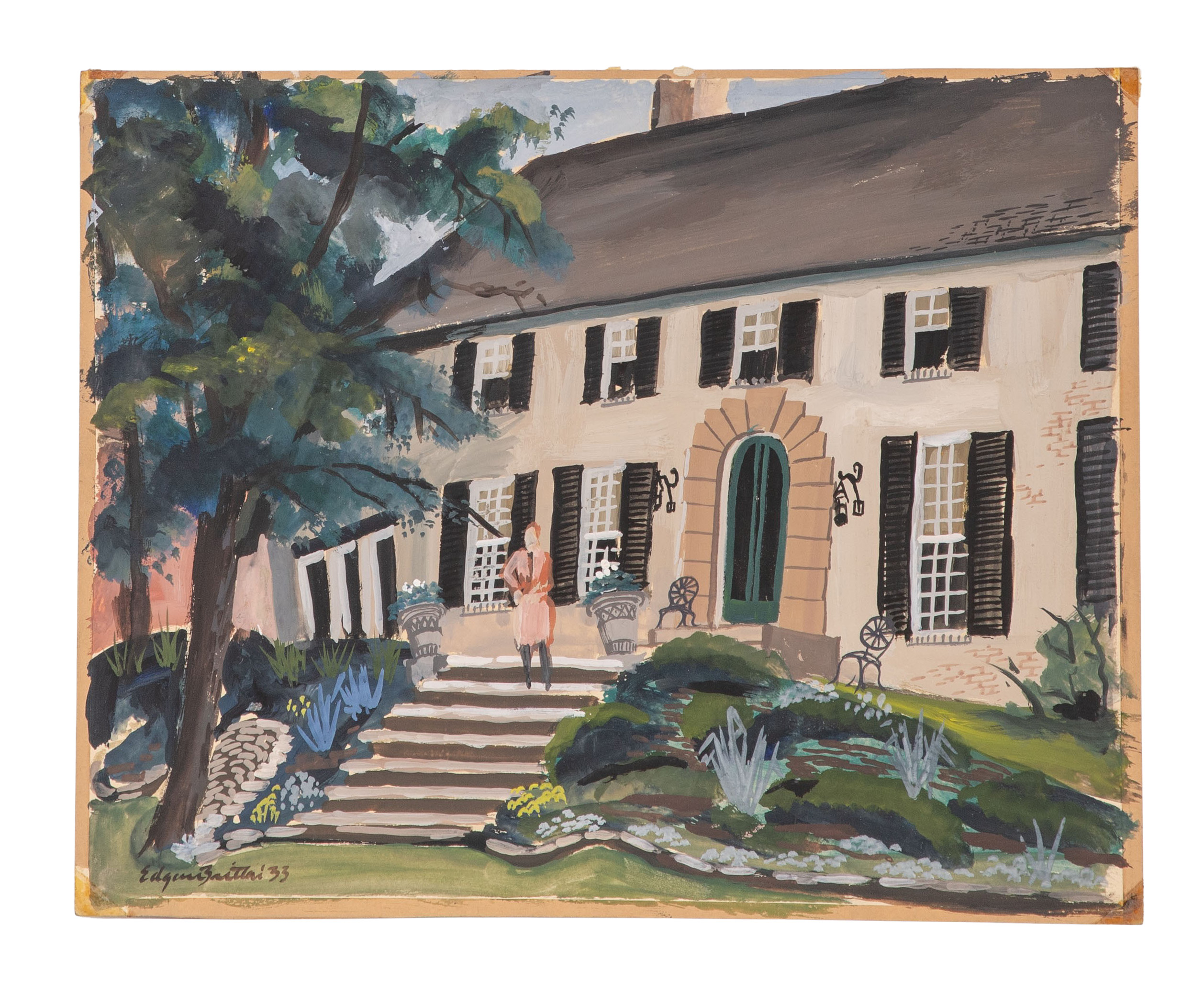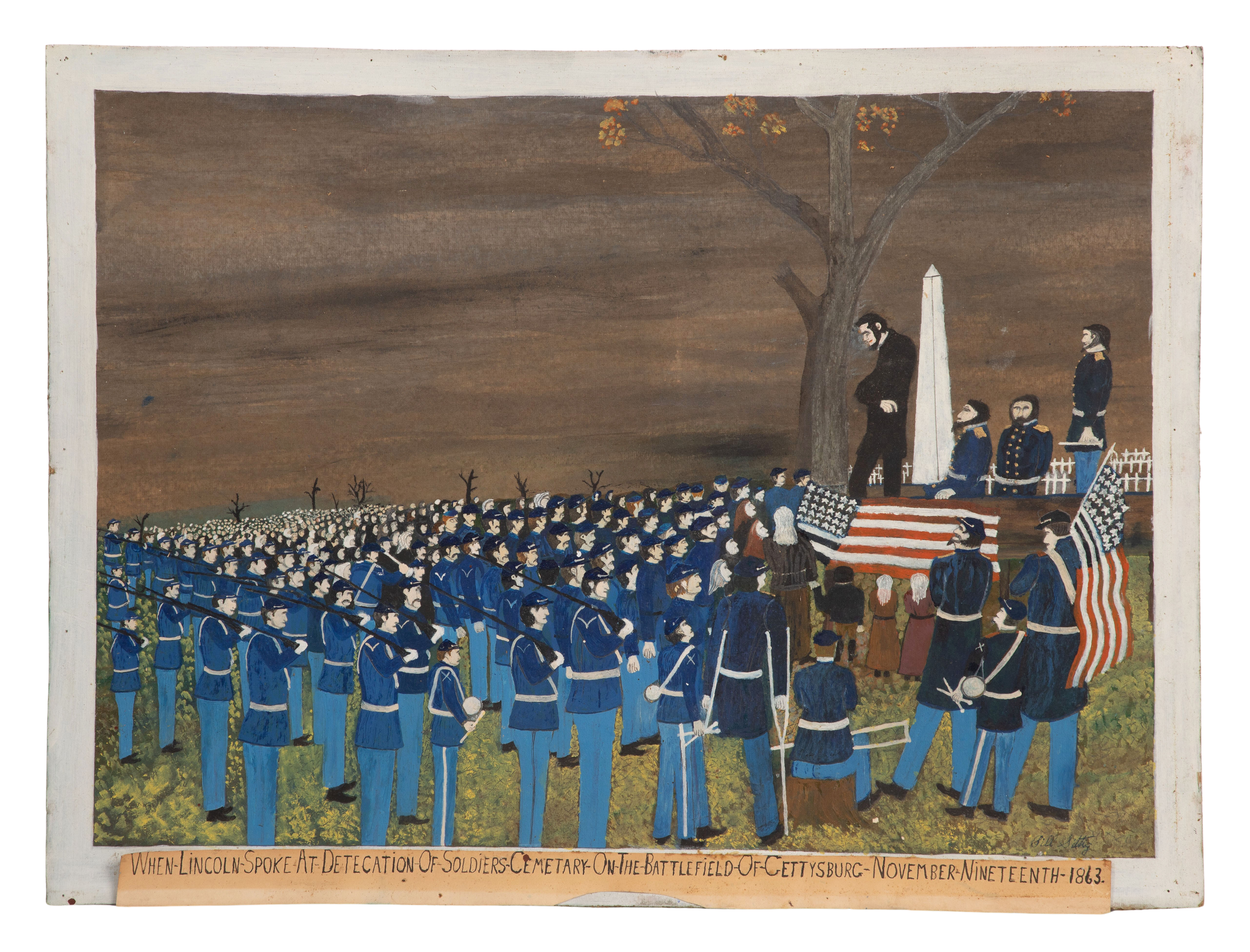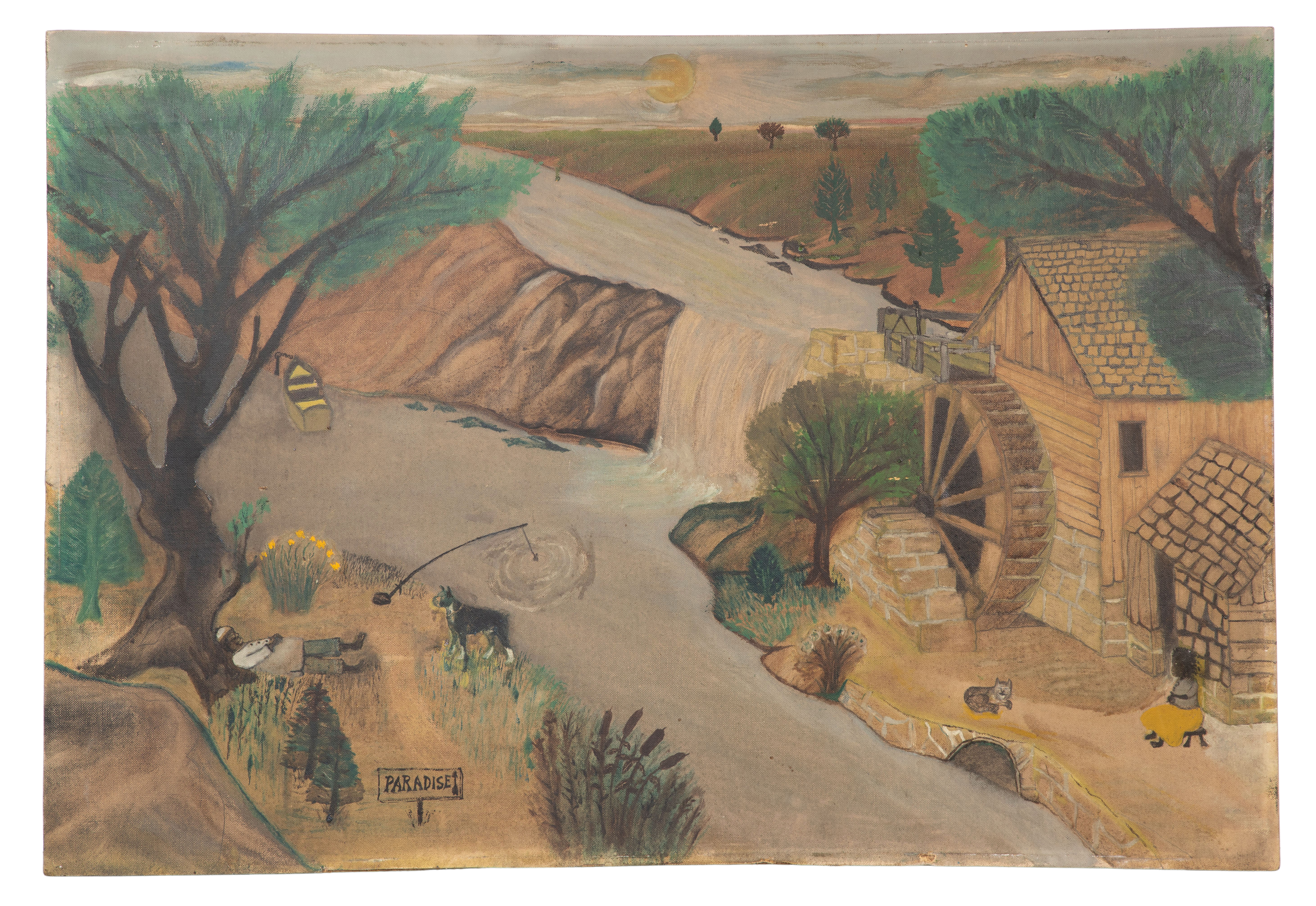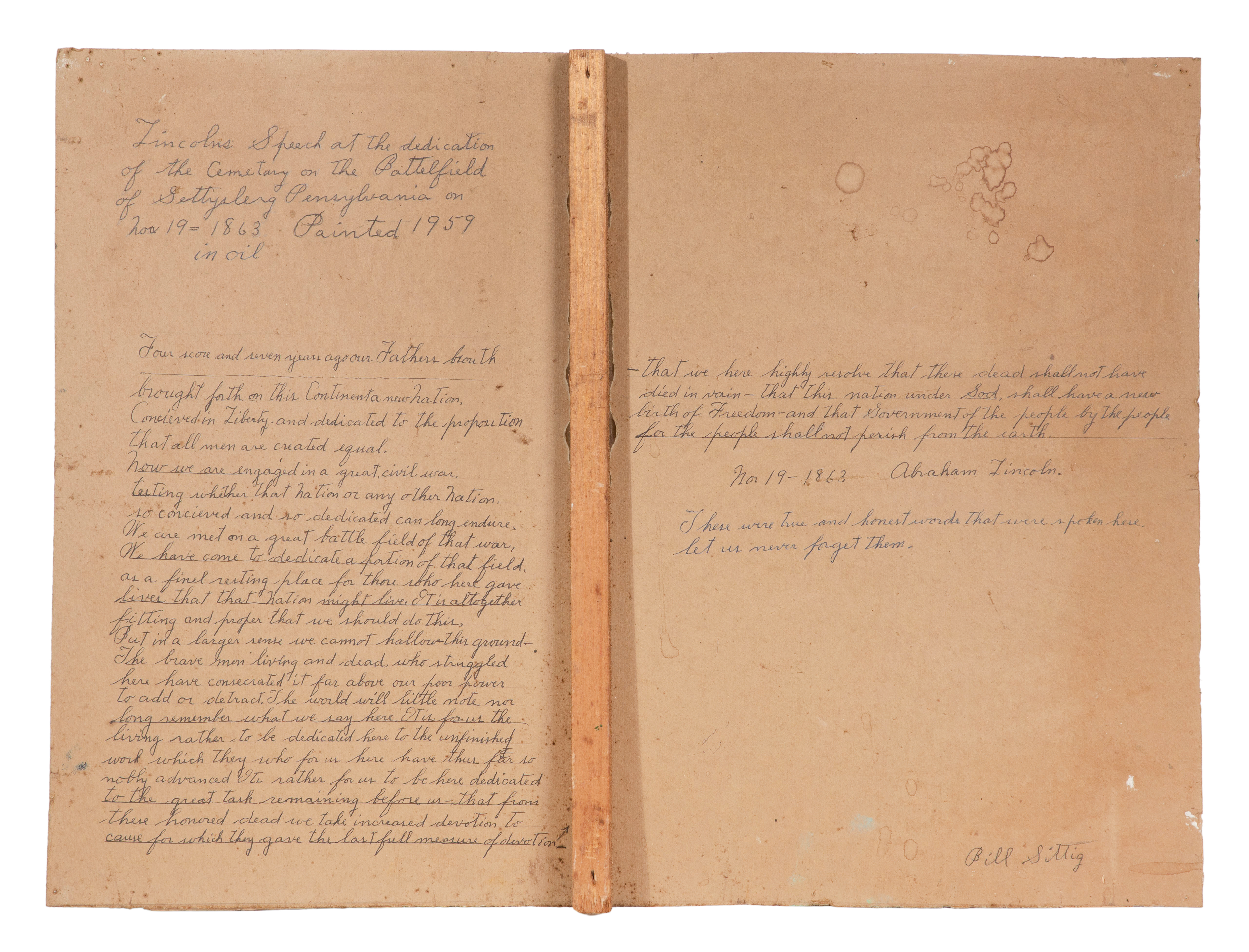(3) items including an undated, signed ‘Bill Sittig’ lower right front and back oil on cardboard depiction of Lincoln’s Gettysburg Address having a paste-on caption strip and a lengthy inscription verso and having a wood support strip, an undated, pencil inscribed ‘Sanders Pawnee Ill’ verso oil on board, titled ‘Paradise’ on sign in foreground, depiction of fishing near a mill and water wheel and a dated ’33’, indistinctly signed gouache on paper depiction of a house and terraced garden, all unframed