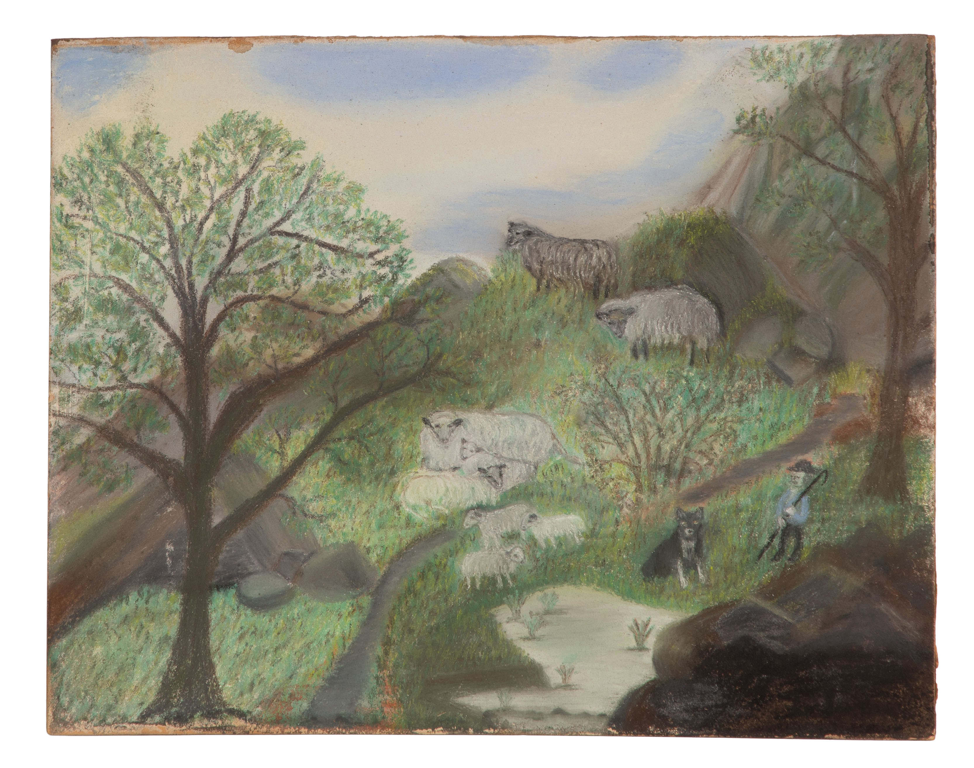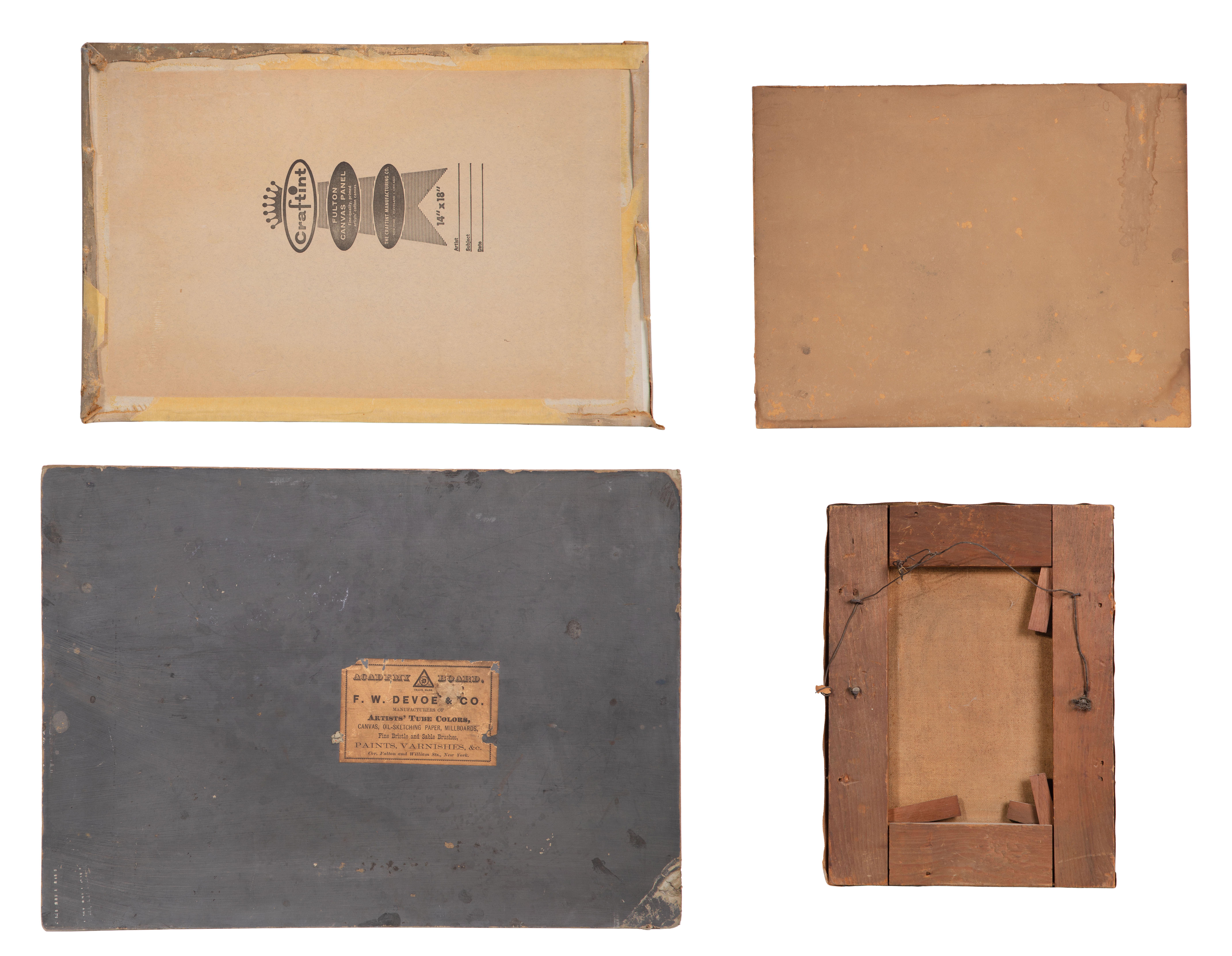 Fritz having frame impression and friction wear at edges, Mitchell having scrapes, loss to surface lower left and at edges and corners, oil on canvas lifting from canvas panel and still shows stretcher impressions, pastel having edge wear