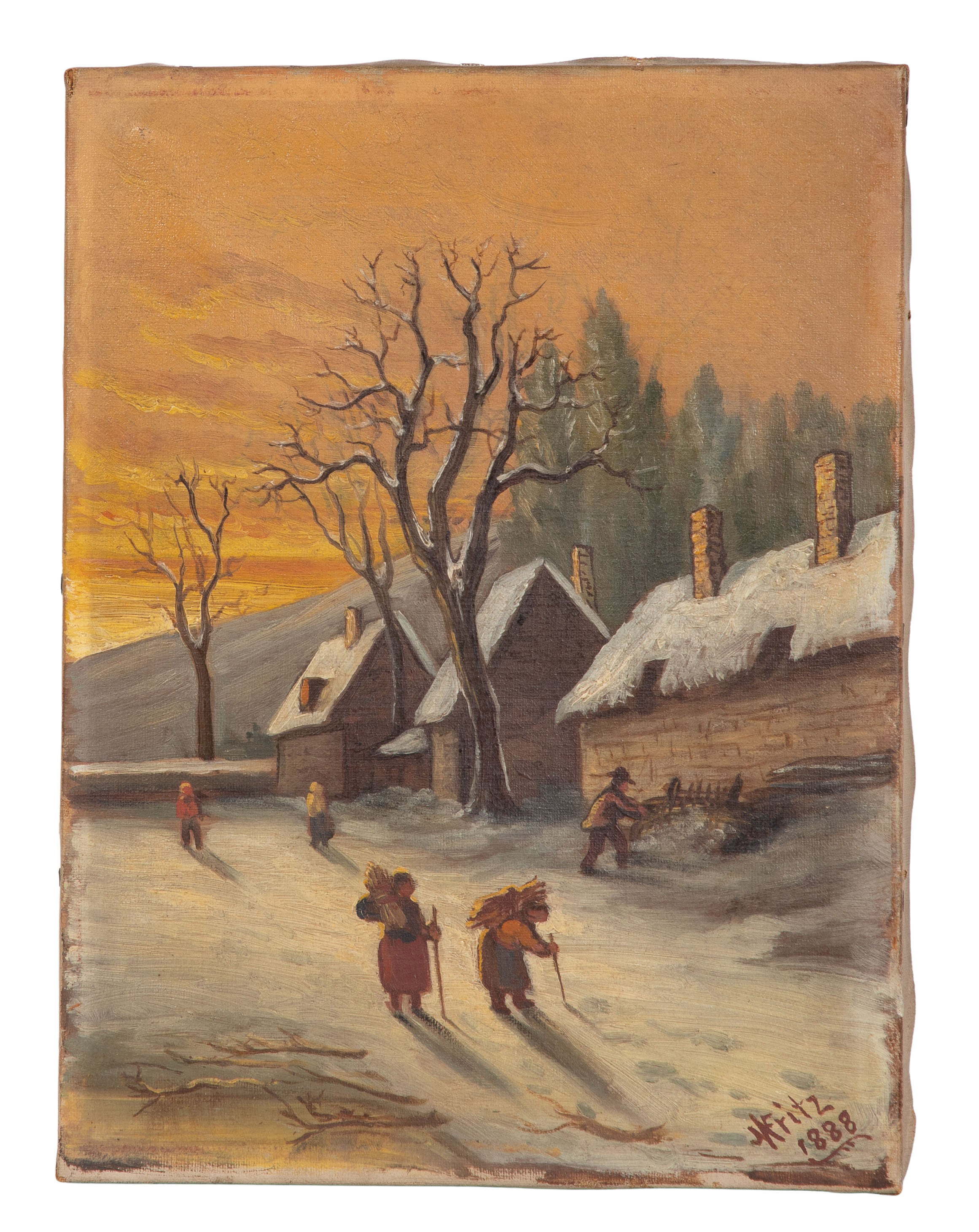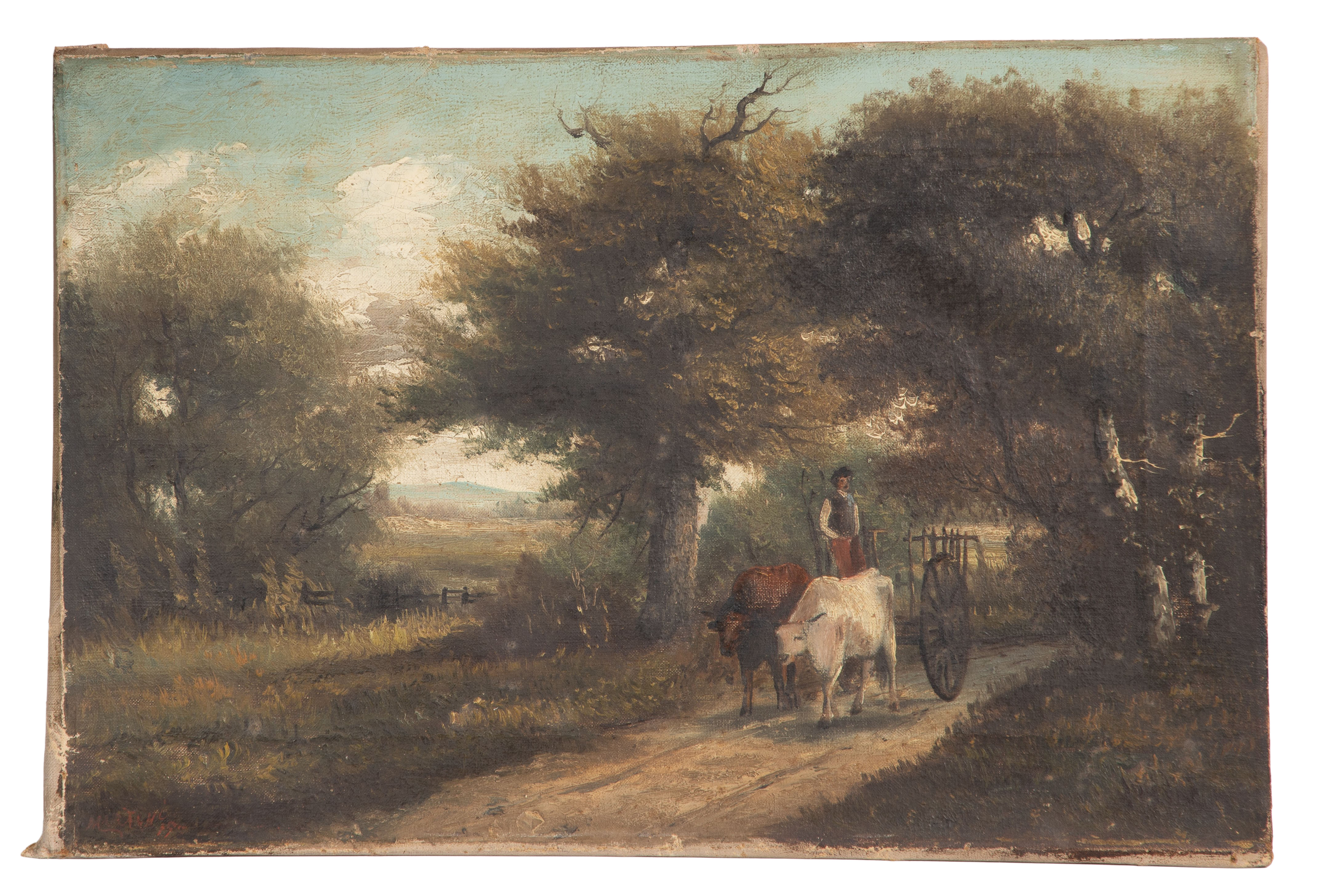 (4) total items including a dated and signed ‘M Fritz / 1888’ oil on canvas village scene at sunset, an oil on board signed ‘A. Mitchell’ lower left depicting a lakeside hunting scene, an unsigned oil on canvas laid onto a canvas panel depicting an oxen cart in landscape; together with an unsigned pastel pastoral landscape, all unframed