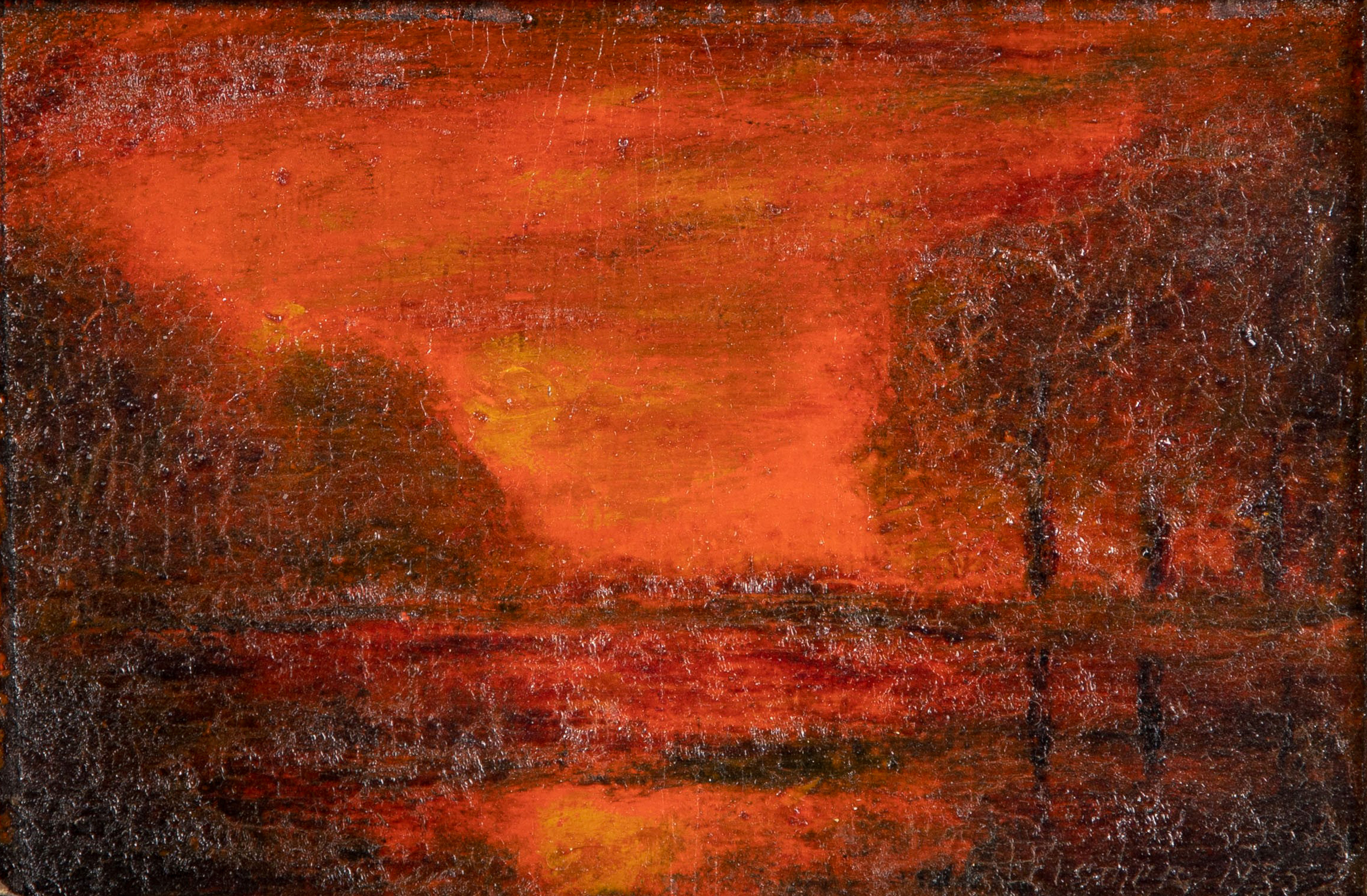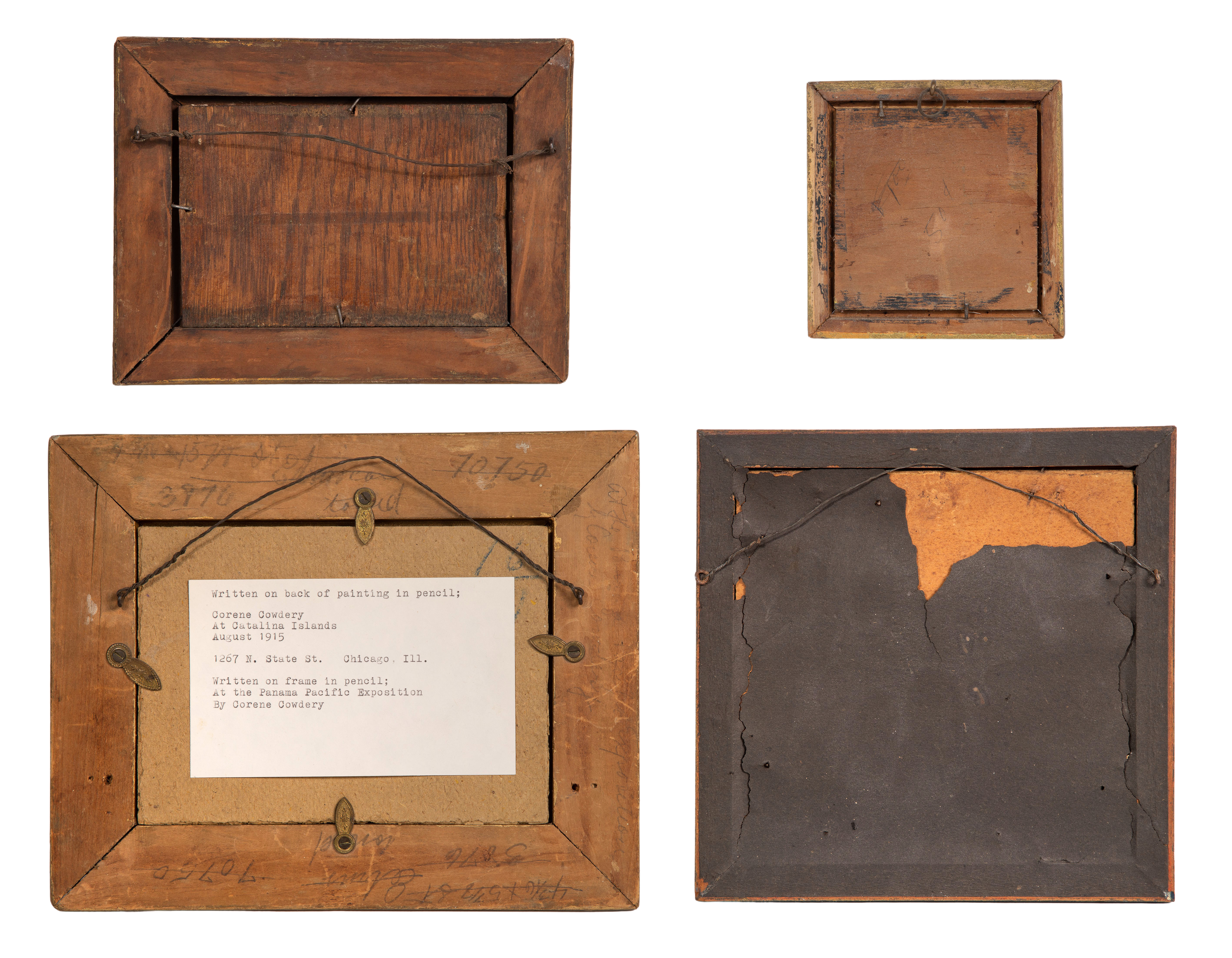 (4) total items, all miniature oils on board, including a 1915 Cowdery, depicting figures viewing watercraft and islands, an attached card giving a transcription of pencil notations on board, in gold-tone frame; together with an indistinctly signed depiction of a boat, sails lowered, at dock, an unsigned landscape at sunset and an unsigned still life, all in wood frames