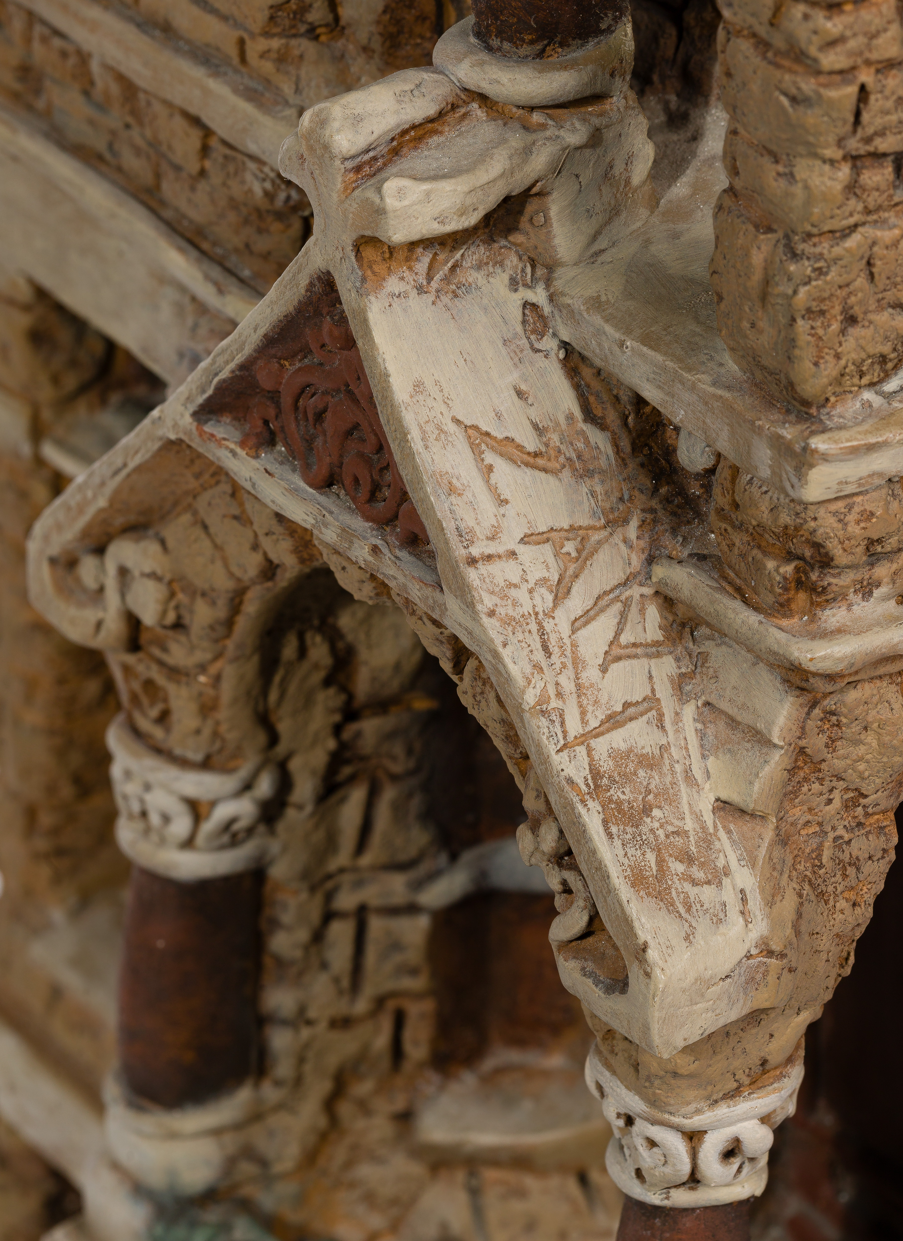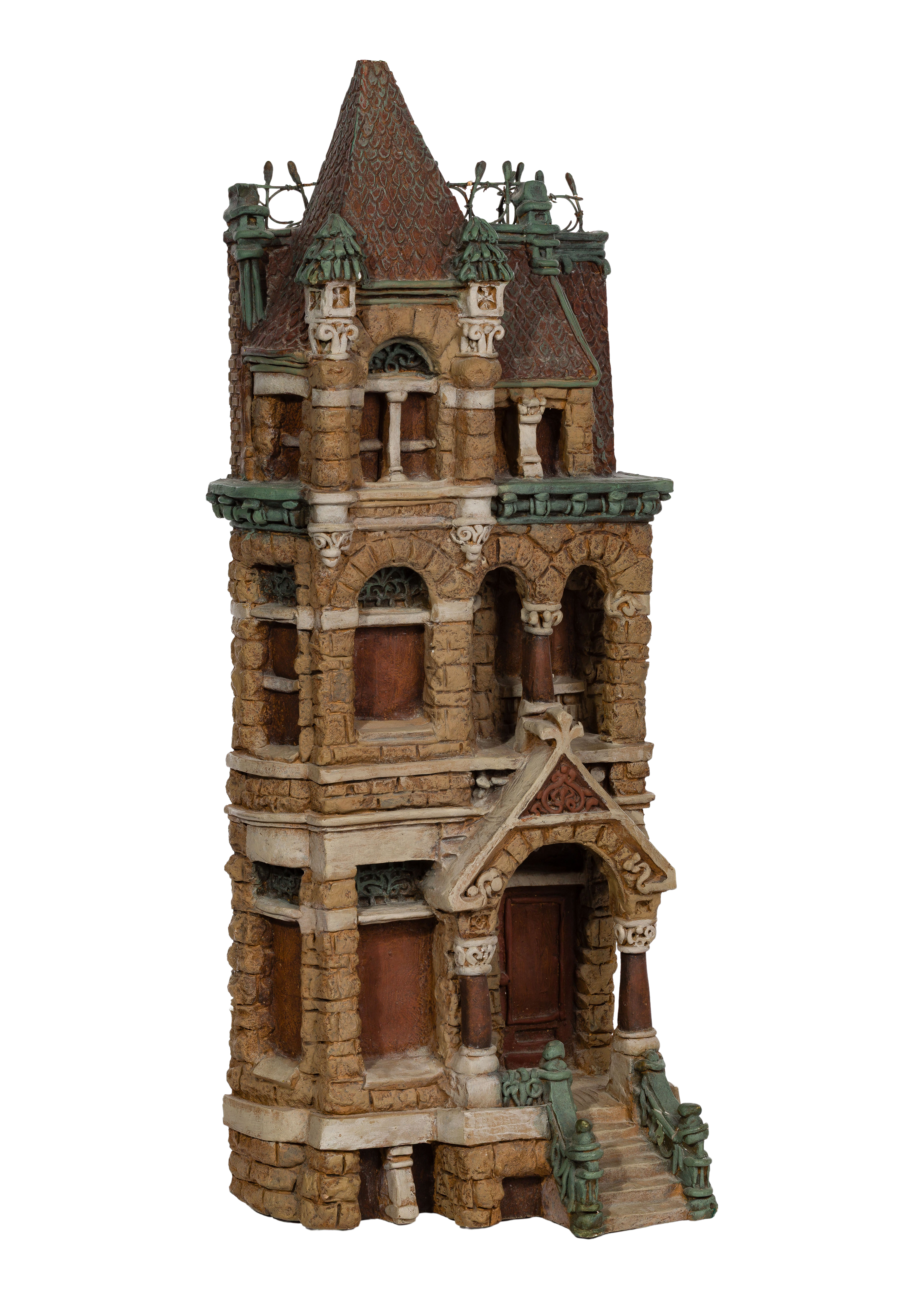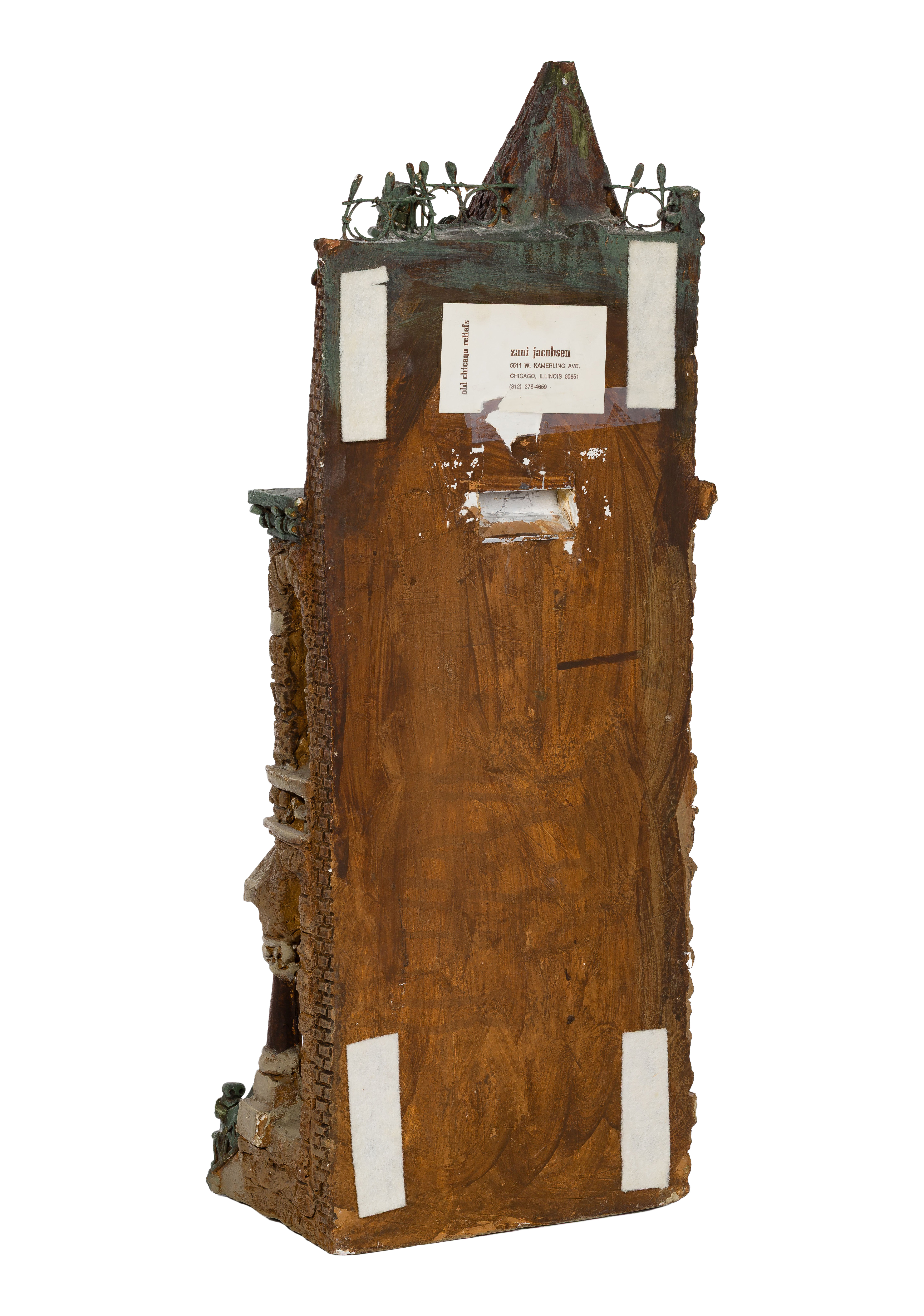 Undated, cast signature on roof over door, artist label verso, individually cast sculpture of 23 N. Goethe, Chicago having hand painted details, address above door and wall hanger