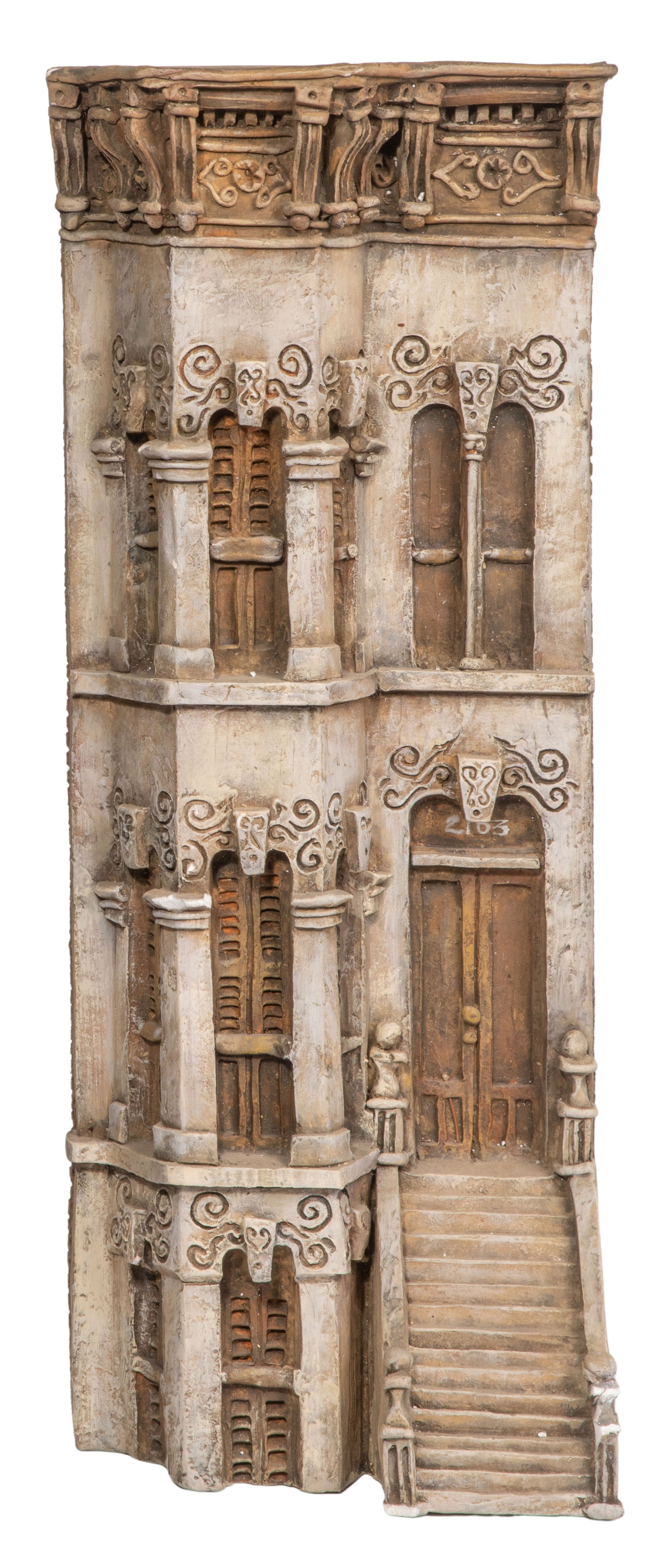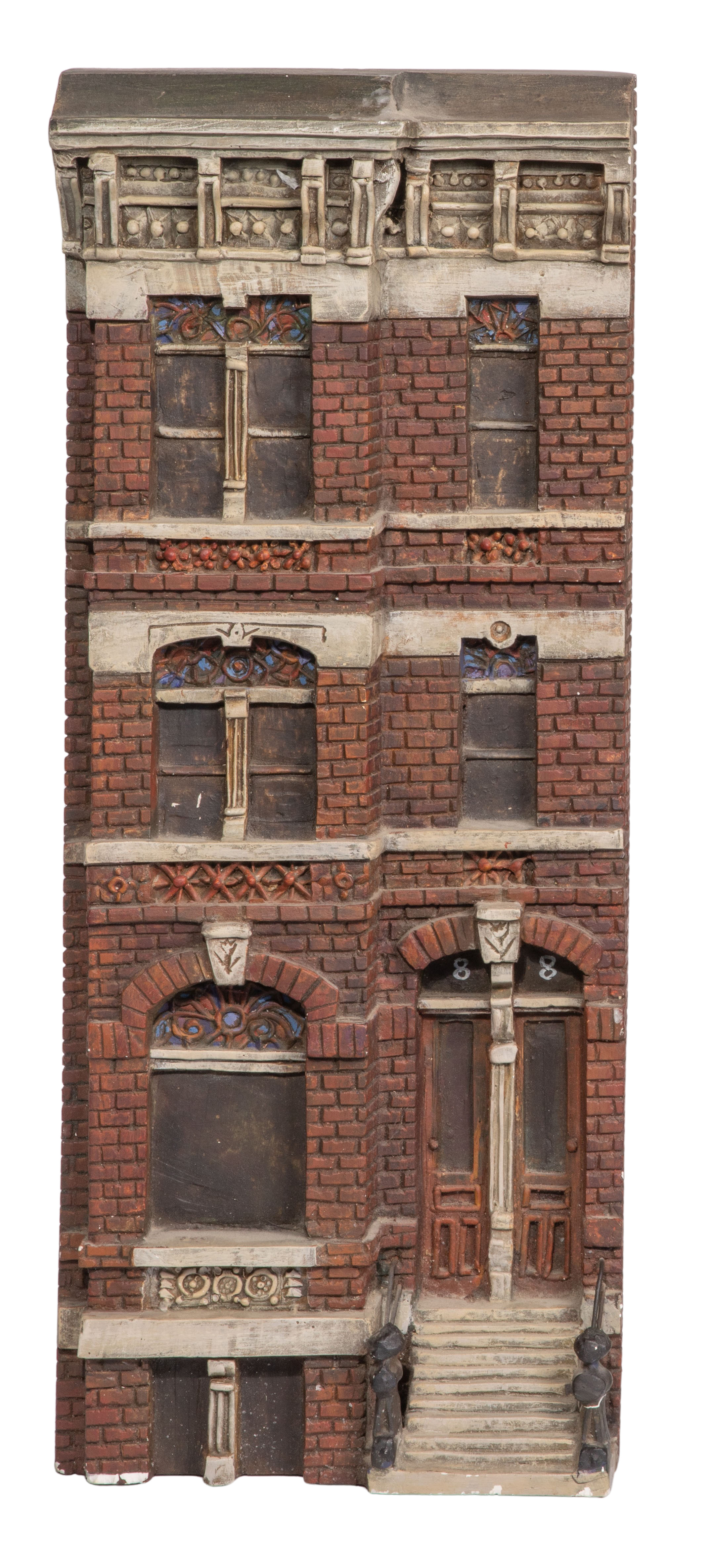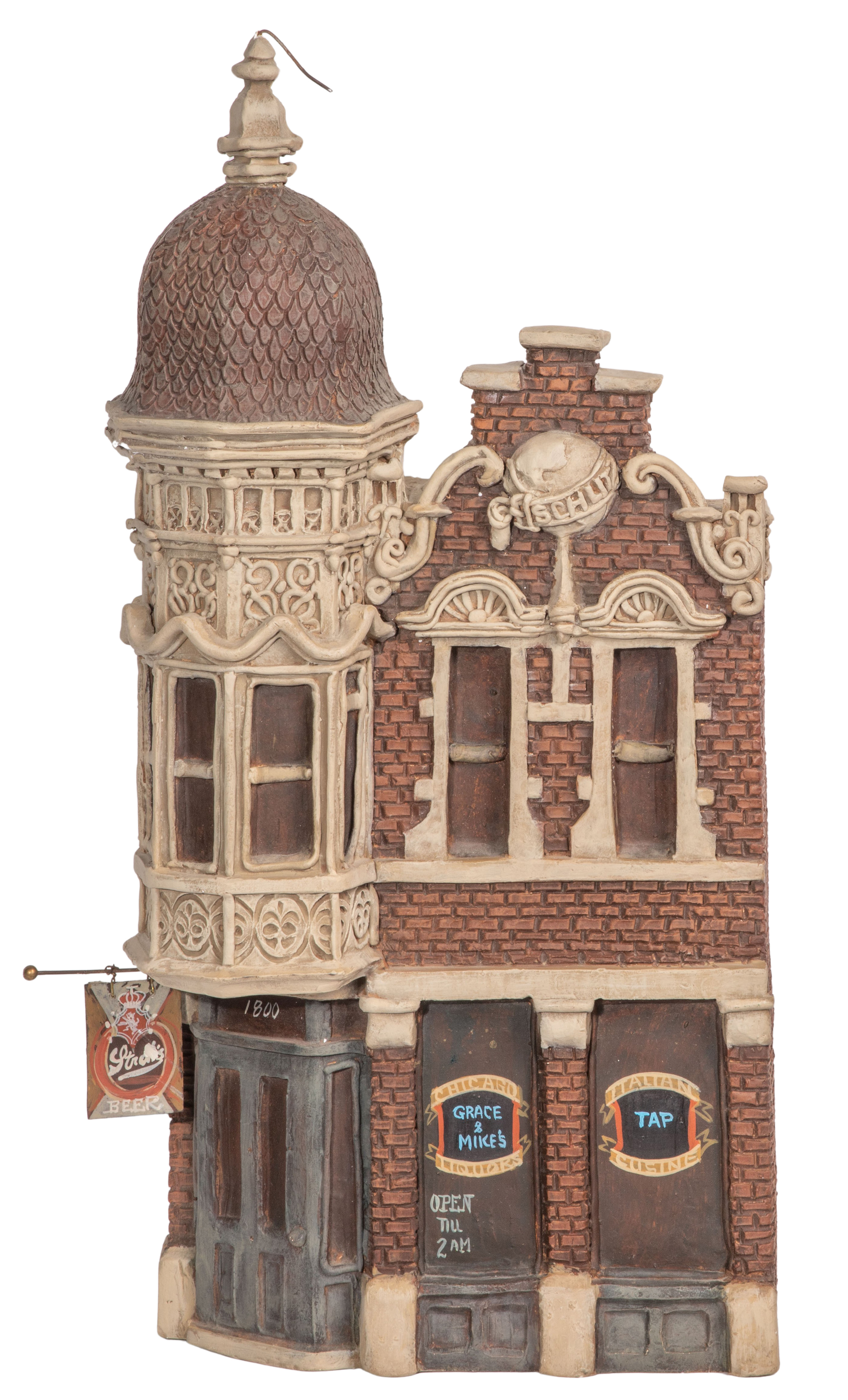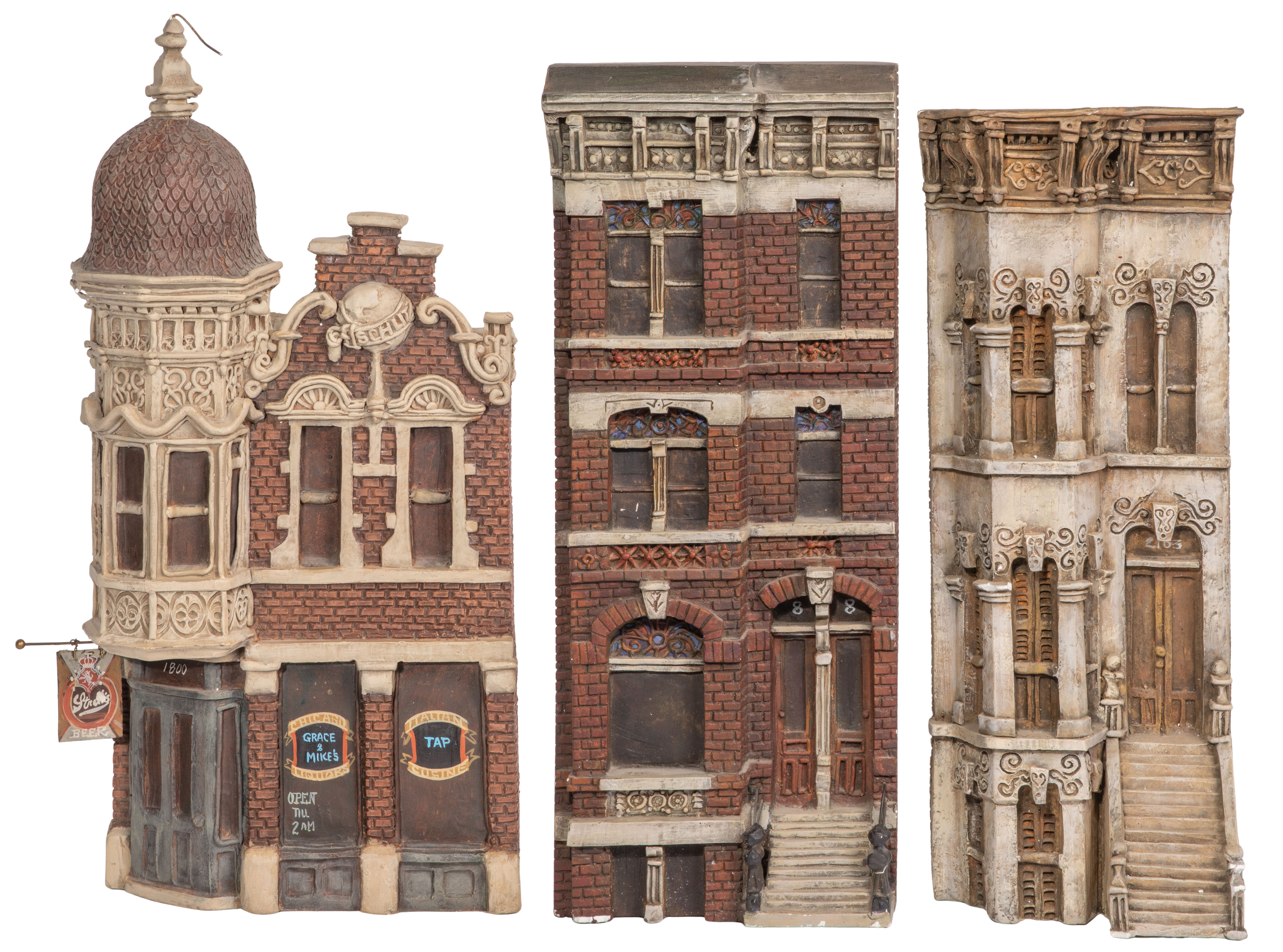 (3) items, hand cast and hand painted ceramic, including a Schlitz Tavern, 1989, cast signature on top, windows reading ‘Grace & Mike’s Tap’, the address over door reading ‘1800’, a brownstone having cast signature on top, address reading ’88’ and an Italianate limestone, cast signature on side of stairs, the address reading ‘2103’ but labeled ‘647 Armitage’ underside, all having artist label on backs