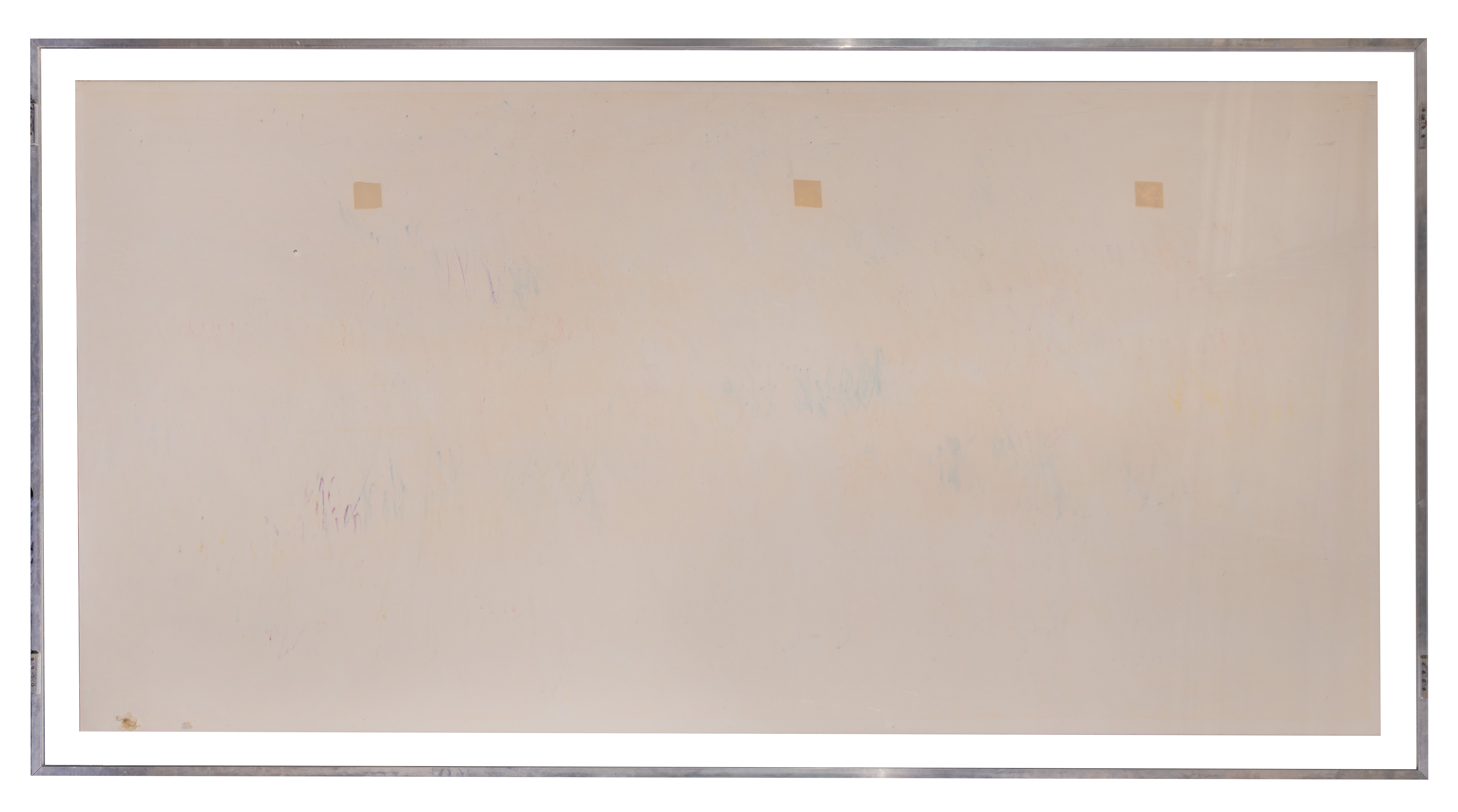 Condition: drawing cut unevenly, paper burns, repairs along bottom edge, a hole on bottom edge, frame having scratches to the metal and plexiglass
