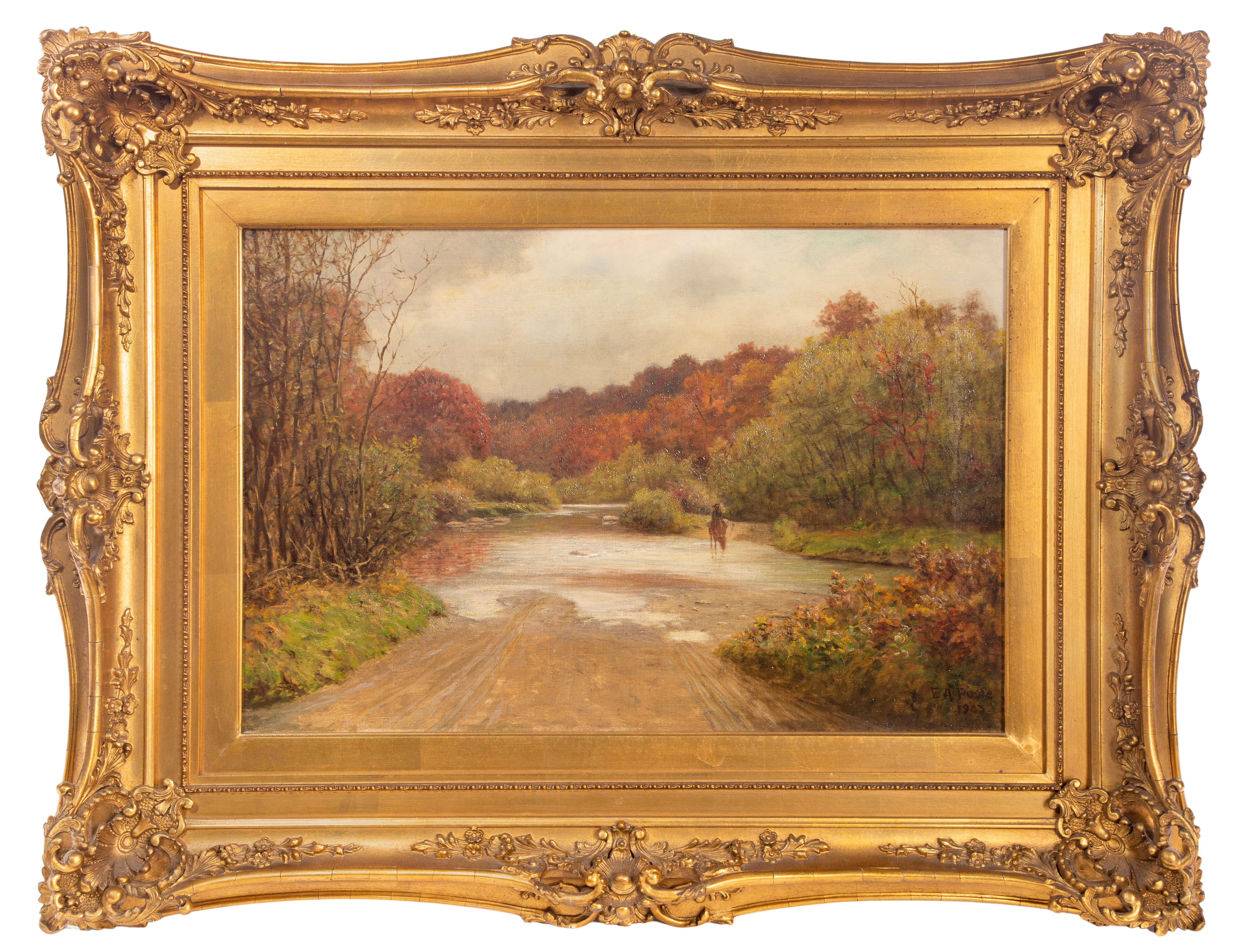 1903, signed lower right, depicting a forested trail and stream, in a gold-tone frame