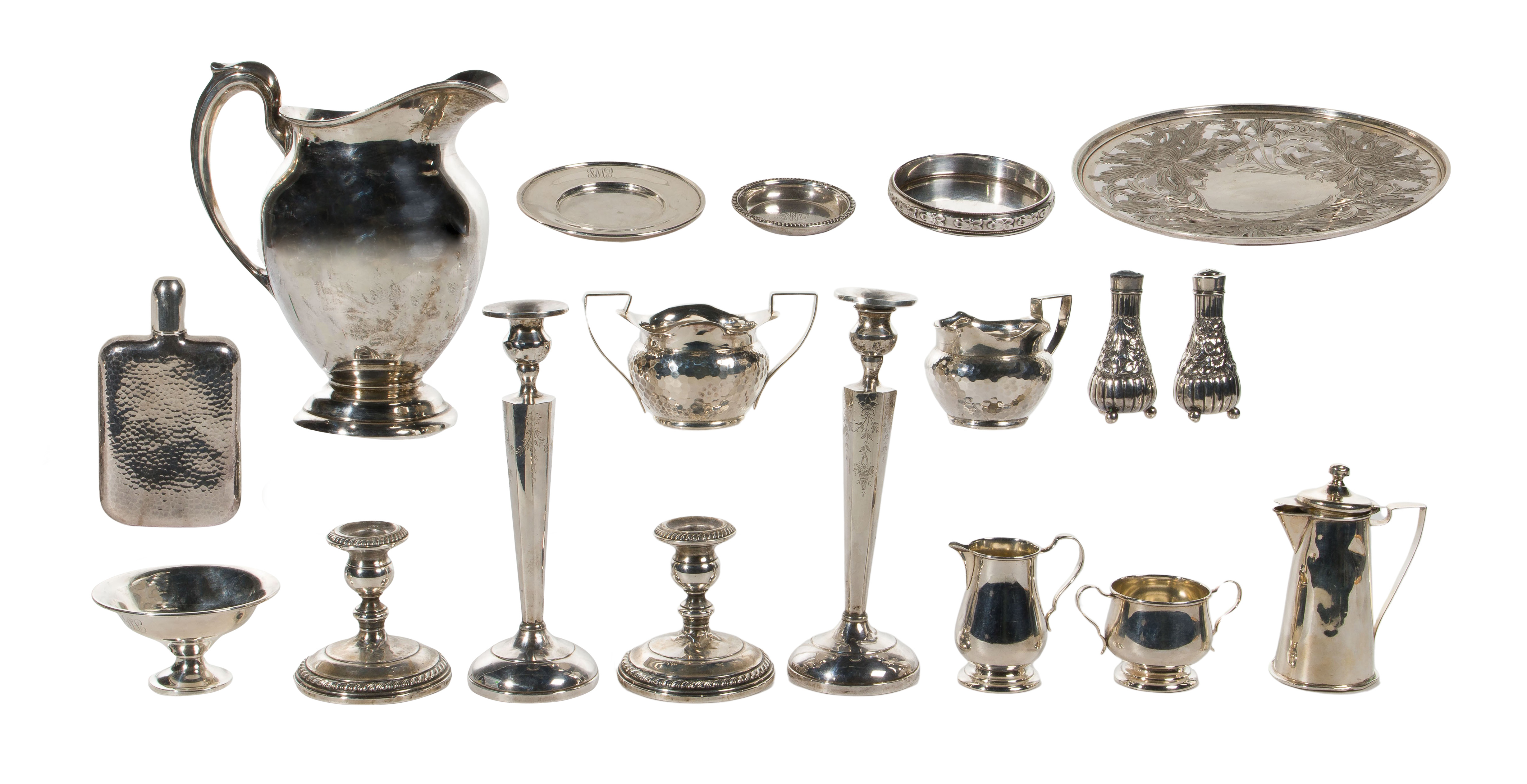 (18) items including a pitcher, (2) sugar and creamer sets, a pair of salt and pepper shakers, (2) pairs of candlesticks, (3) plates, a compote, a flask, a miniature lidded pitcher and a wine bottle coaster (most marked ‘925’ / ‘sterling’)
