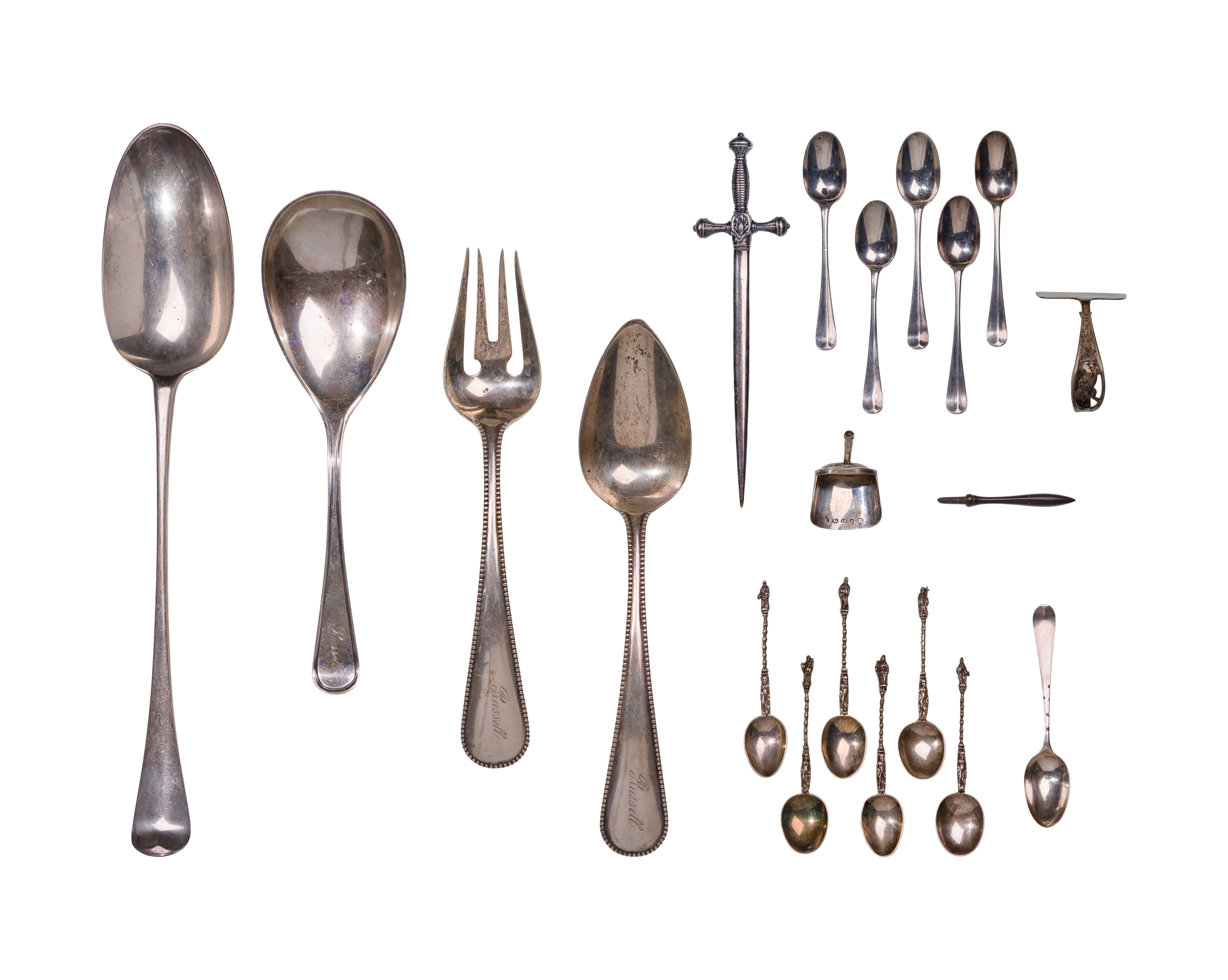 (19) items including (14) British utensils, a British sword, a Little Boy Blue child utensil and (3) Dutch silver serving utensils (most marked with left facing or right facing lion passant mark)