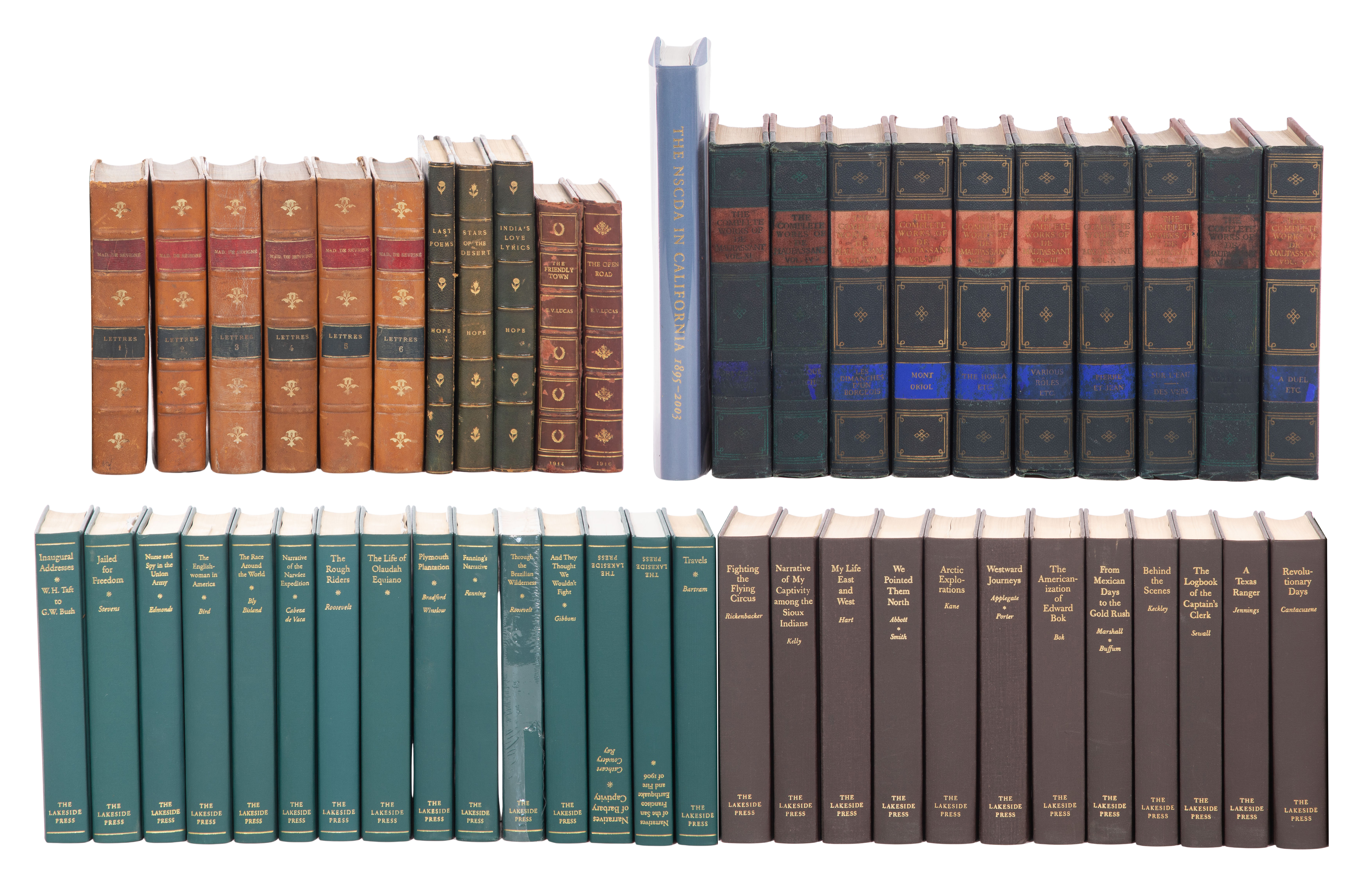 (49) items in various sizes and subject matter, from ‘Lettres’, Lakeside Classics and ‘The Works of De Moupassant’ as well as others, some having cloth end boards, some having half calf and cloth