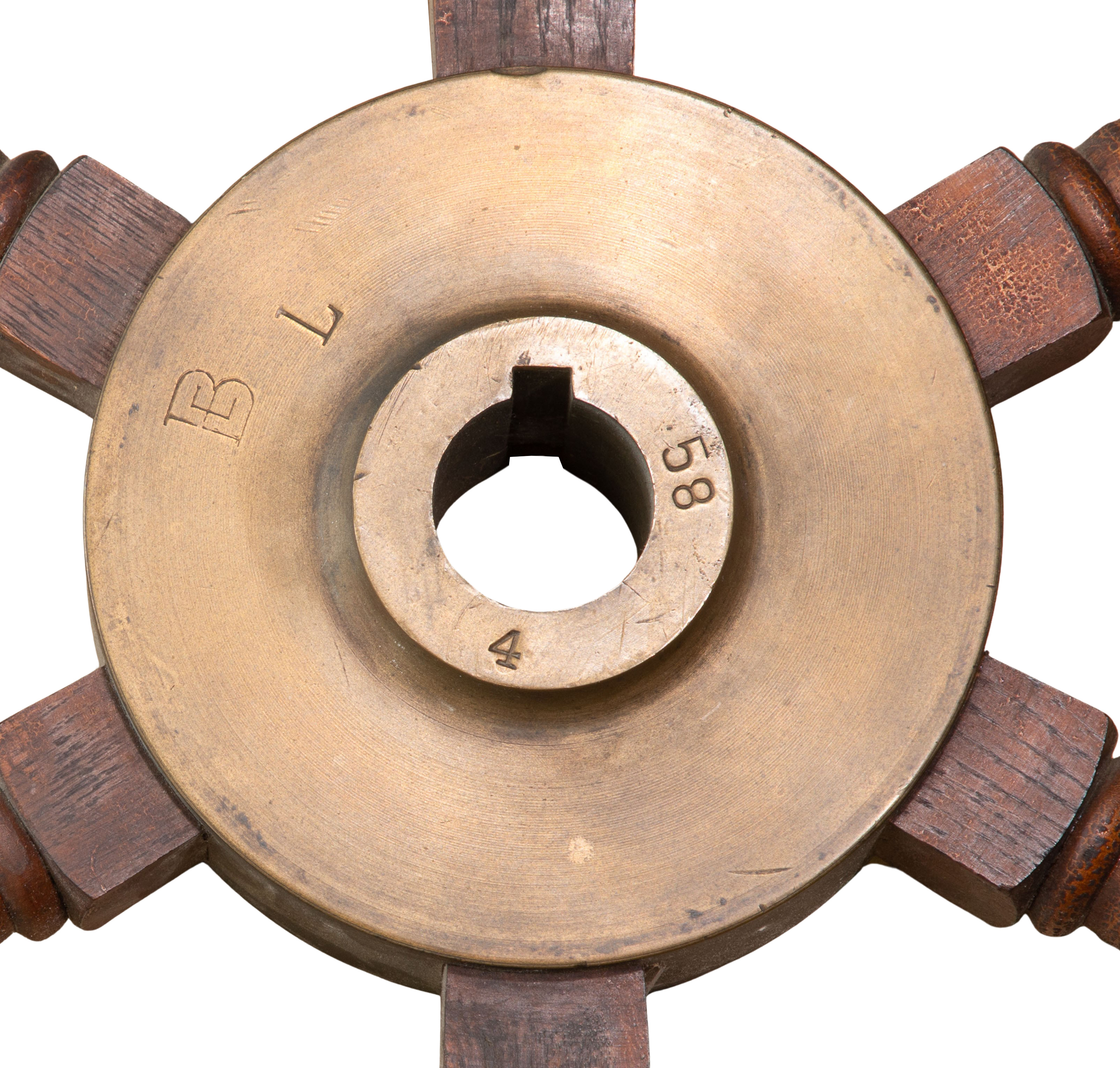 Having a wood body with six spokes and brass center hub, maker label applied to wood body