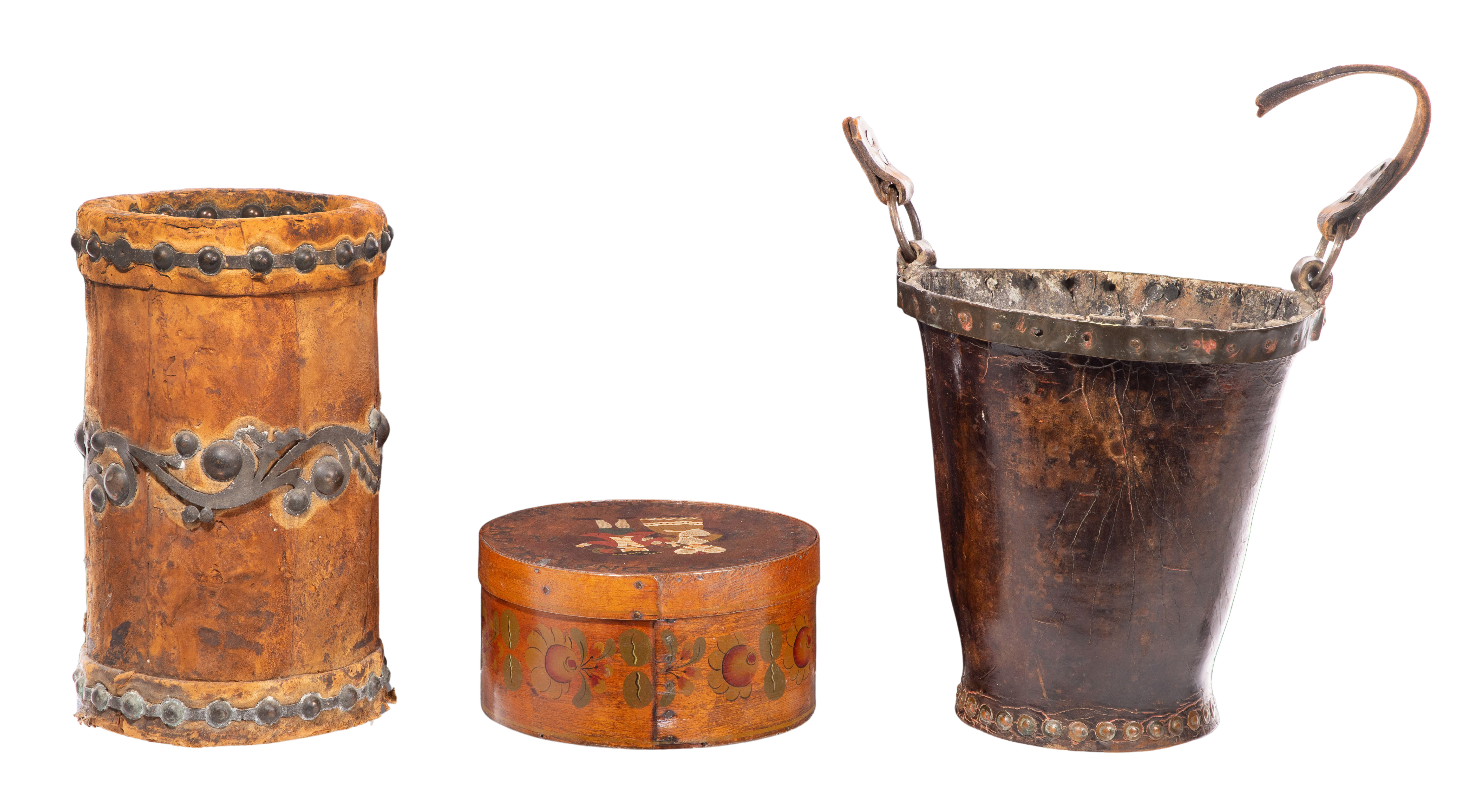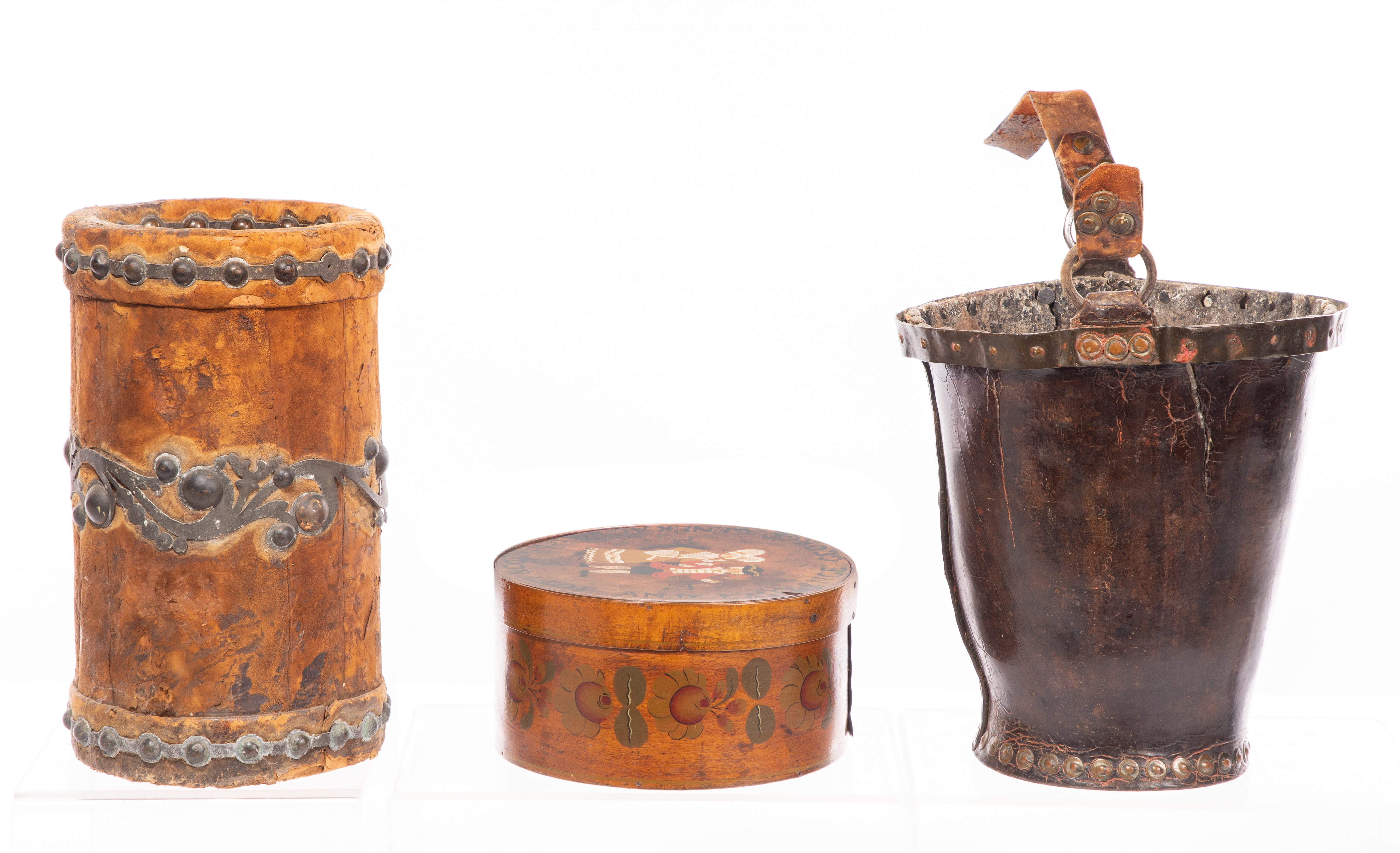 (3) total items including a thick gauge leather formed into a bucket having iron stud rivets and strap handle; together with an umbrella stand / grain measure having a leather skin over wood with brass accents and a reproduction of a hand painted Pennsylvania Dutch box, annotation on underside ‘Jean Layland 1975’