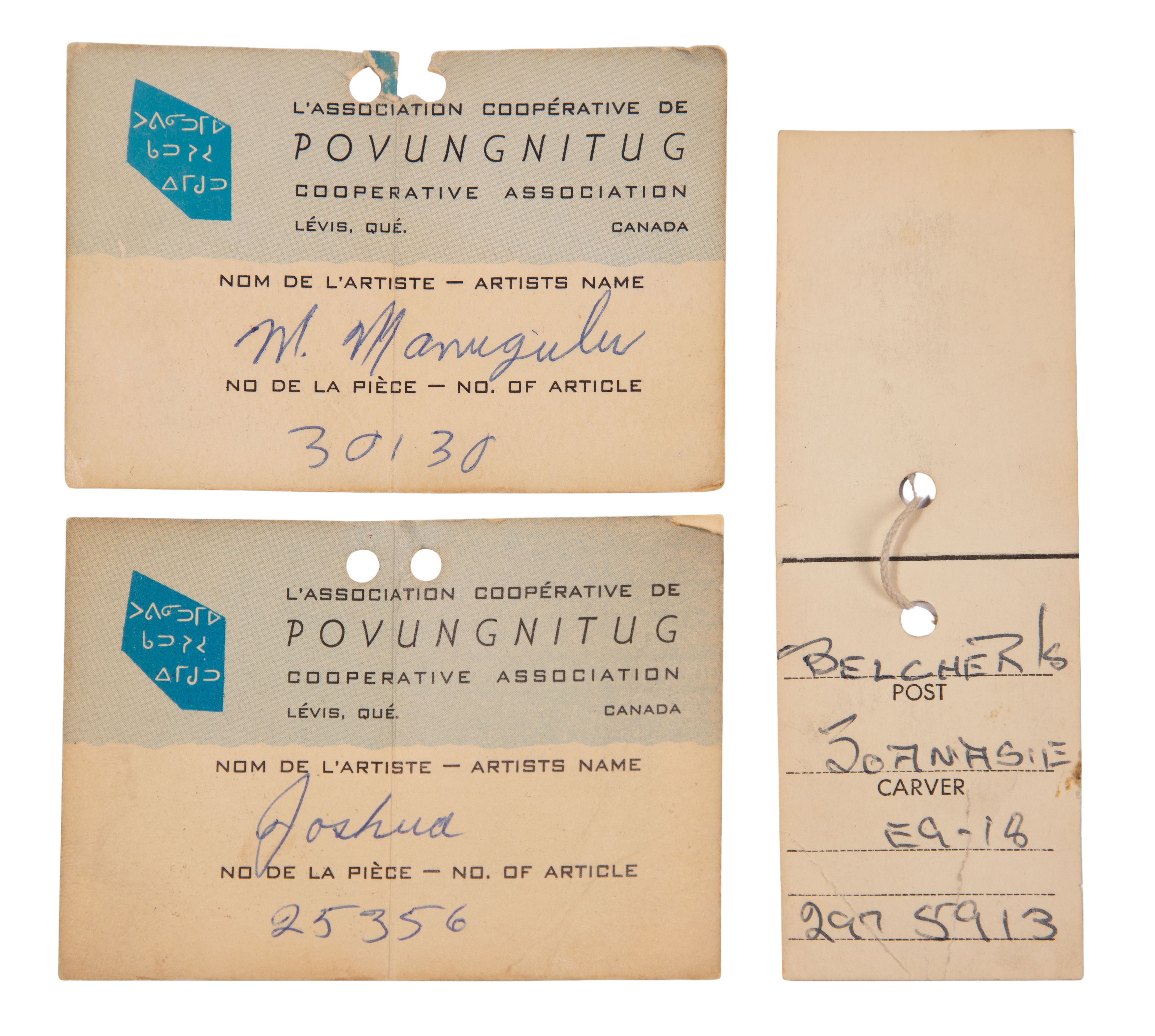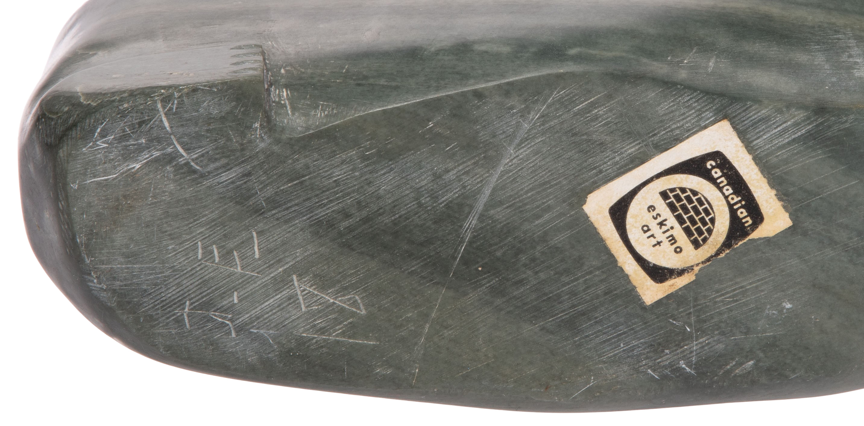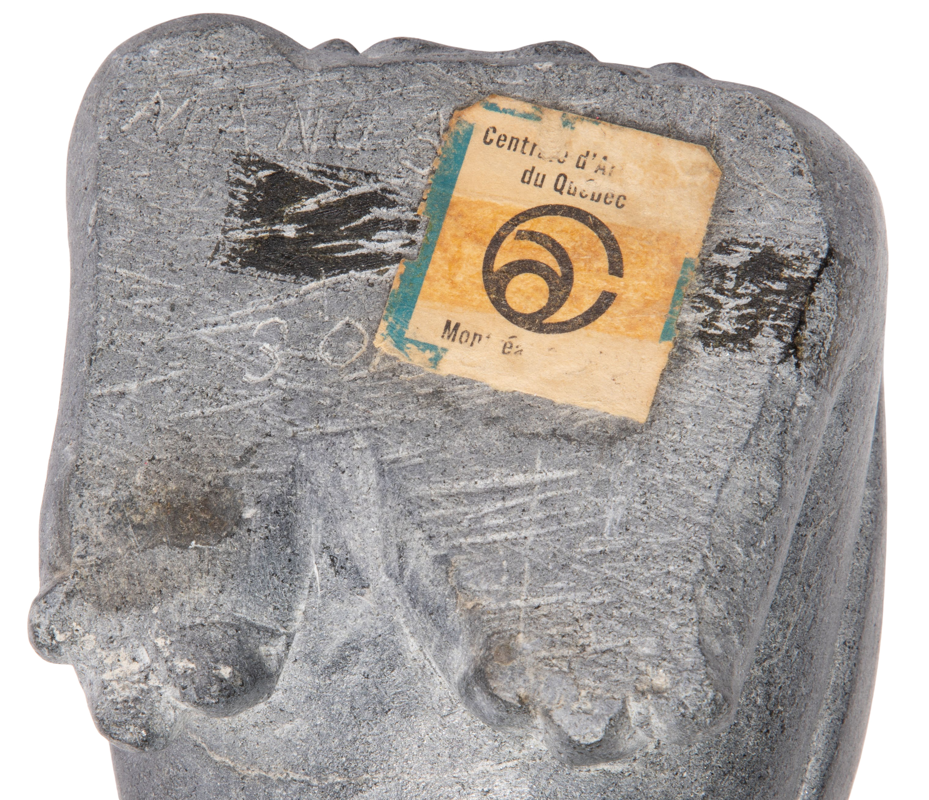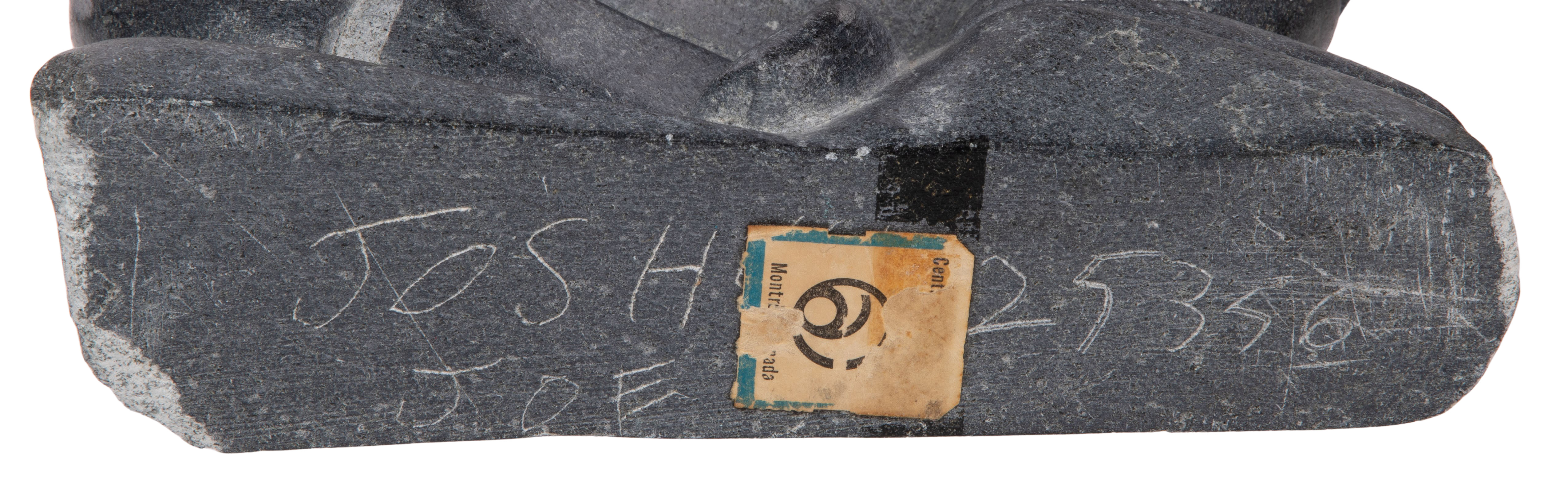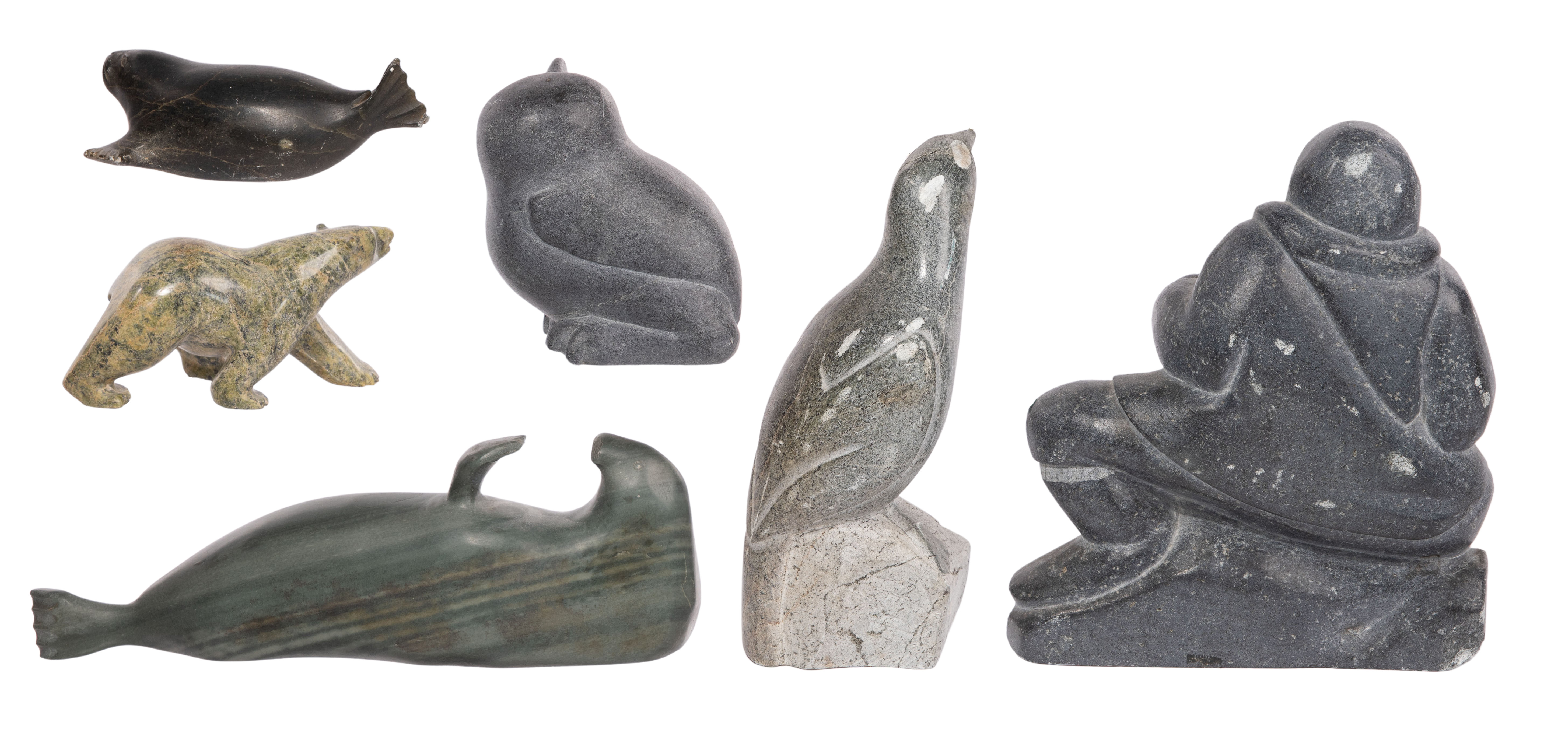 (6) items including a penguin signed ‘M. Manugulu’, an Inuit figure signed ‘Joshua’, a bird, (2) seals, all having markings and an unmarked bear, some retaining original tags and Art Canada labels