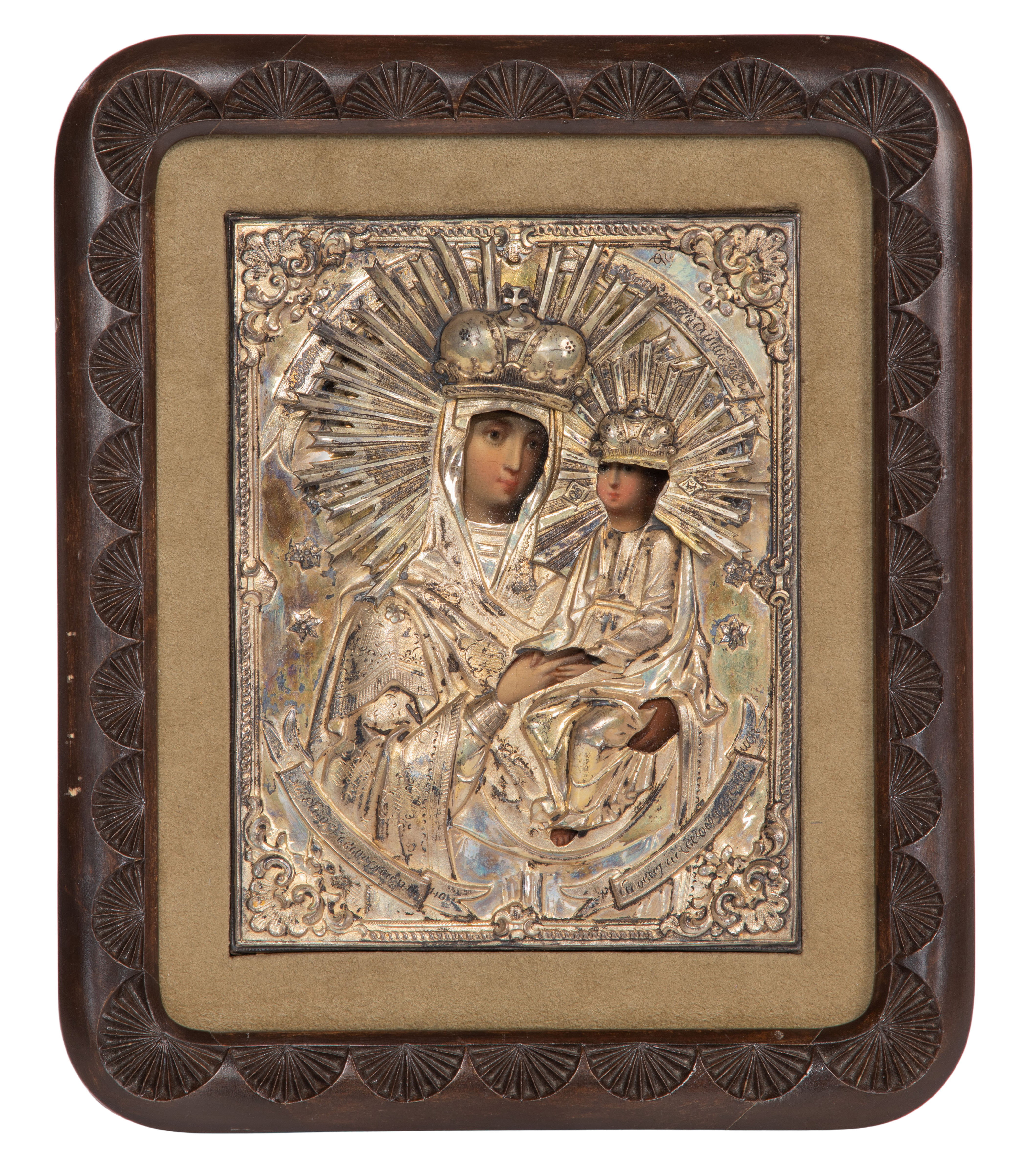 c.1840, oil on wood having an engraved silver oklad, dated and marked lower fold ‘840’, initials ‘H. M.’ and ‘A. K.’, in a wood frame